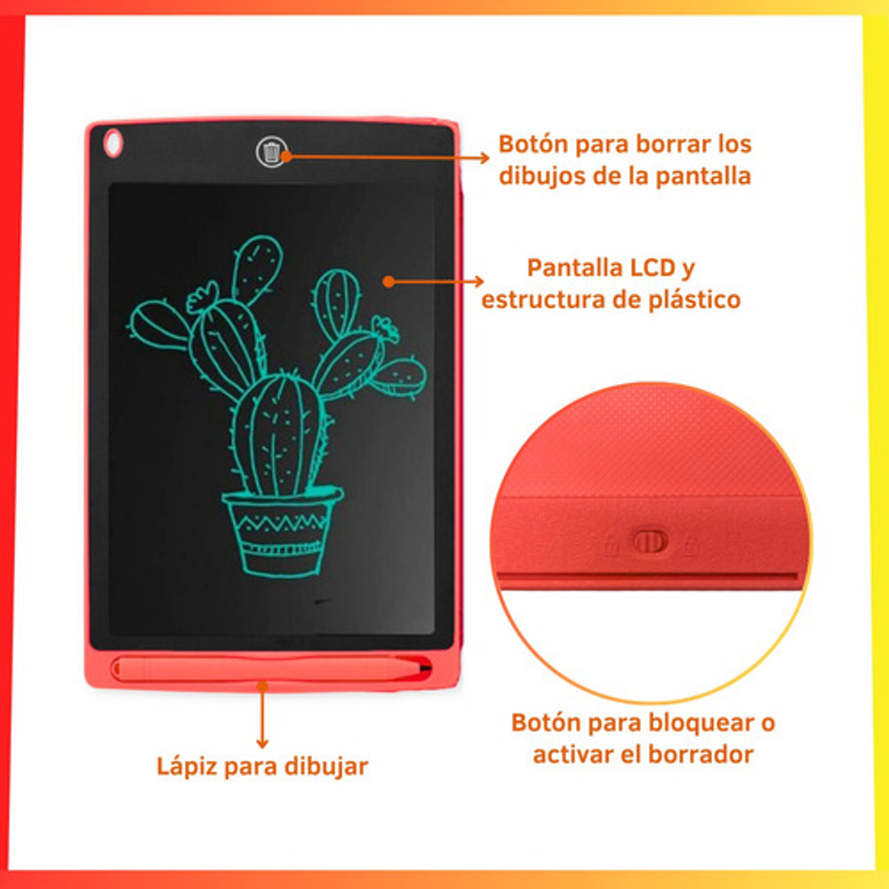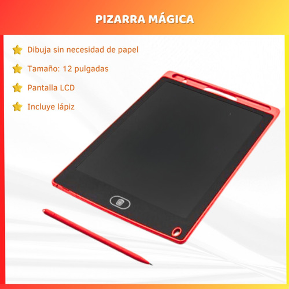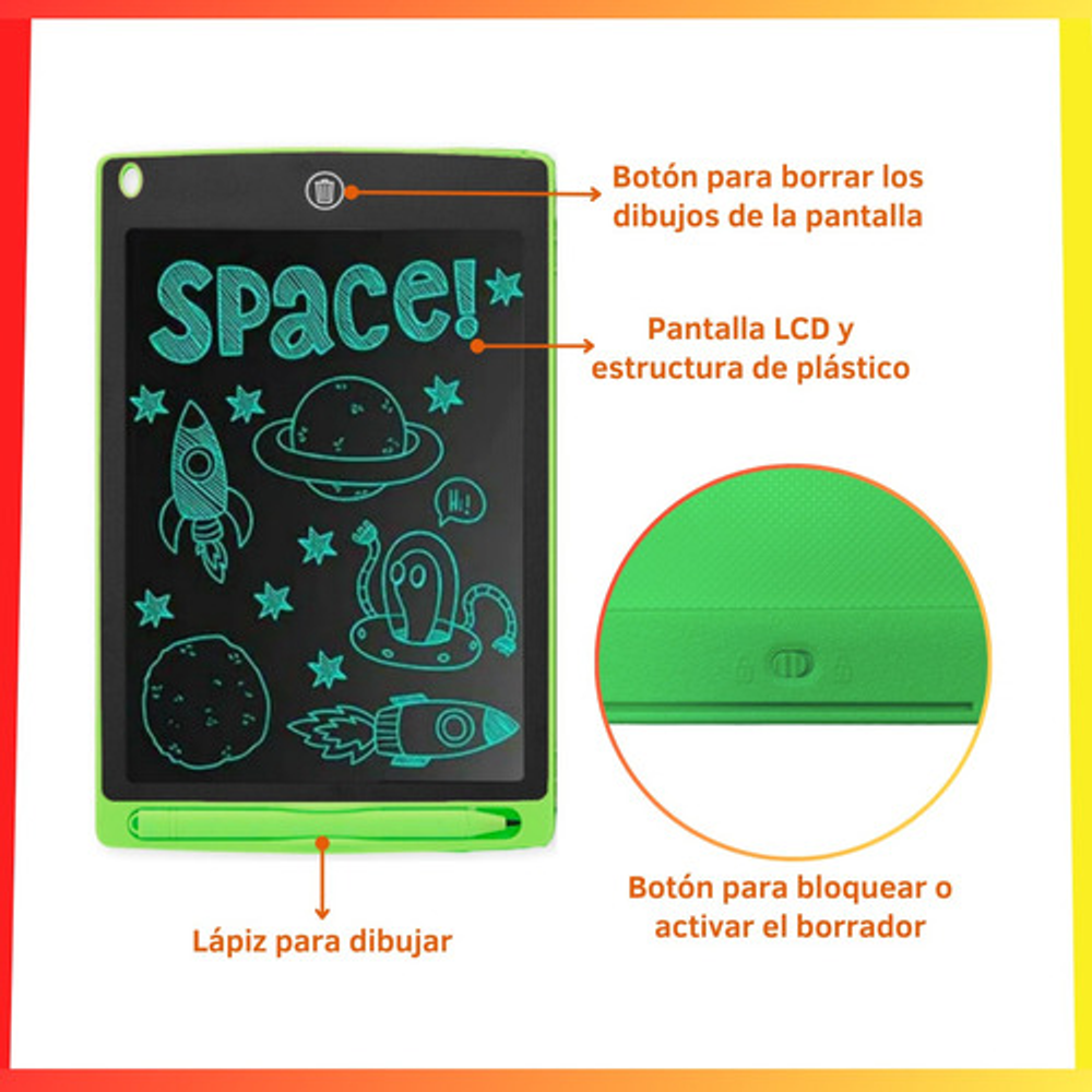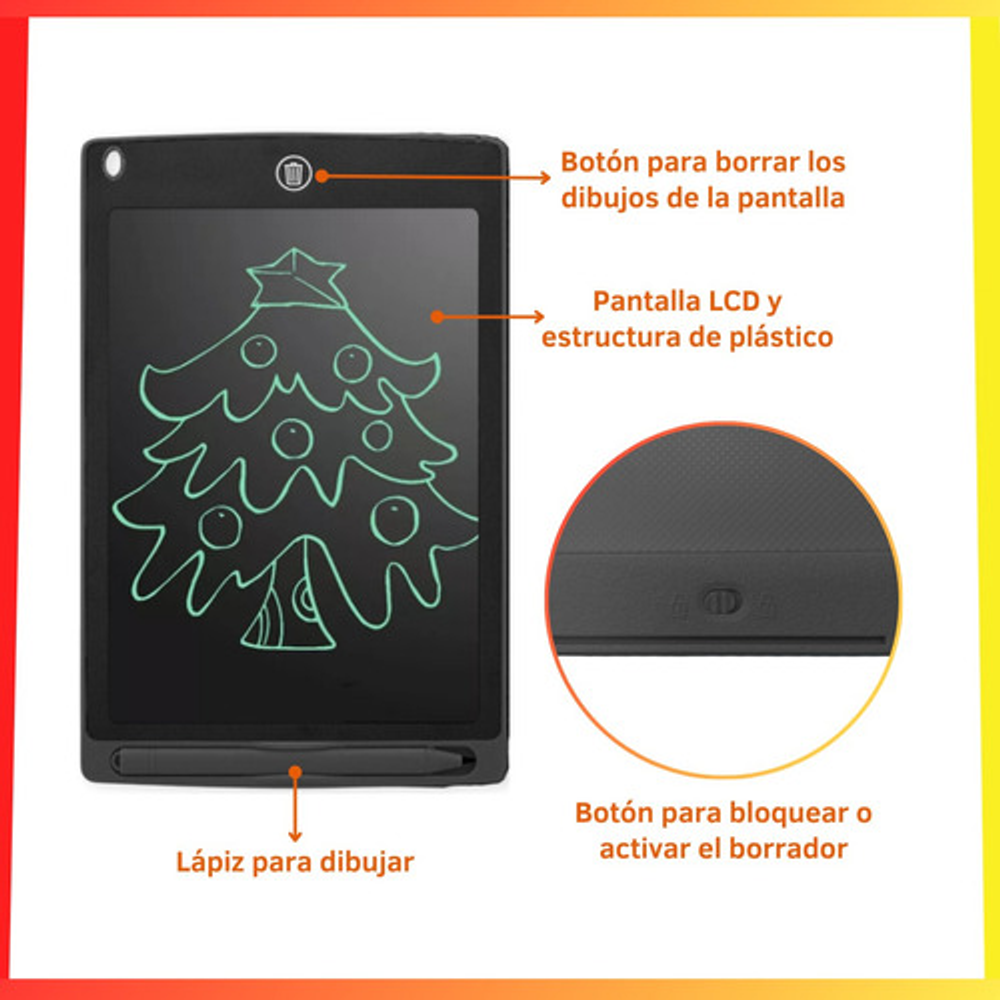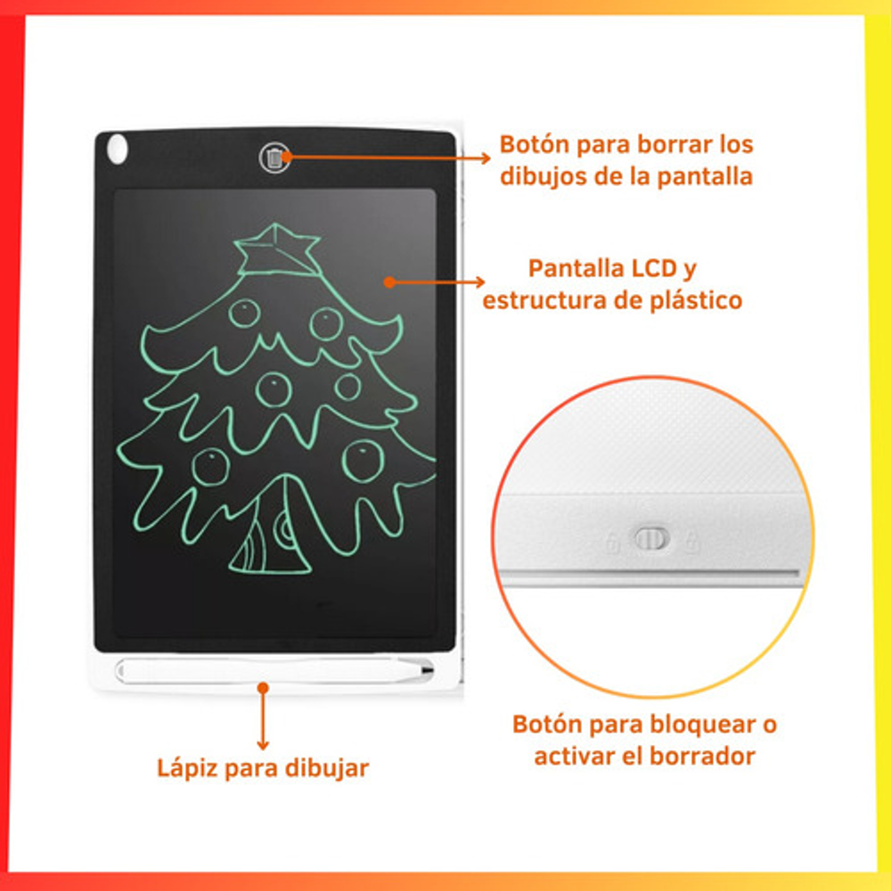 Características: • Fabricada en plástico • Pantalla LCD • Incluye lápiz para dibujar • También se puede dibujar con el dedo • Tamaño de la tableta completa: 12 pulgadas • Tamaño de la pantalla: 16.5 x 23.5 cm • Funciona con 1 pila CR2025 3V (incluida)