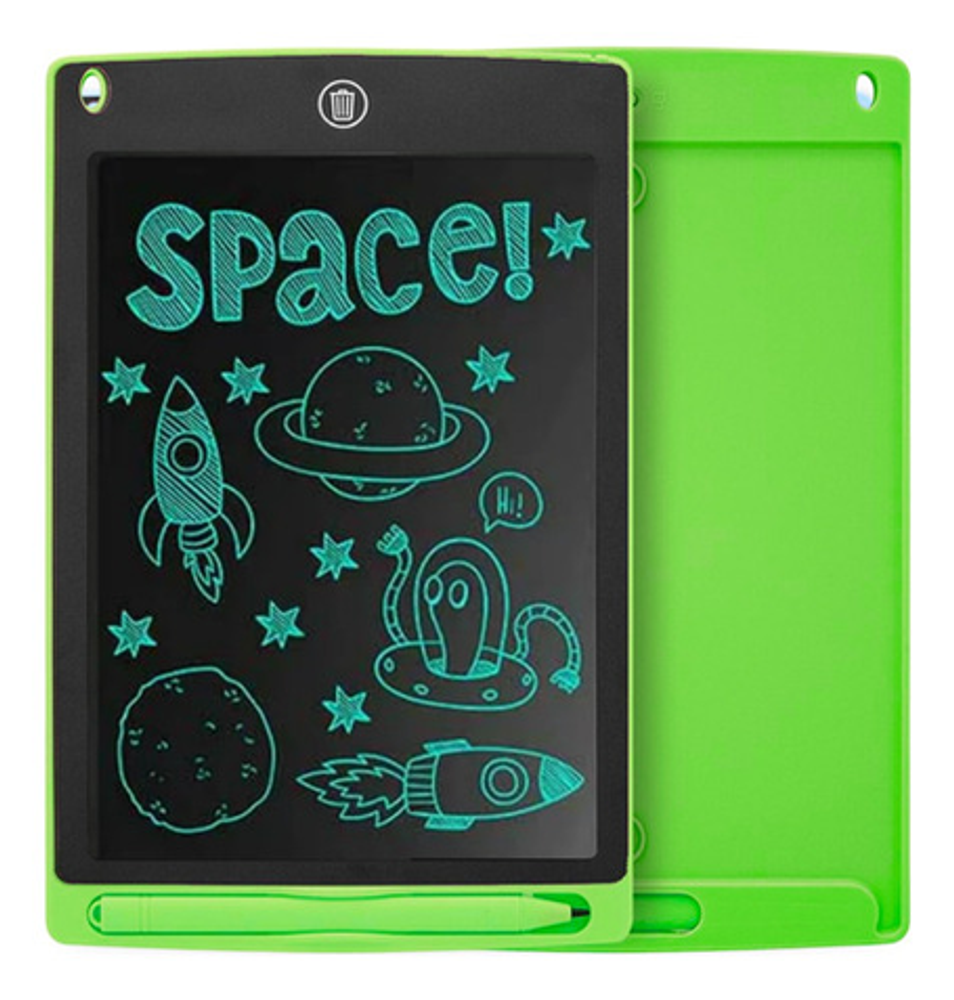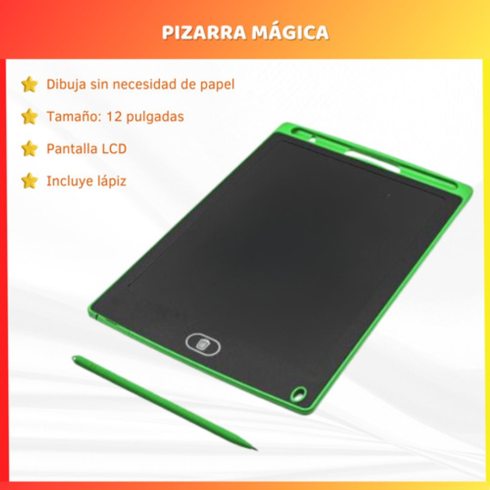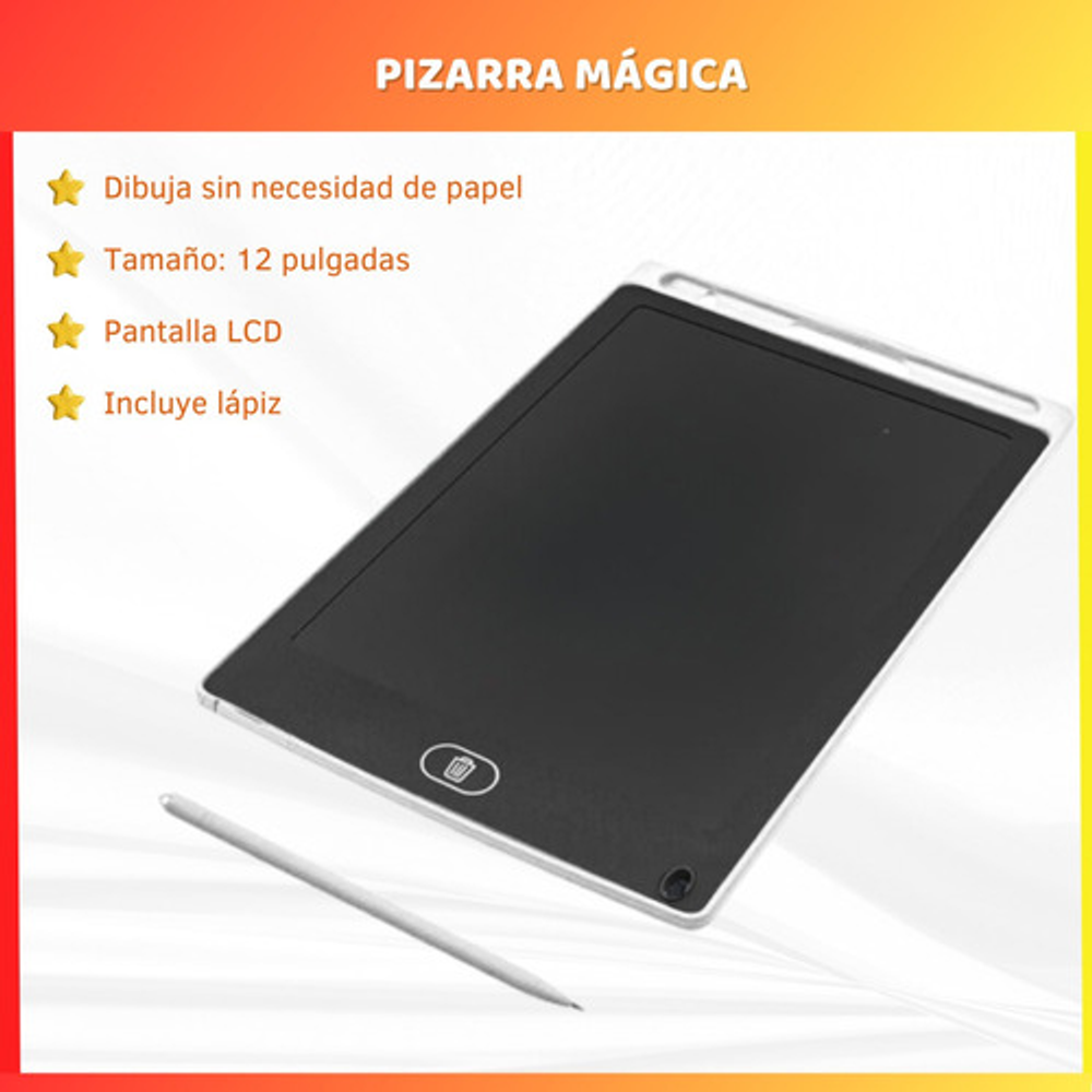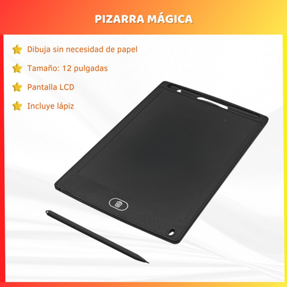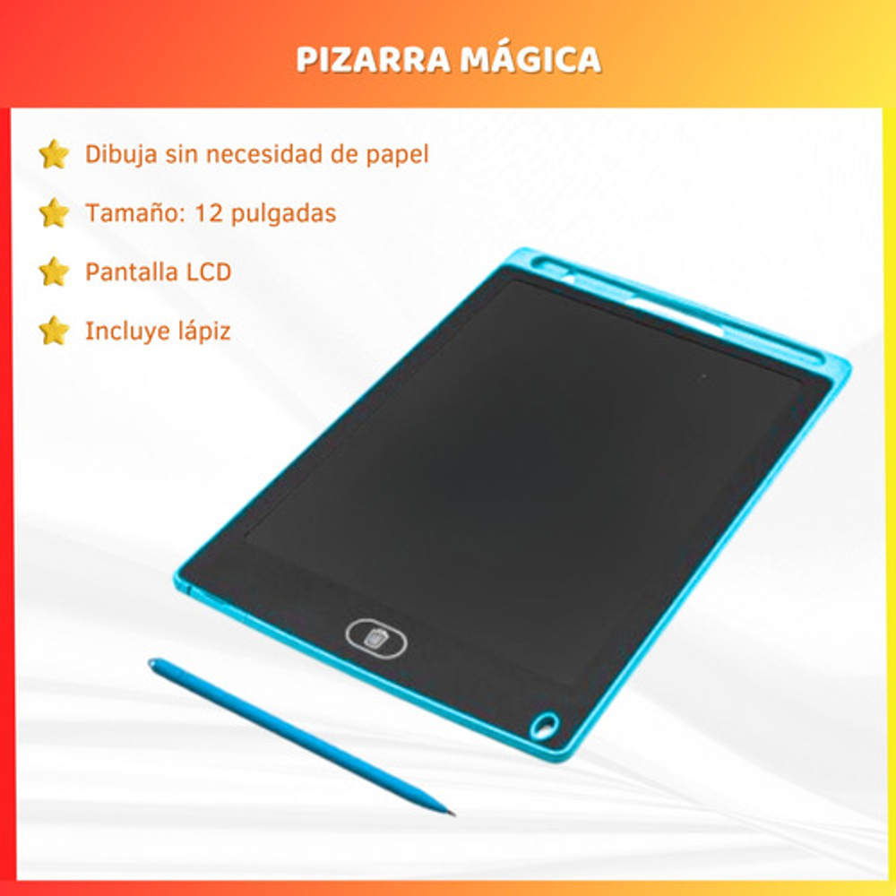 Características: • Fabricada en plástico • Pantalla LCD • Incluye lápiz para dibujar • También se puede dibujar con el dedo • Tamaño de la tableta completa: 12 pulgadas • Tamaño de la pantalla: 16.5 x 23.5 cm • Funciona con 1 pila CR2025 3V (incluida)
