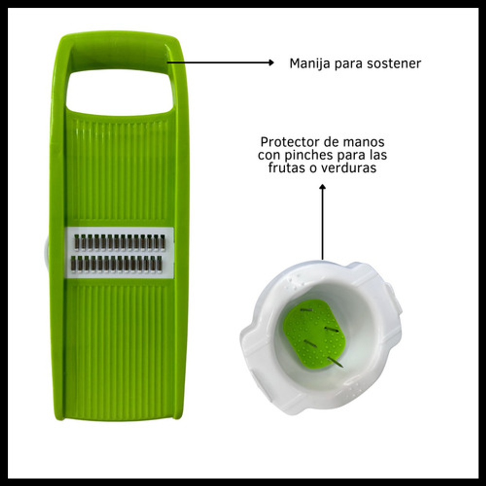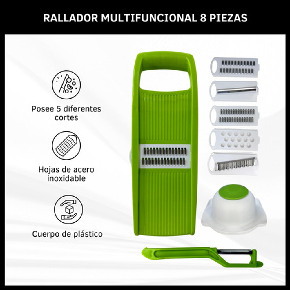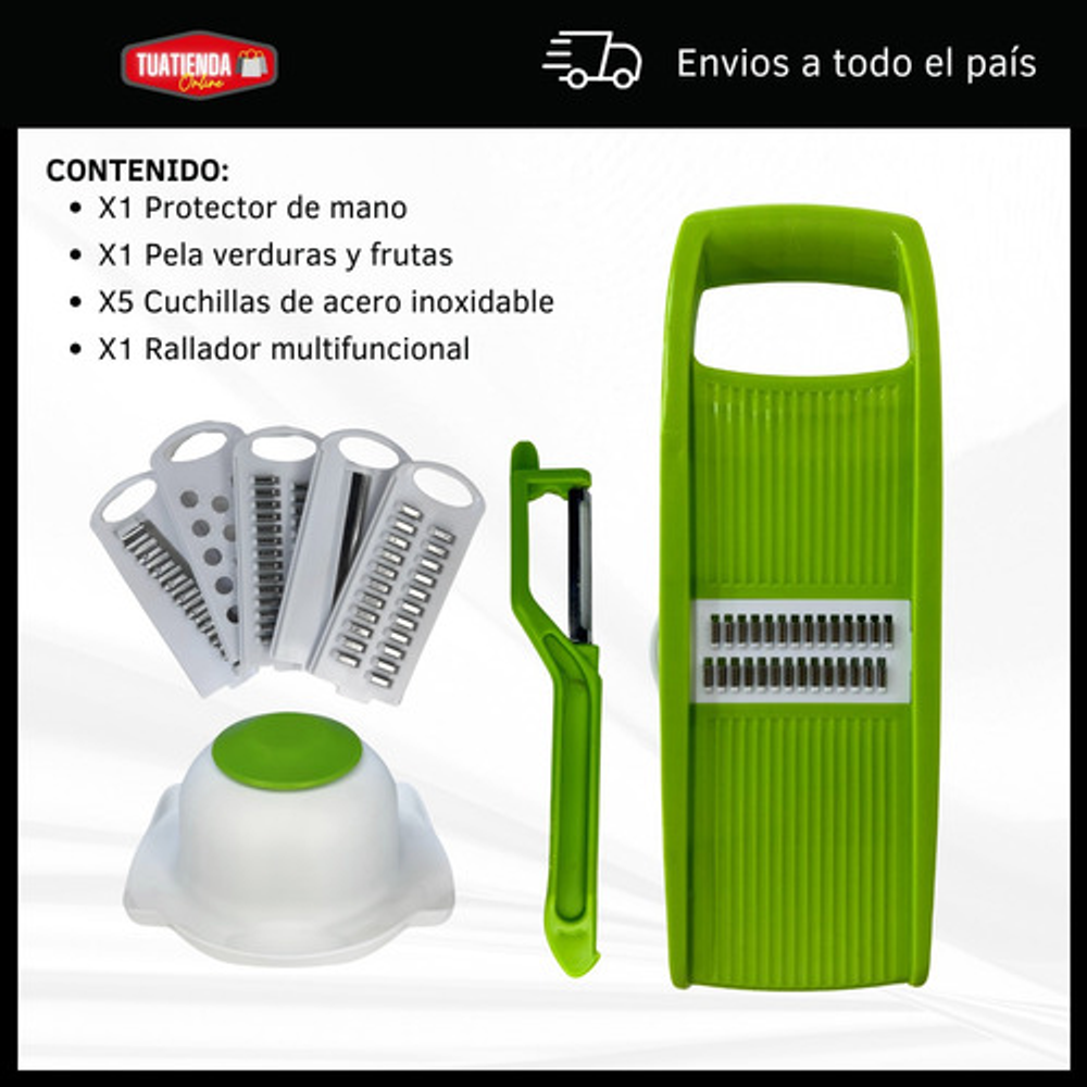 Incluye: -X1 Protector de mano -X1 Pela verduras y frutas -X5 Cuchillas de acero inoxidable -X1 Rallador multifuncional