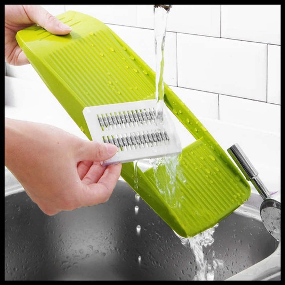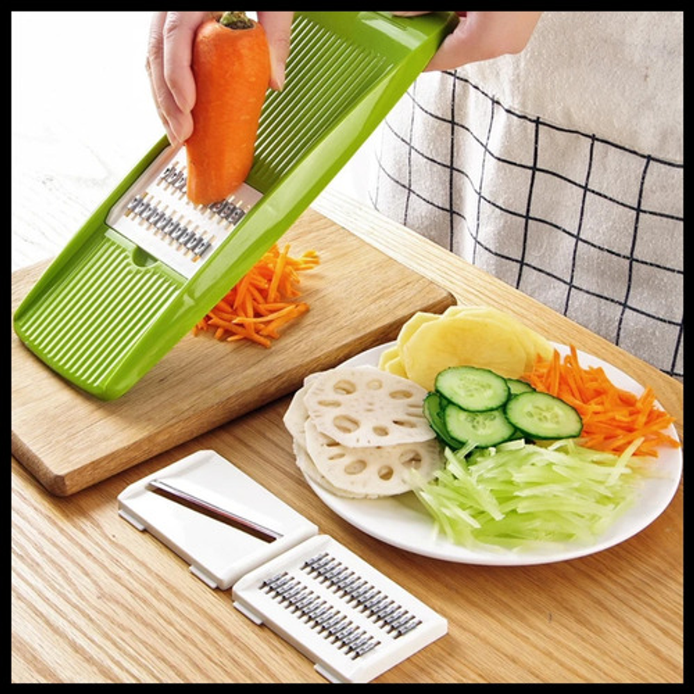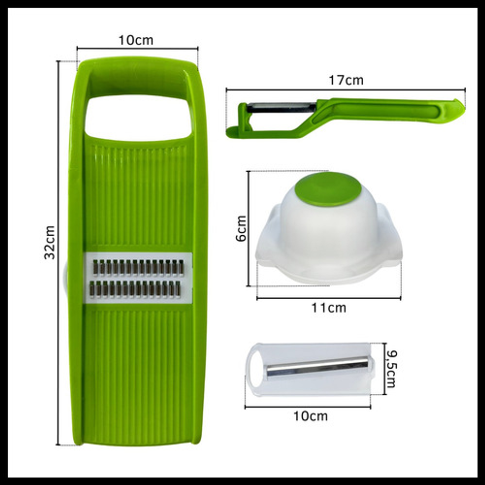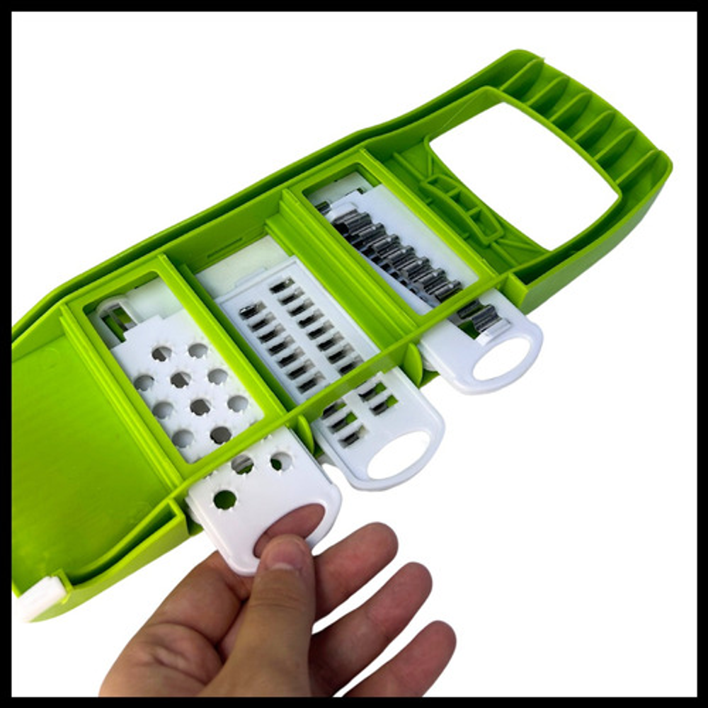 Incluye: -X1 Protector de mano -X1 Pela verduras y frutas -X5 Cuchillas de acero inoxidable -X1 Rallador multifuncional