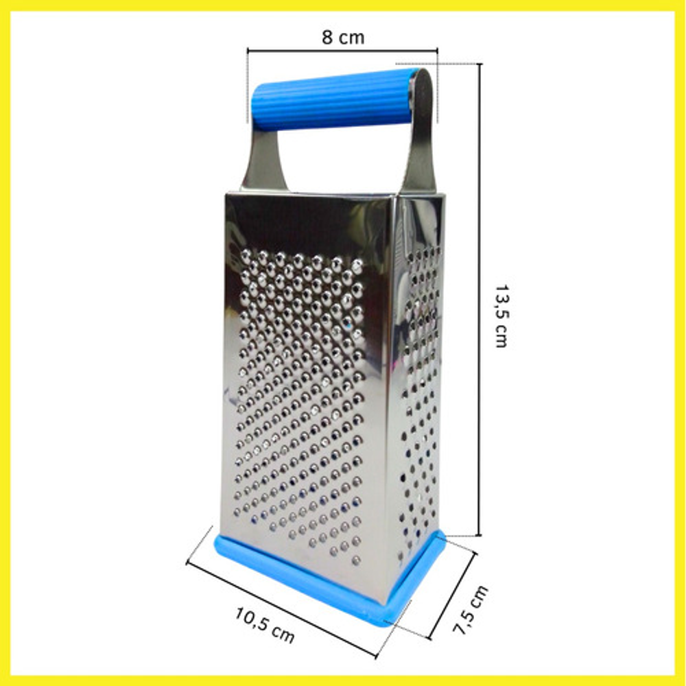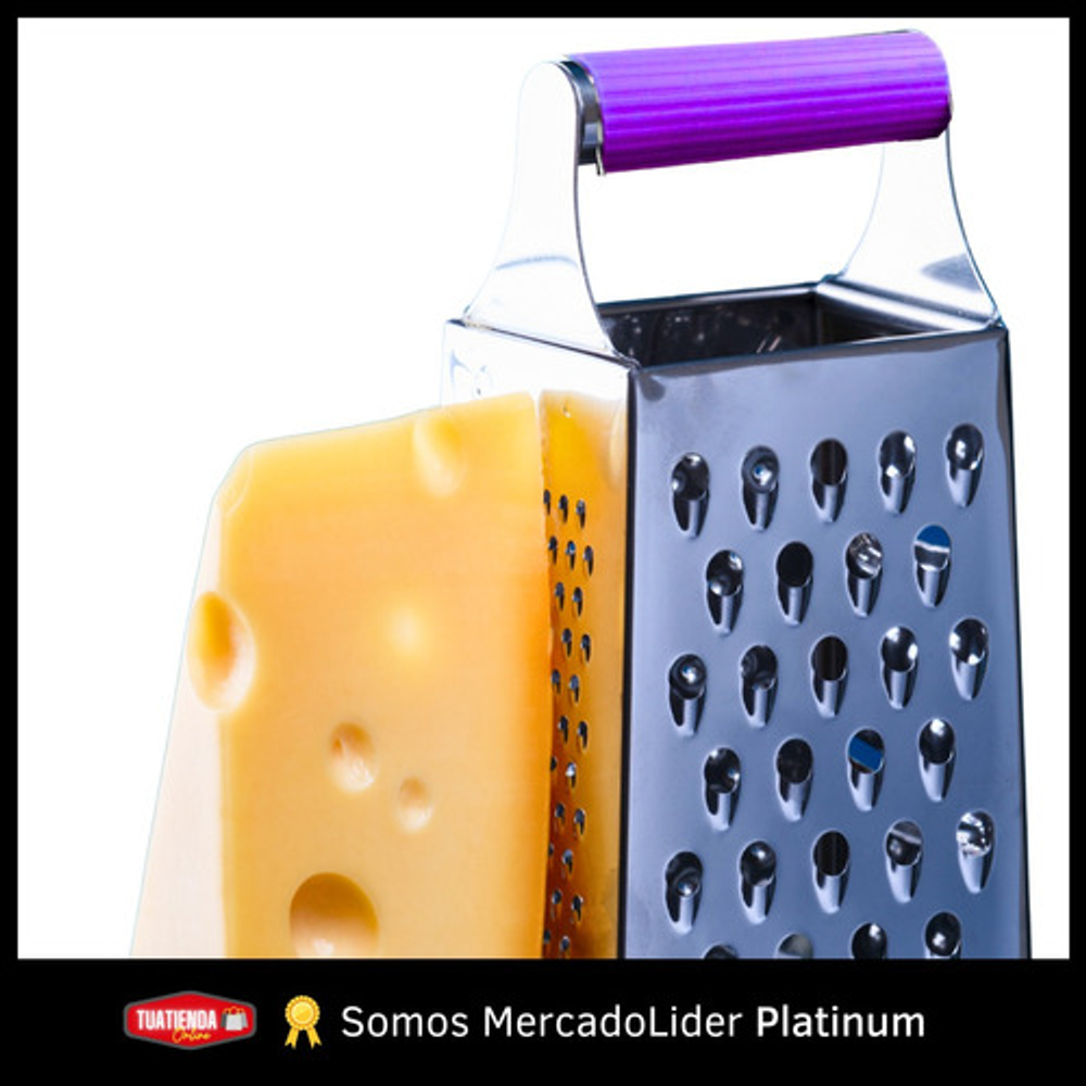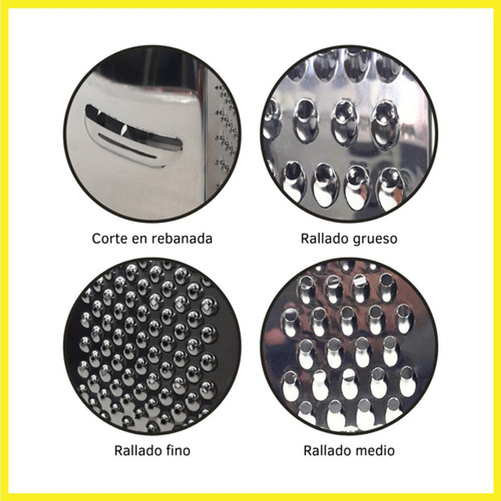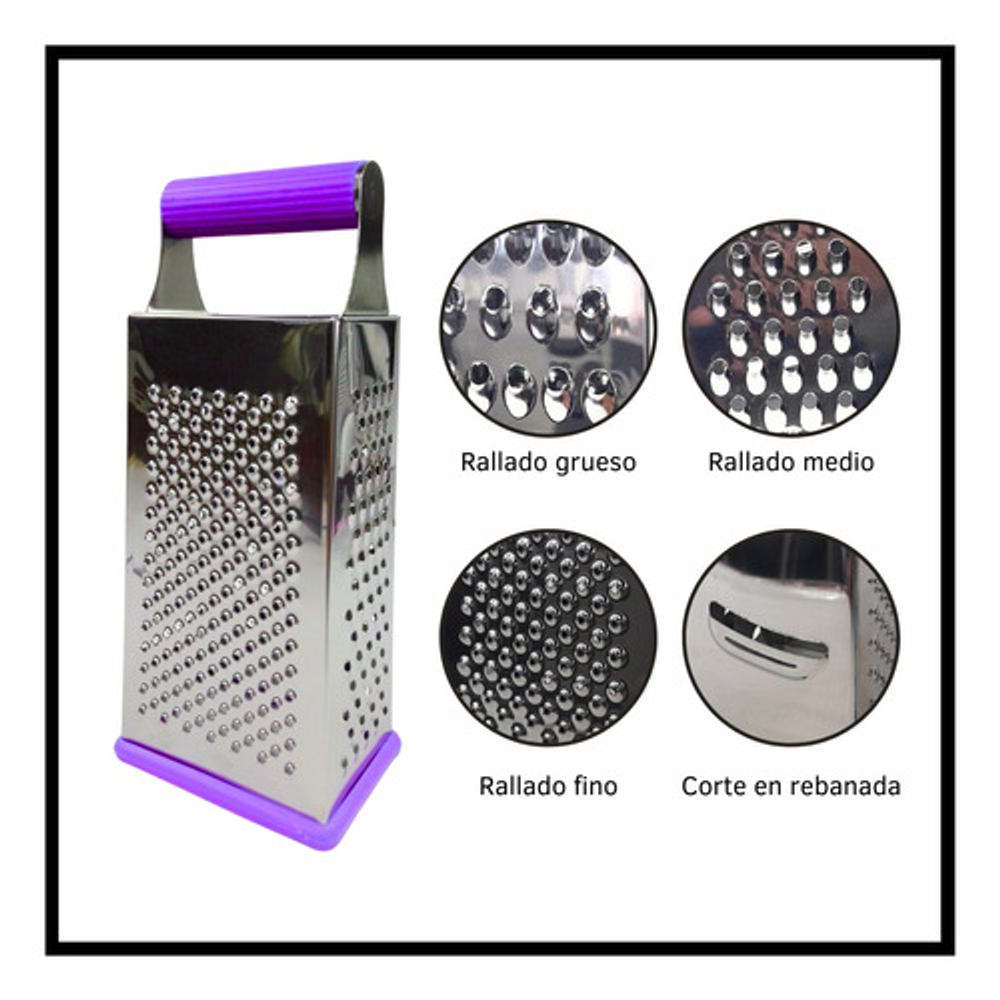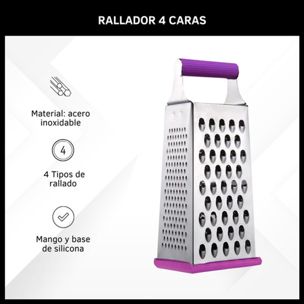 Características: • Material: acero inoxidable. • Mango y base de silicona. • 4 tipos de rallado (fino, medio, grueso y corte en rebanada).