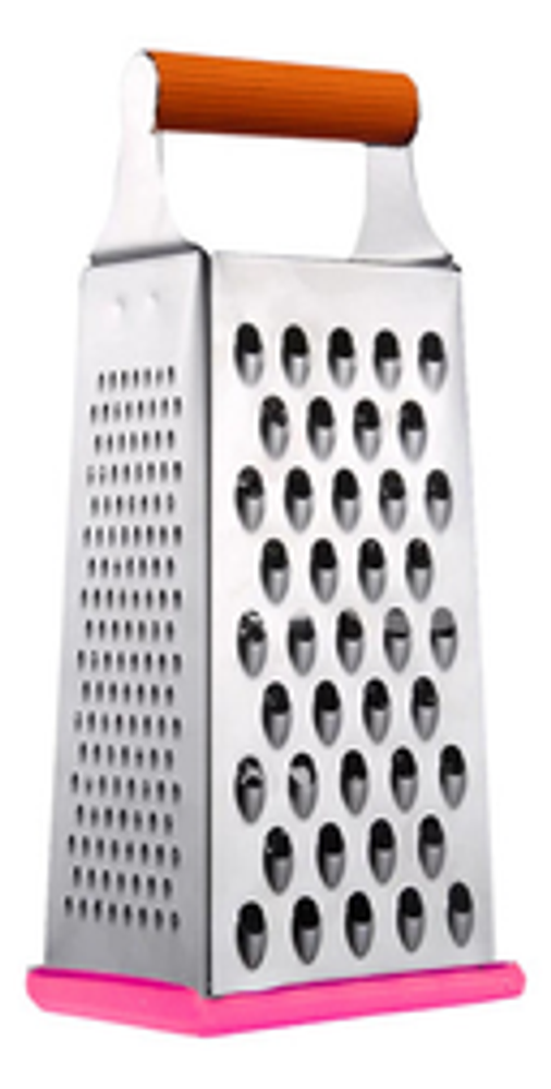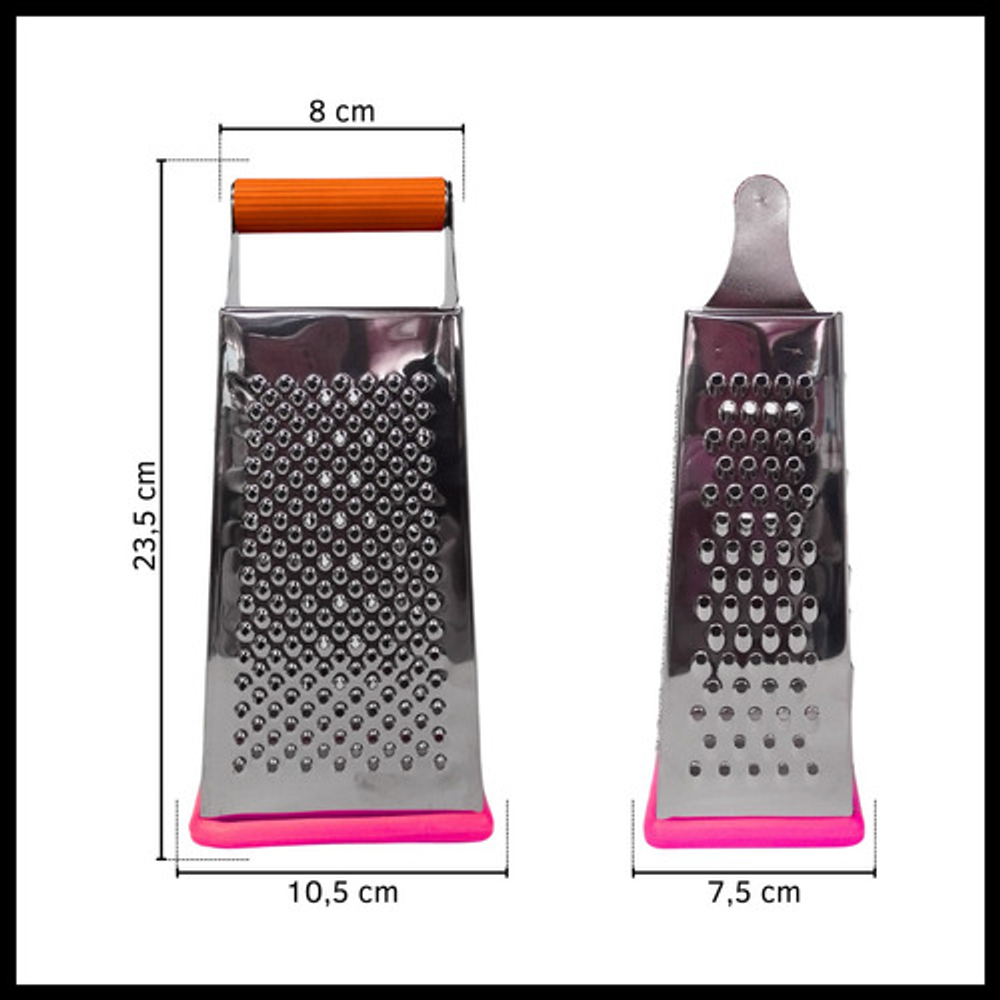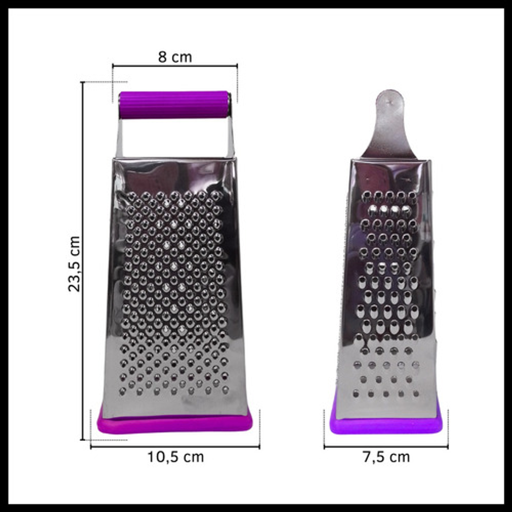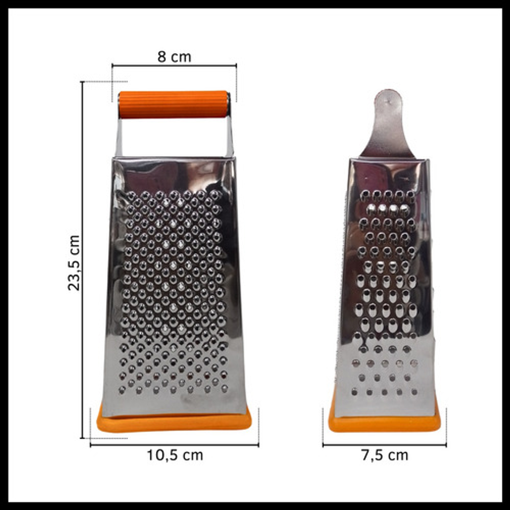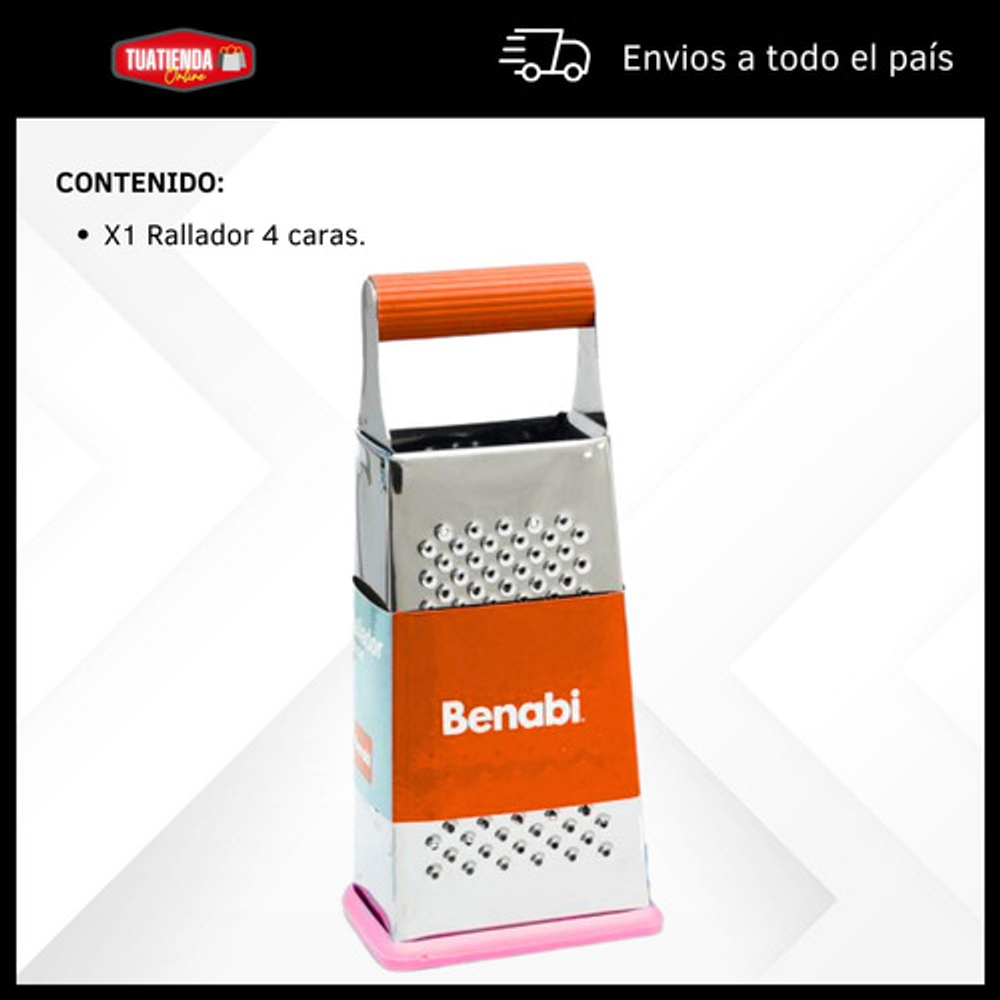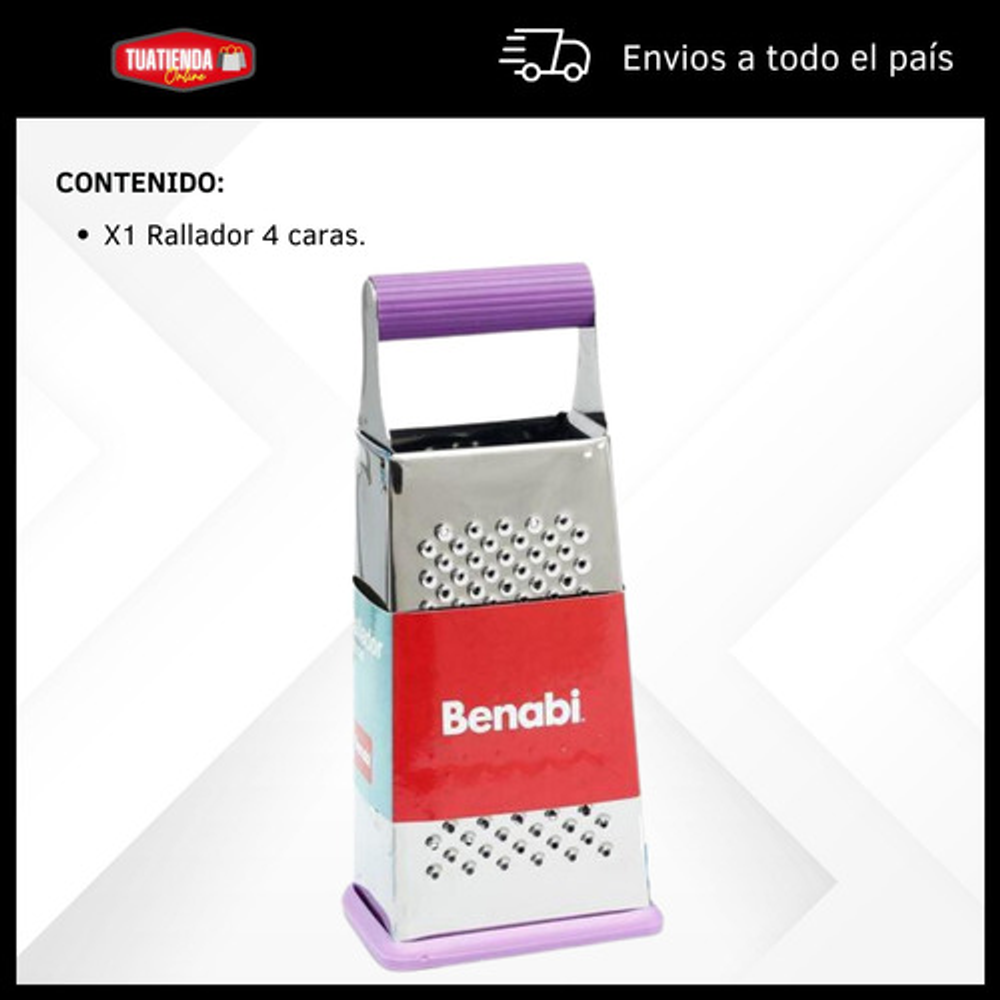 Características: • Material: acero inoxidable. • Mango y base de silicona. • 4 tipos de rallado (fino, medio, grueso y corte en rebanada).