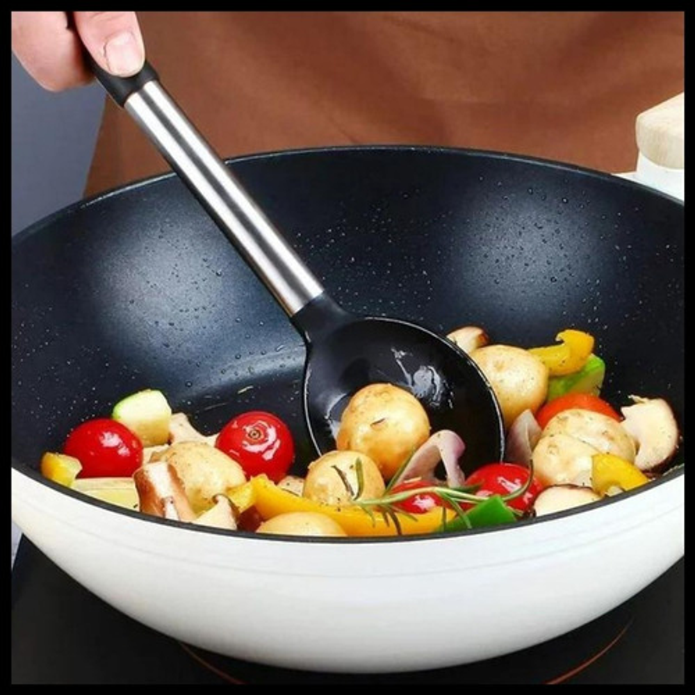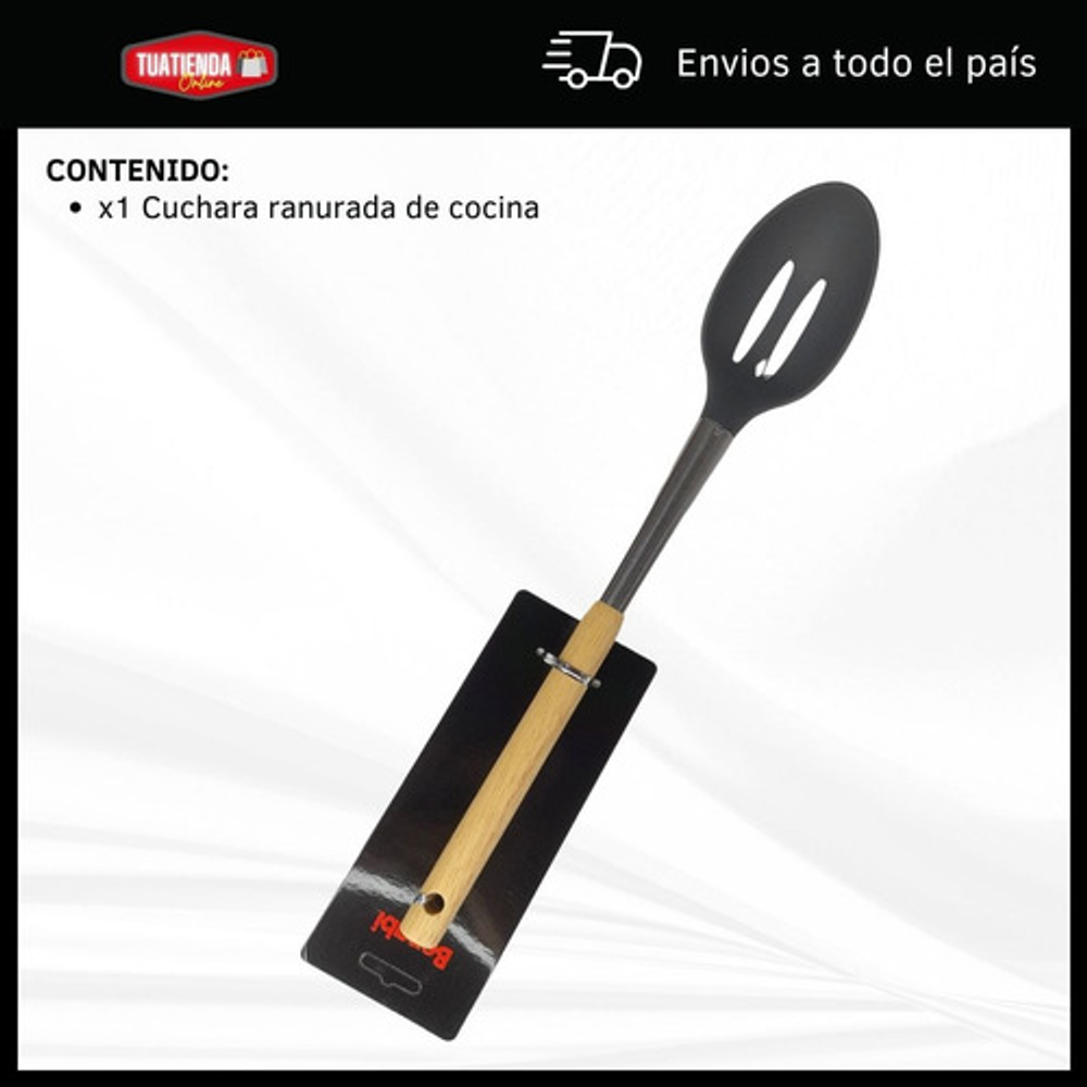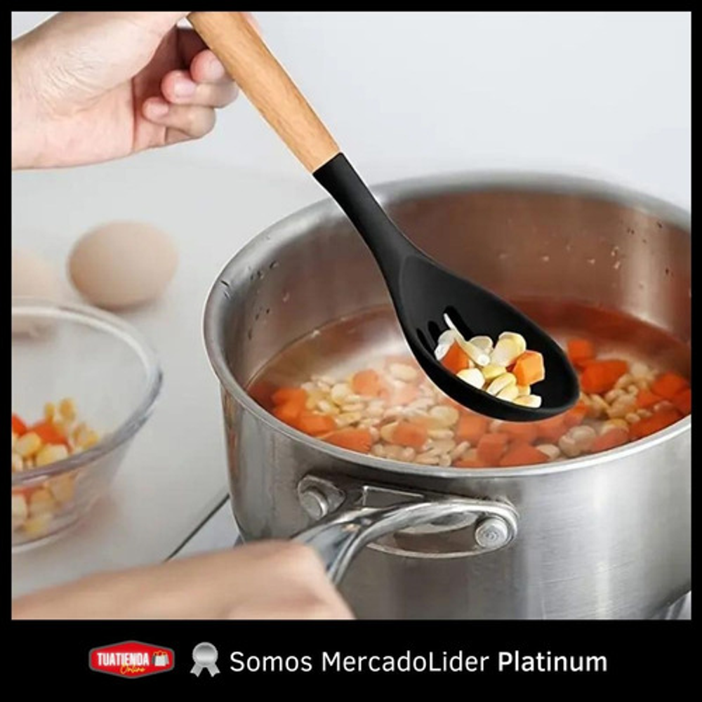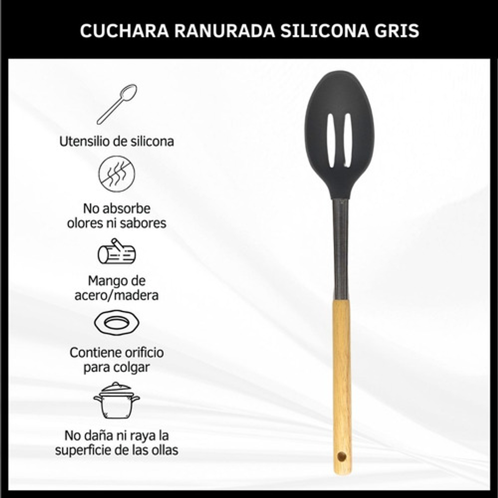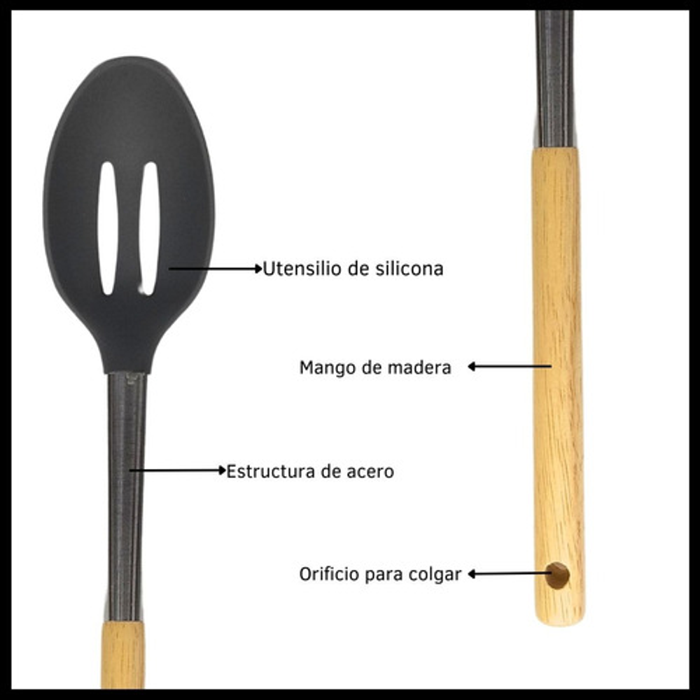 CARACTERISTICAS: -Utensilio de silicona -No absorbe olores ni sabores -Contiene mango de madera -Cuenta con orificio para colgar -No daña ni raya la superficie de las ollas