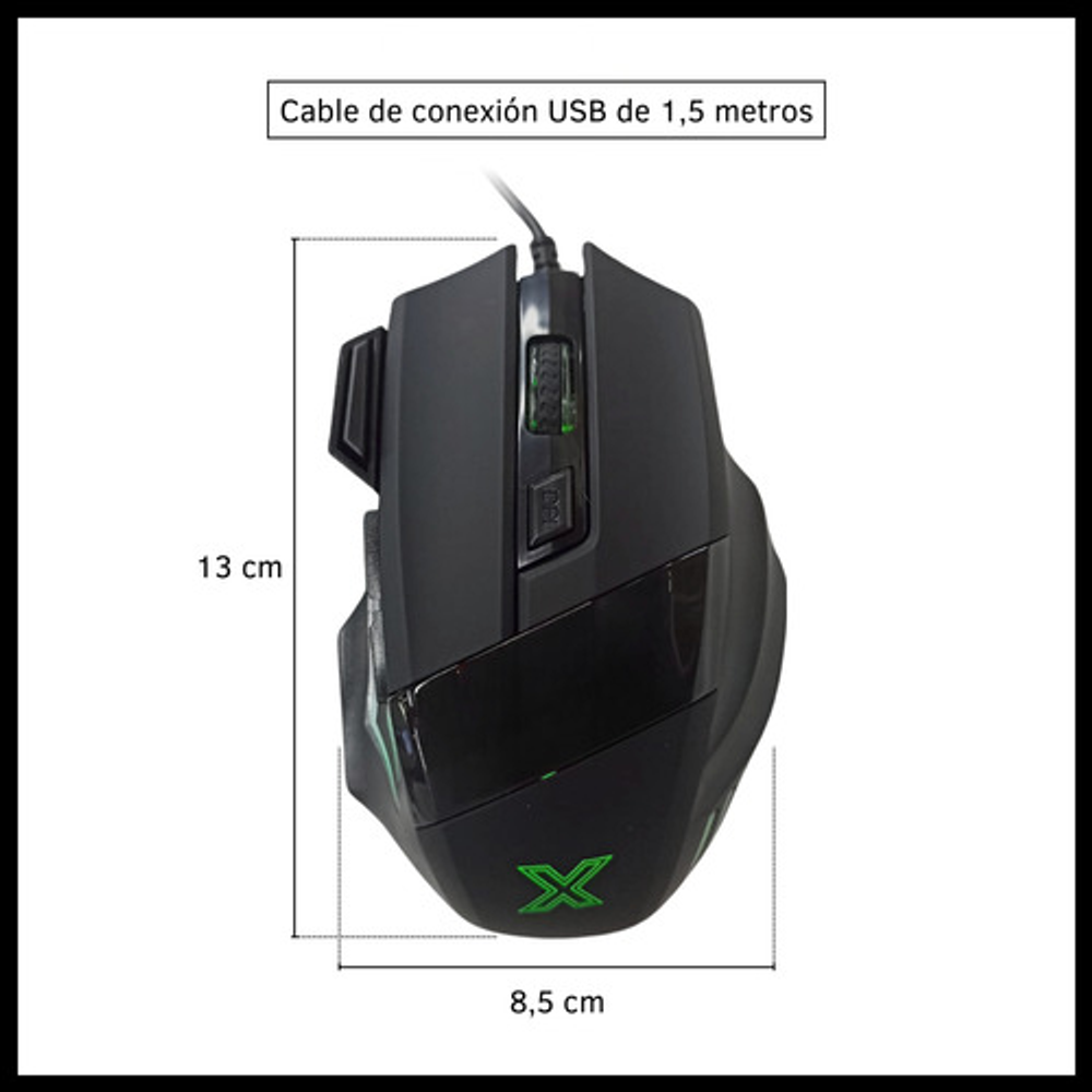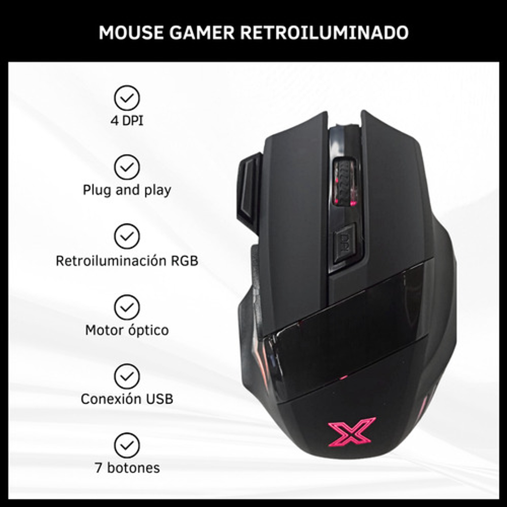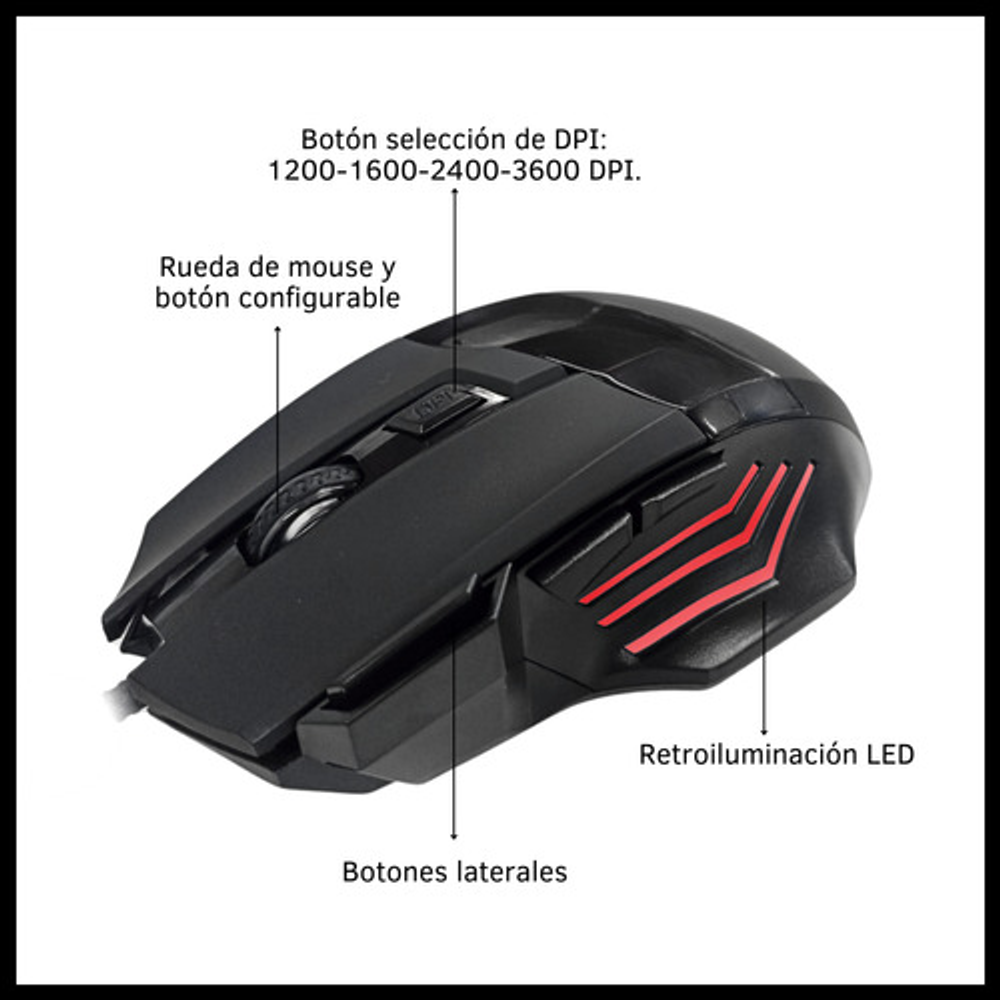 Características: • 7 Botones. • Conexión USB (cable integrado). • Retroiluminación con luces LED RGB. • Proporciona 4 DPI seleccionables. • Compatibilidad plug and play. • Dispone de un motor óptico.