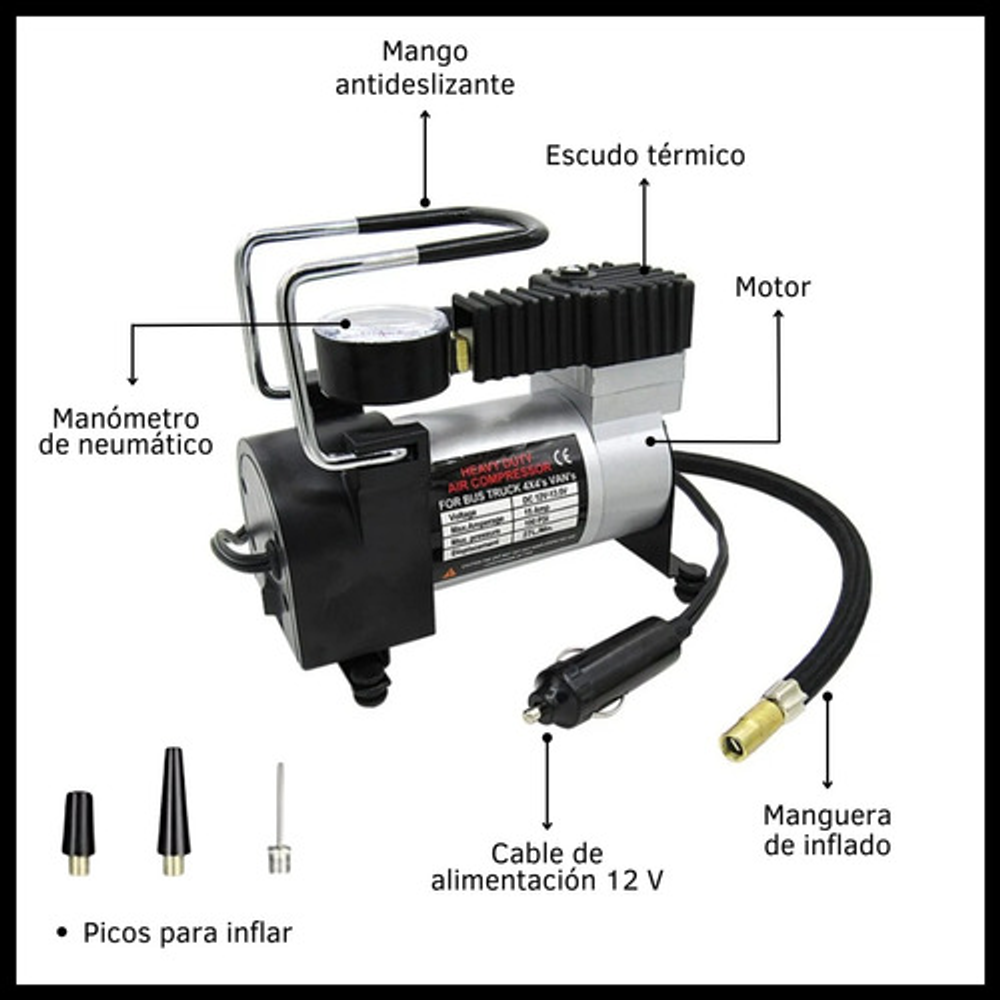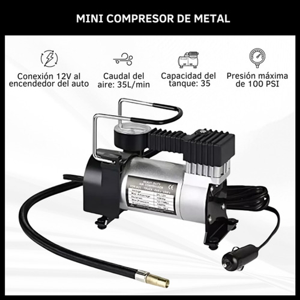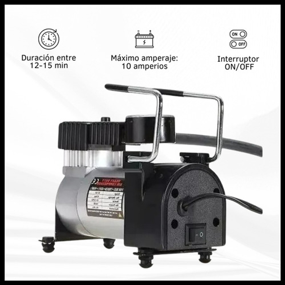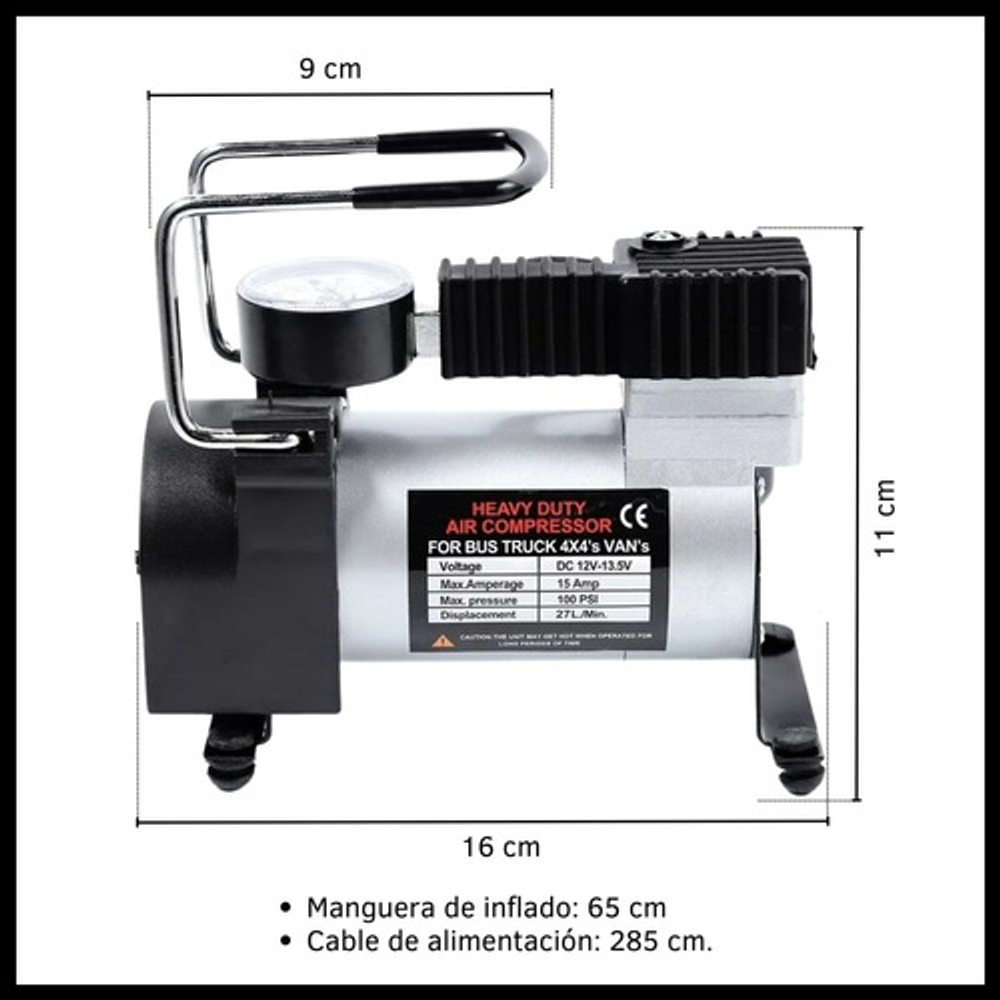 Características: -Conexión 12V al encendedor del auto. -Presión máxima del tanque 100 PSI. -Máximo amperaje: 10 amperios. -Duración entre 12-15 minutos. -Capacidad del tanque: 35L. -Caudal de aire: 35L/min. -Manija antideslizante. -Manguera de inflado. -Interruptor ON/OFF. -Voltaje: 12V.
