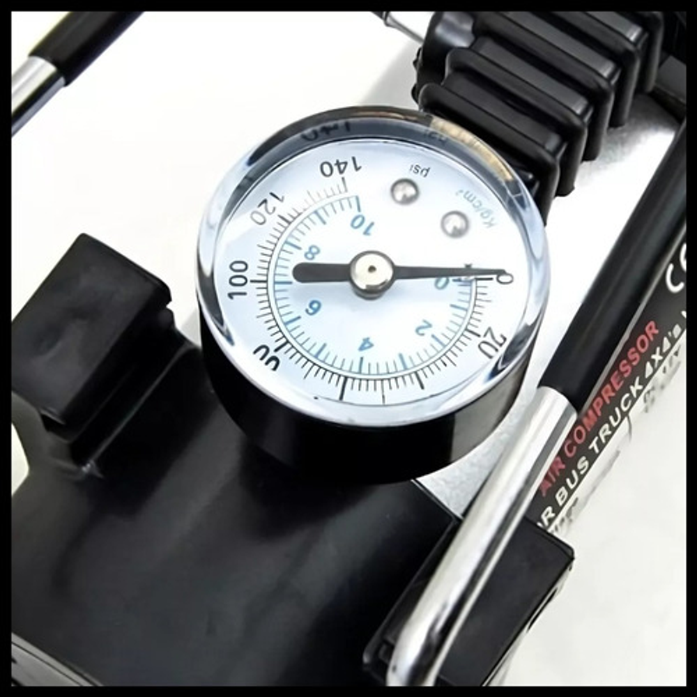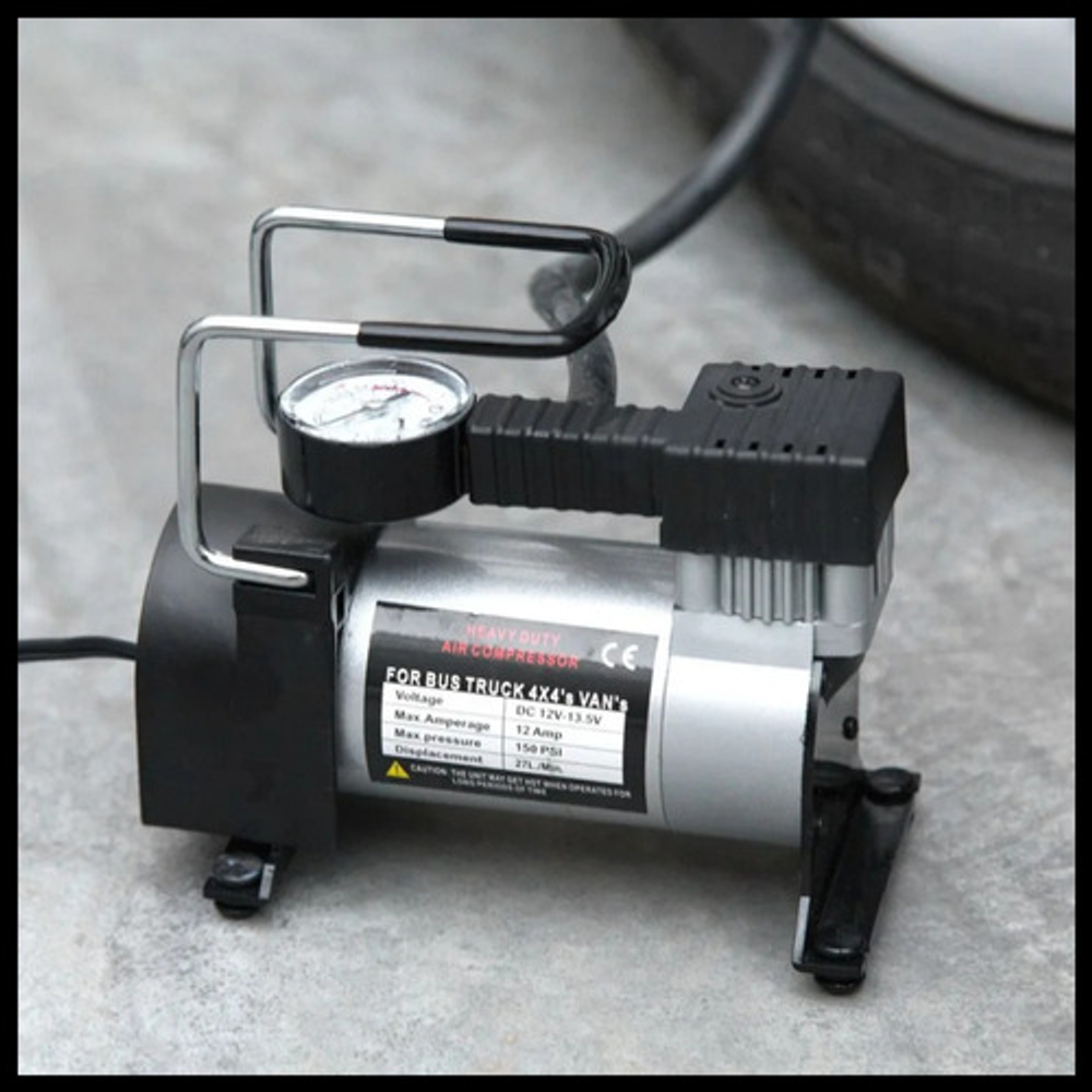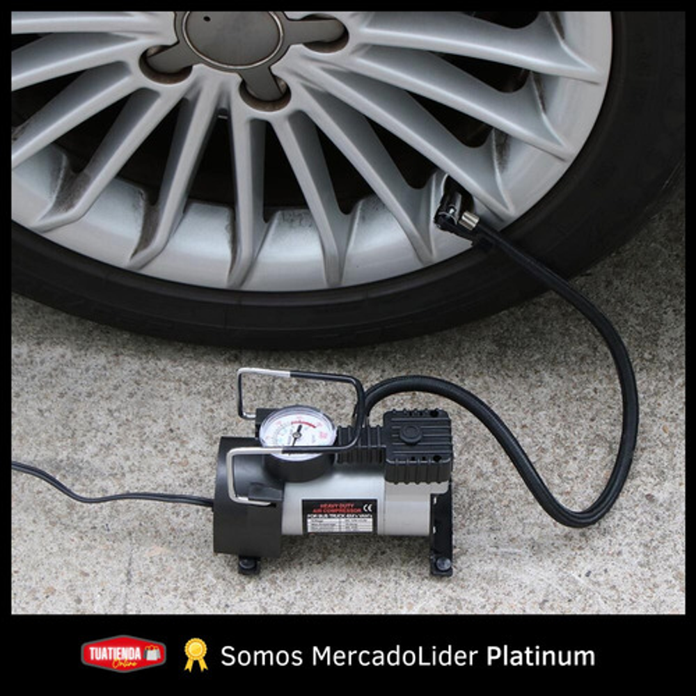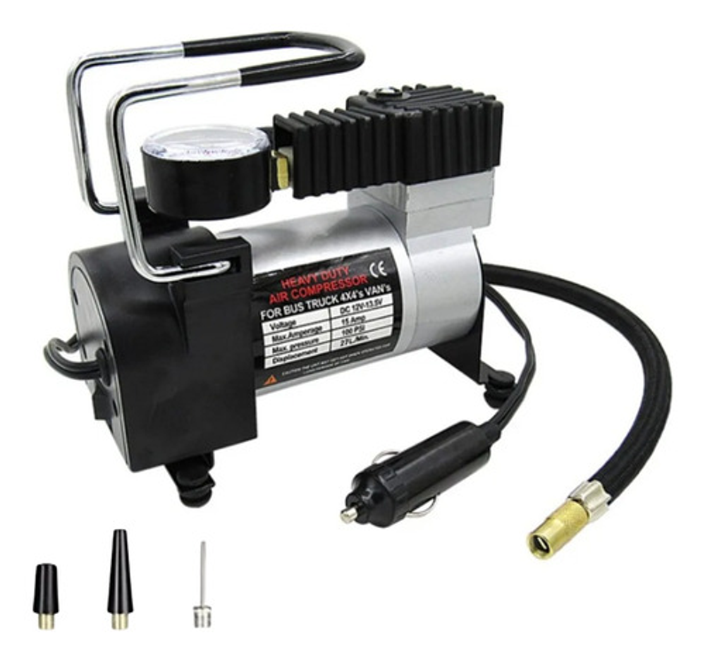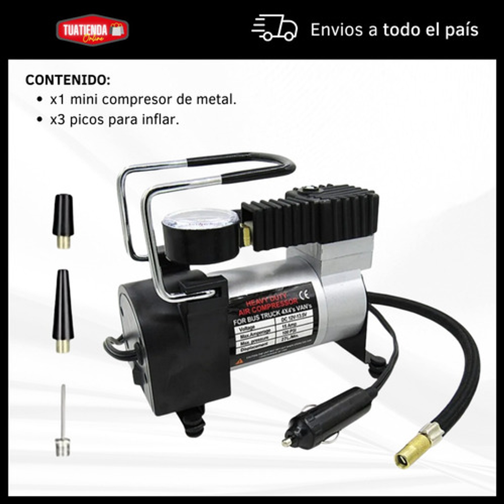 Características: -Conexión 12V al encendedor del auto. -Presión máxima del tanque 100 PSI. -Máximo amperaje: 10 amperios. -Duración entre 12-15 minutos. -Capacidad del tanque: 35L. -Caudal de aire: 35L/min. -Manija antideslizante. -Manguera de inflado. -Interruptor ON/OFF. -Voltaje: 12V.