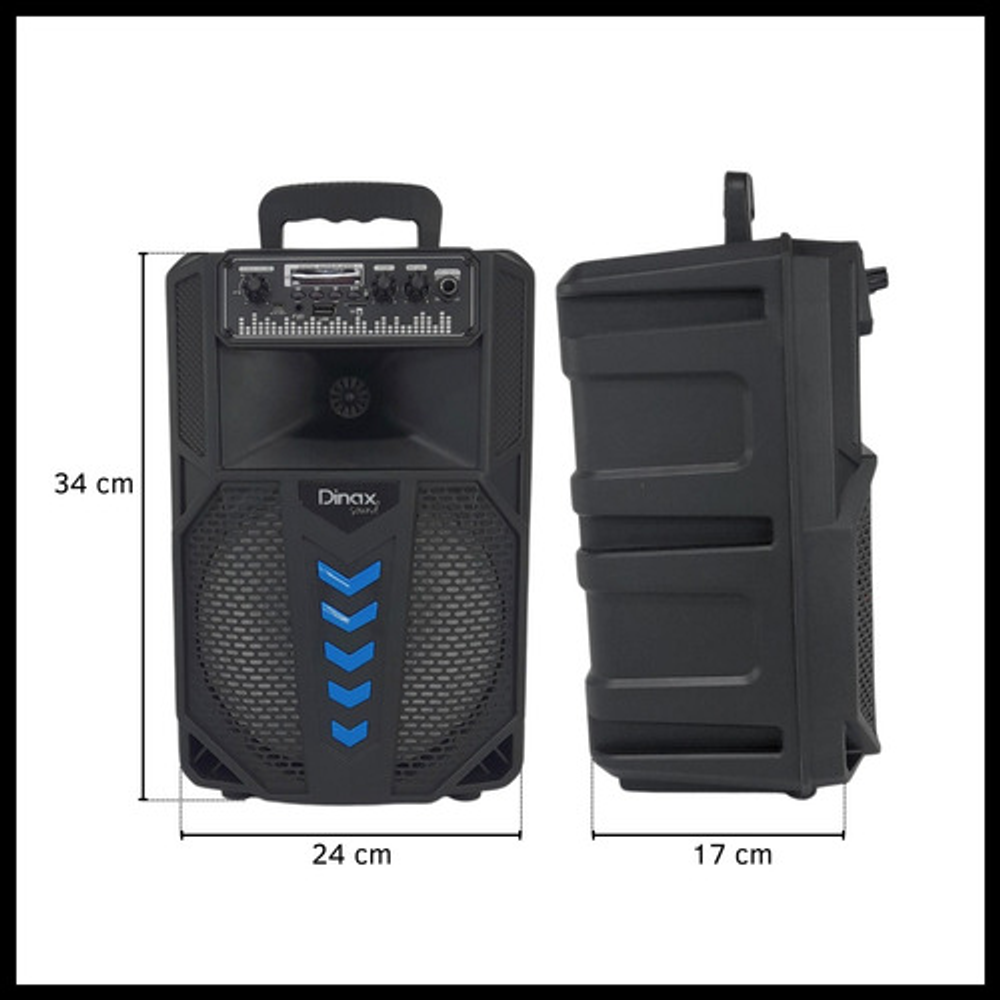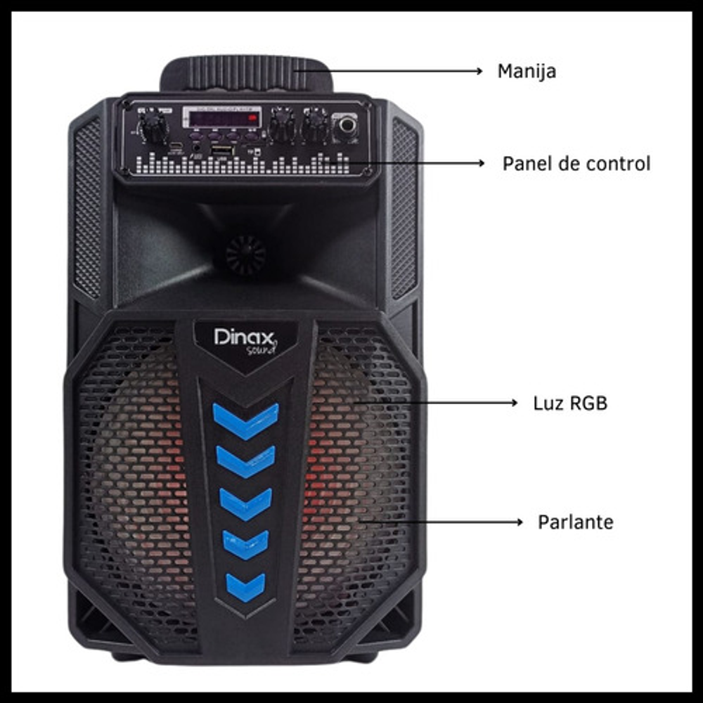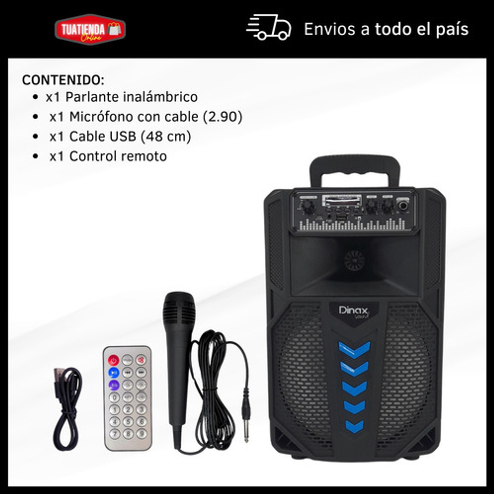 PARLANTE PORTATIL RITMO: https://articulo.mercadolibre.com.ar/MLA-1266340541-parlante-portatil-ritmo-300w-luces-colores-usb-radio-dinax-_JM