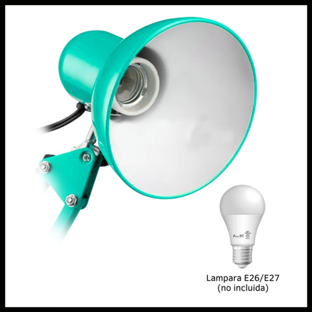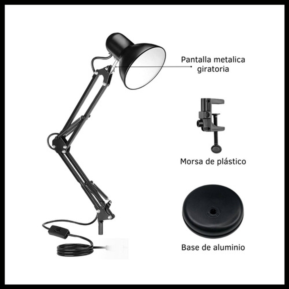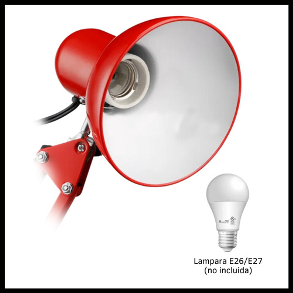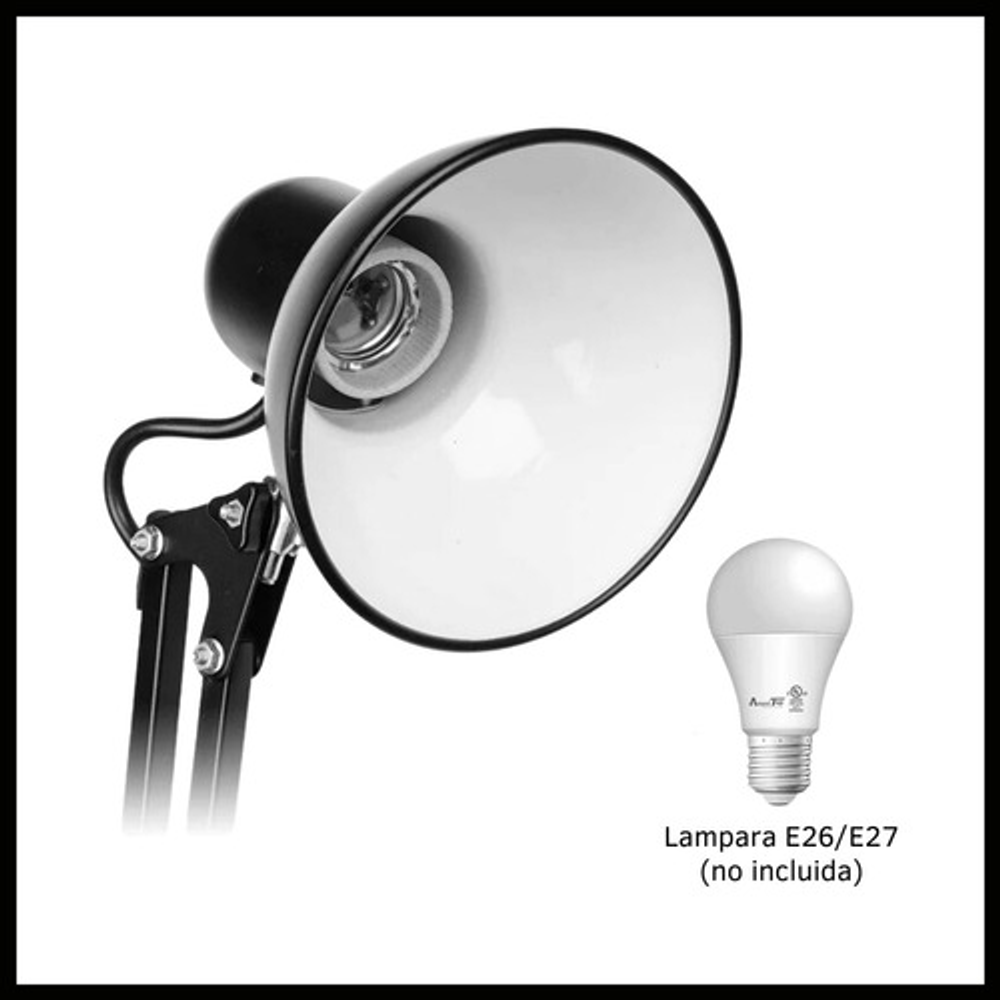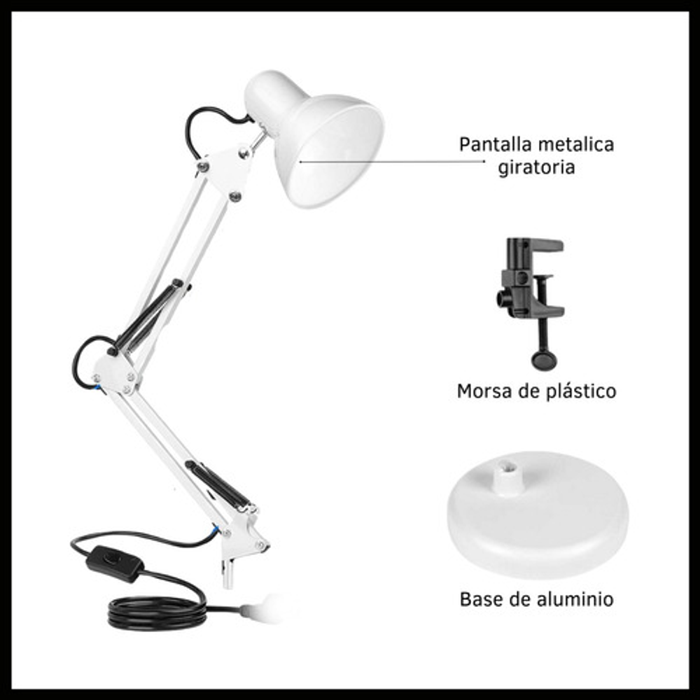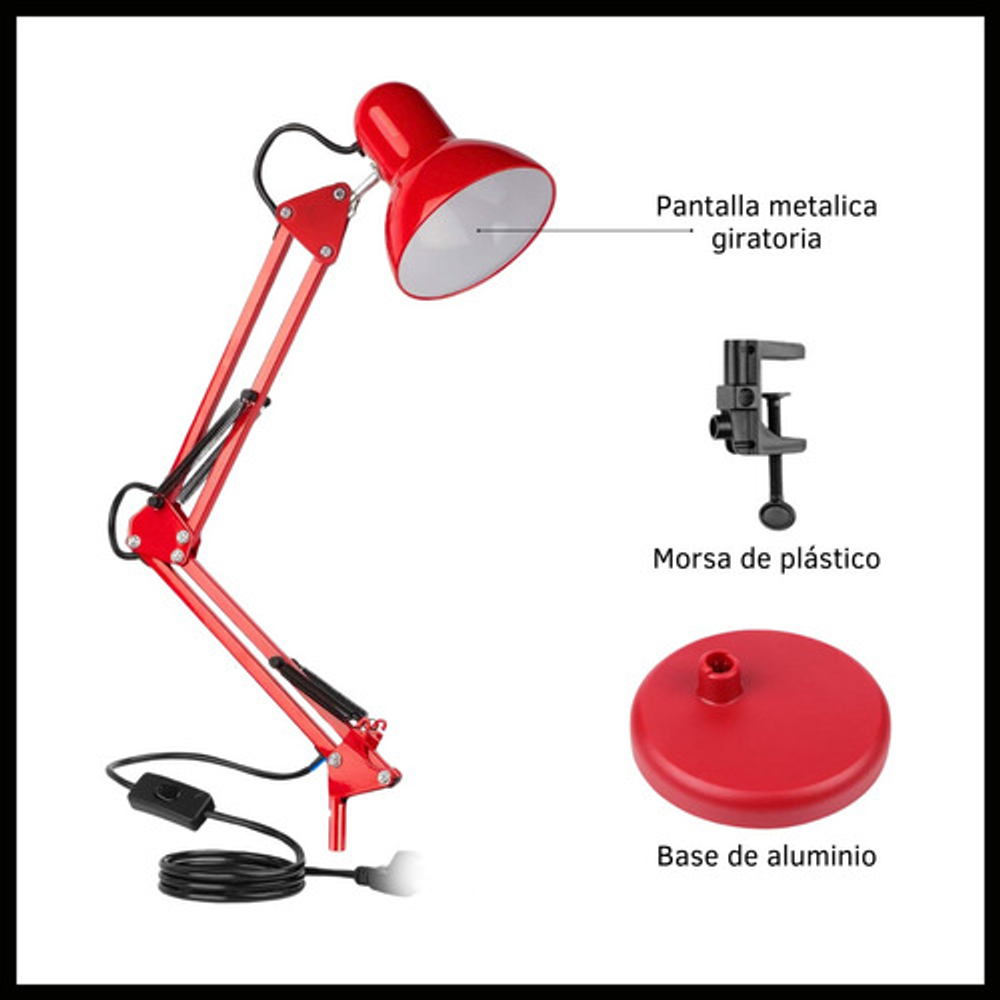 Características: -Brazo ajustable y rotativo. -Construida con estructura de metal y pantalla de aluminio. -Interruptor giratorio. -Compatible con foco E26-E27. (no incluido) -Incluye morza de plástico. -Peso: 1,2kg.