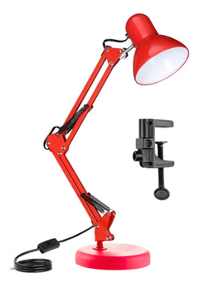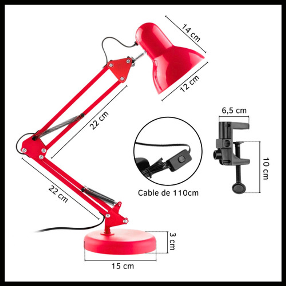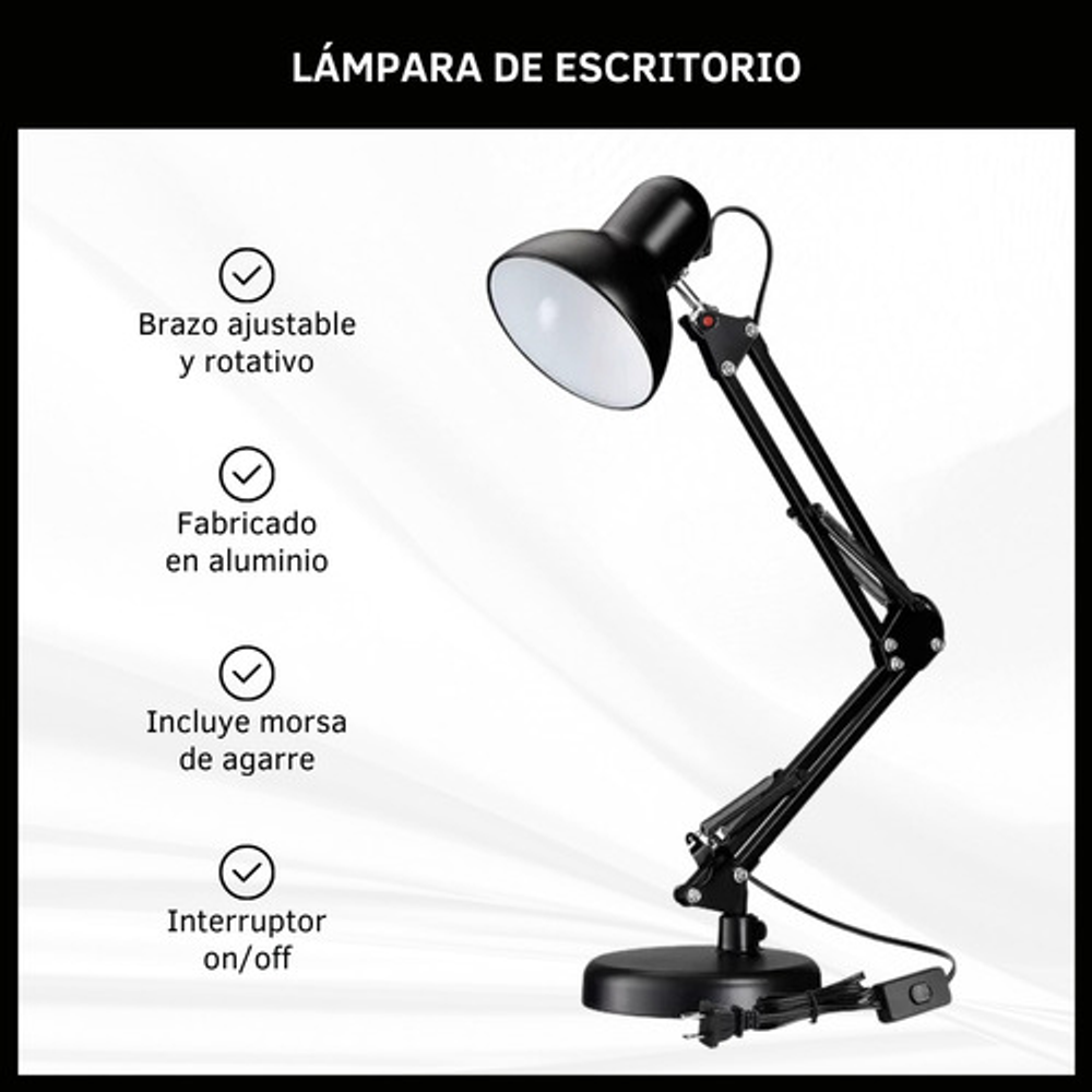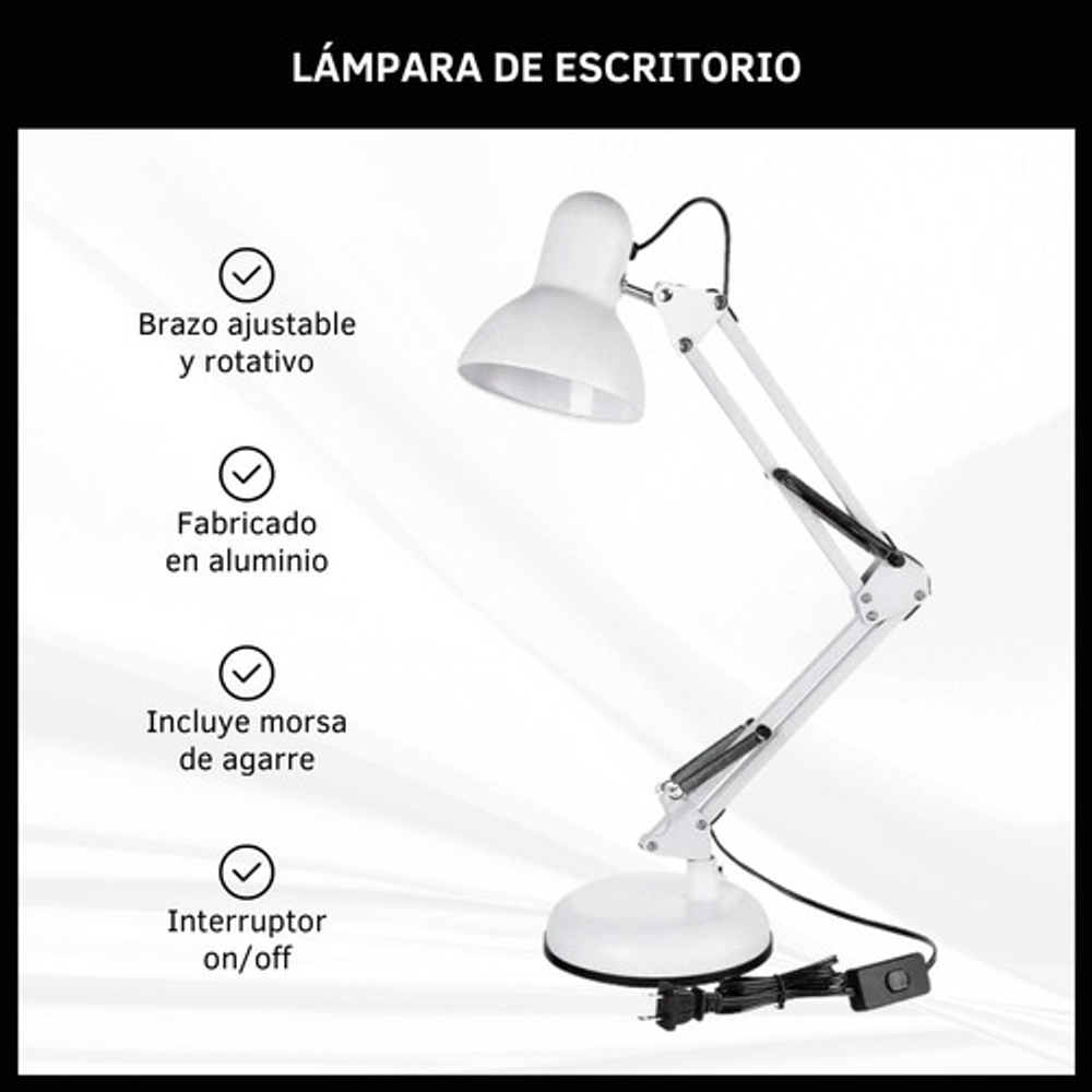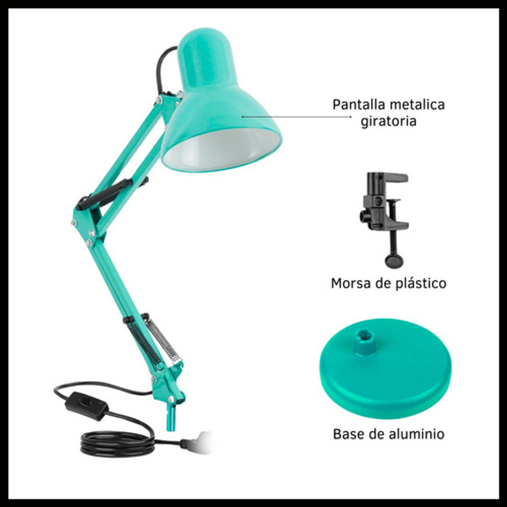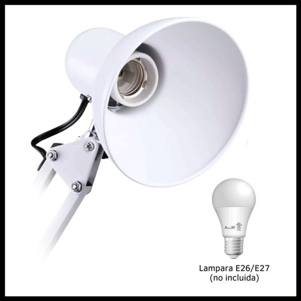 Características: -Brazo ajustable y rotativo. -Construida con estructura de metal y pantalla de aluminio. -Interruptor giratorio. -Compatible con foco E26-E27. (no incluido) -Incluye morza de plástico. -Peso: 1,2kg.
