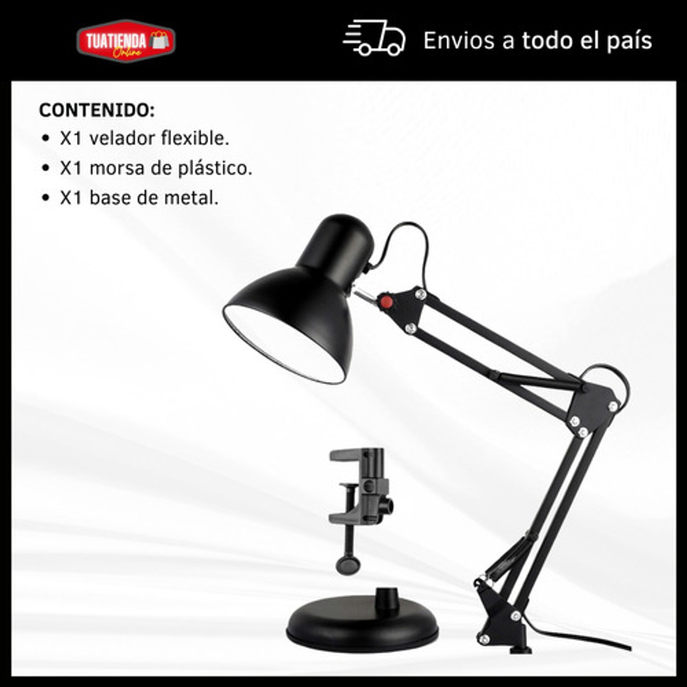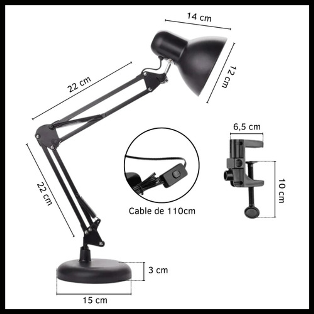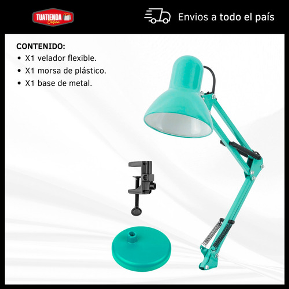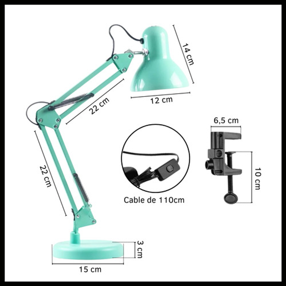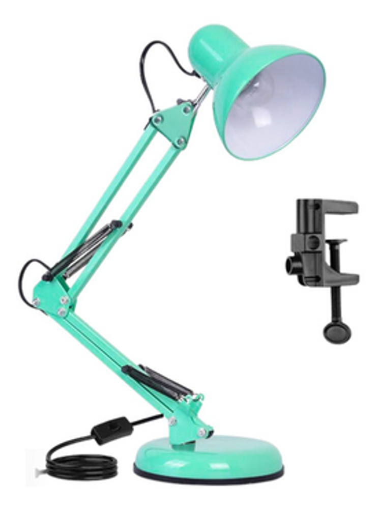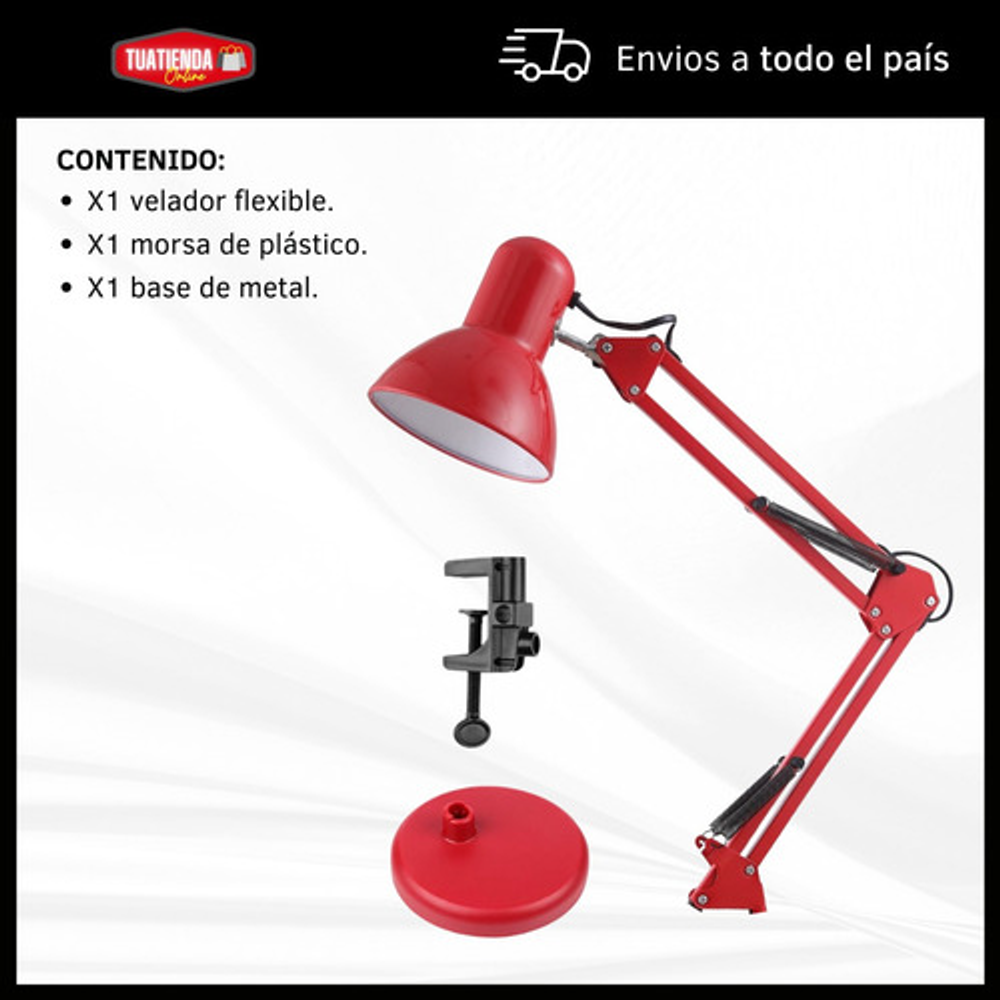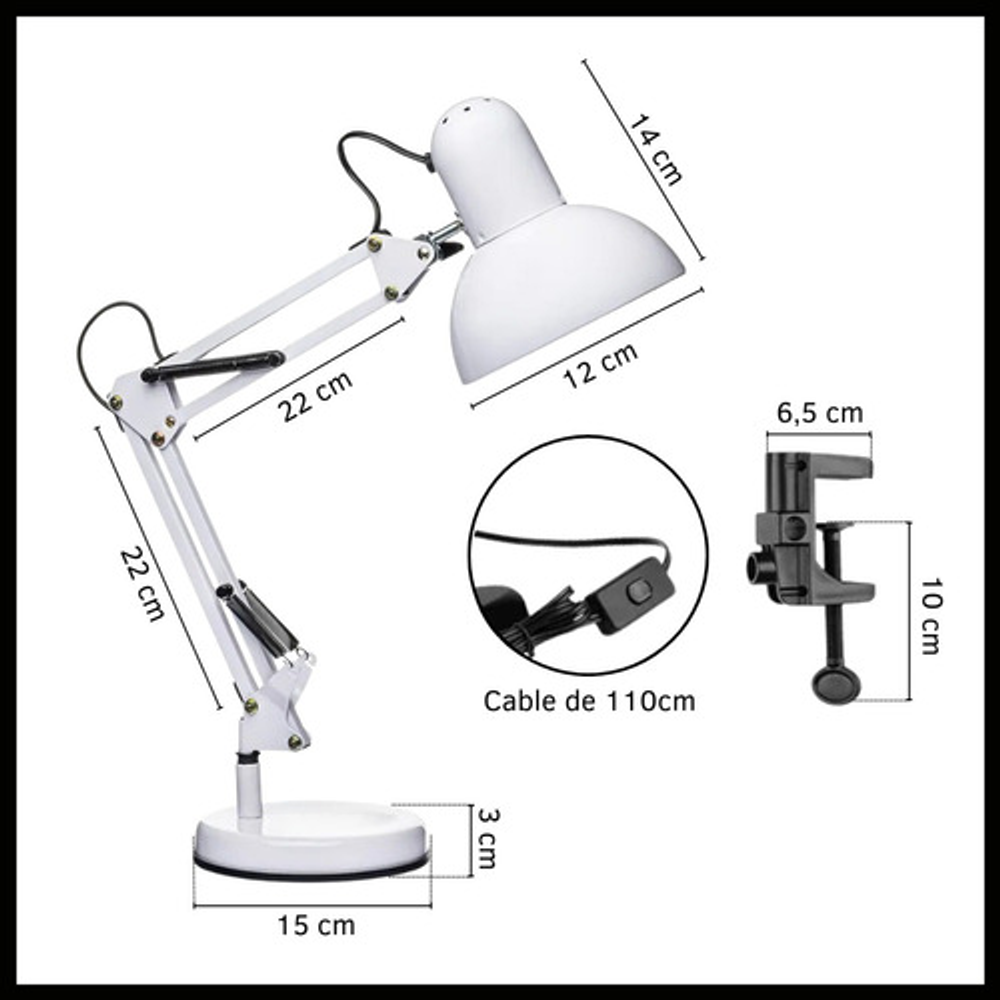 Características: -Brazo ajustable y rotativo. -Construida con estructura de metal y pantalla de aluminio. -Interruptor giratorio. -Compatible con foco E26-E27. (no incluido) -Incluye morza de plástico. -Peso: 1,2kg.