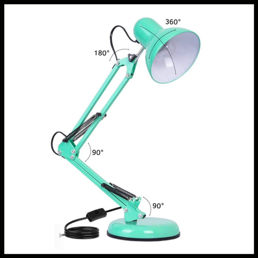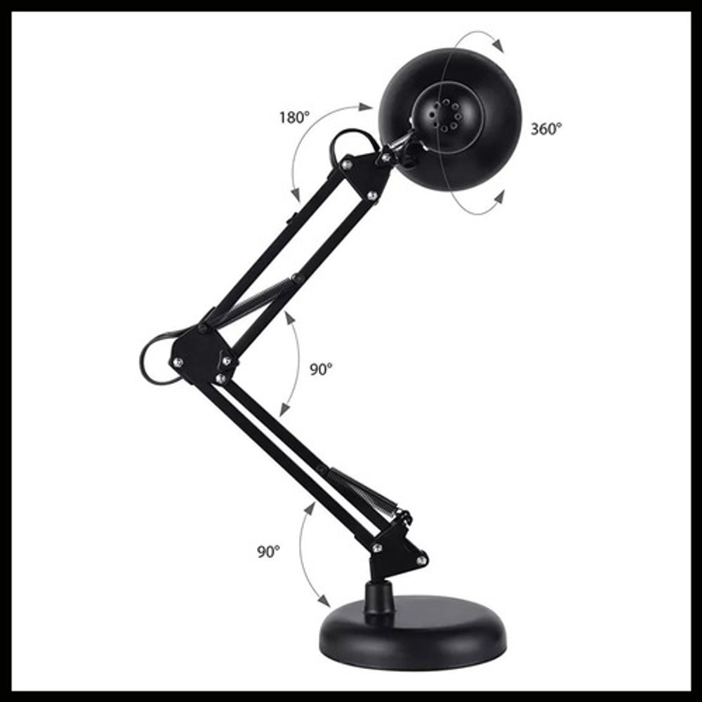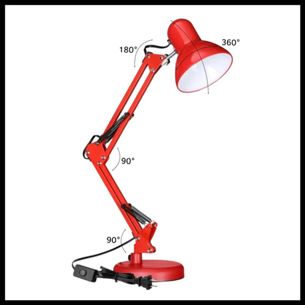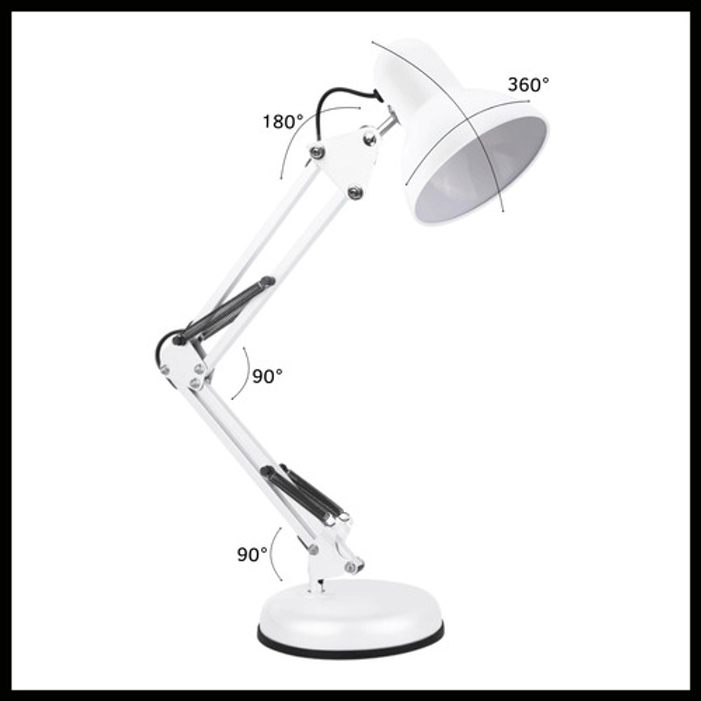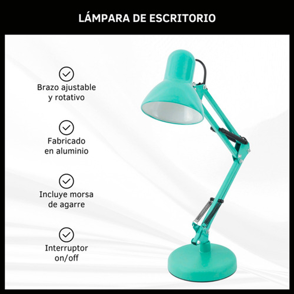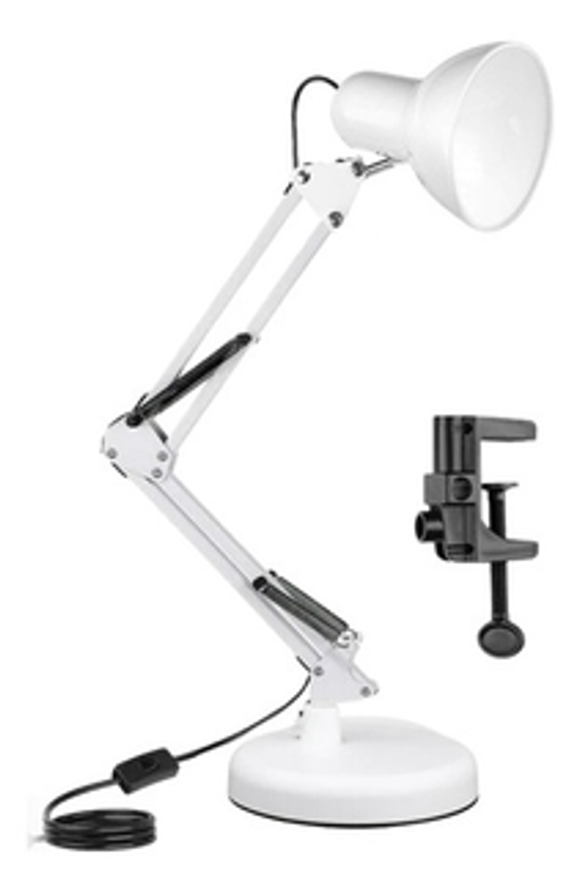 Características: -Brazo ajustable y rotativo. -Construida con estructura de metal y pantalla de aluminio. -Interruptor giratorio. -Compatible con foco E26-E27. (no incluido) -Incluye morza de plástico. -Peso: 1,2kg.