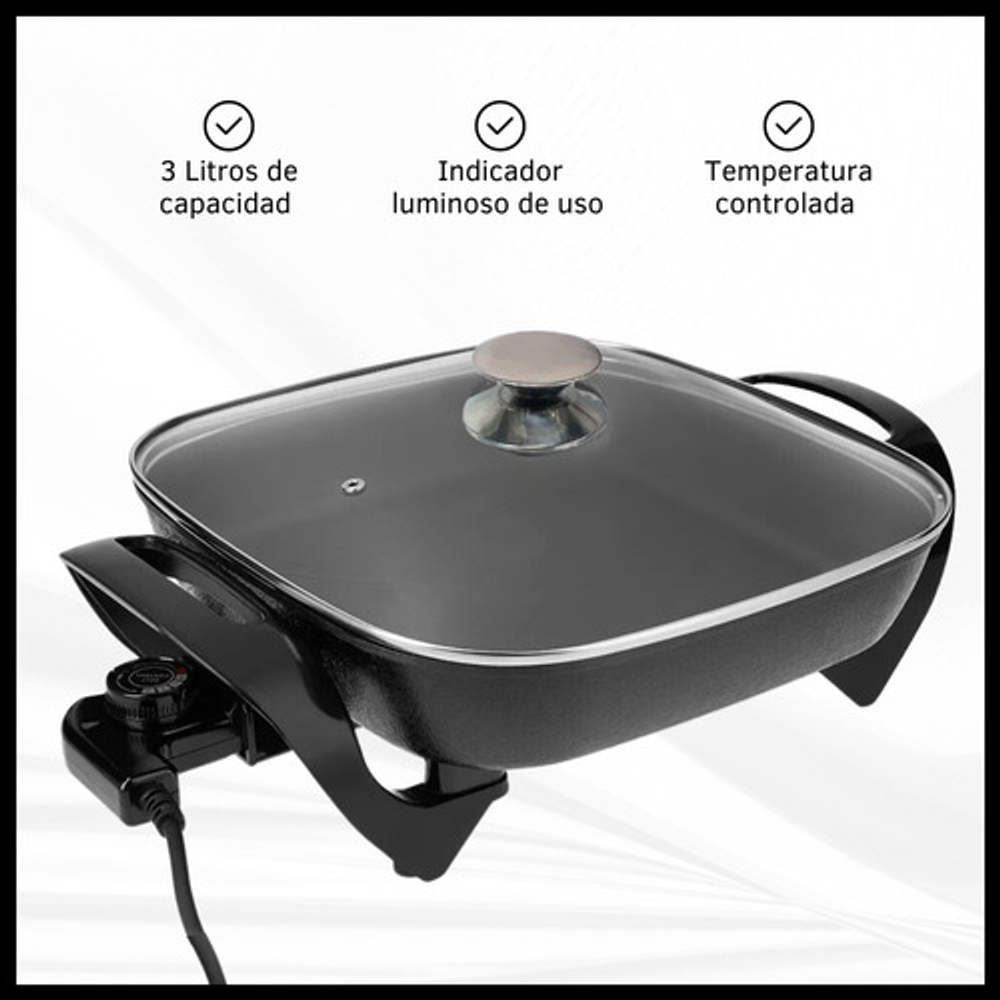 Características: • Tapa de vidrio templado con orificio para la salida del vapor. • Superficie antiadherente de teflón. • Calentamiento rápido. • Termostato regulable. • Capacidad de 3 litros. • Regulador desmontable. • Indicador luminoso. • Potencia de 1300 W. • CA 220V. • Temperatura controlada. • Ideal para grillar, guisar, freír y cocinar al vapor.