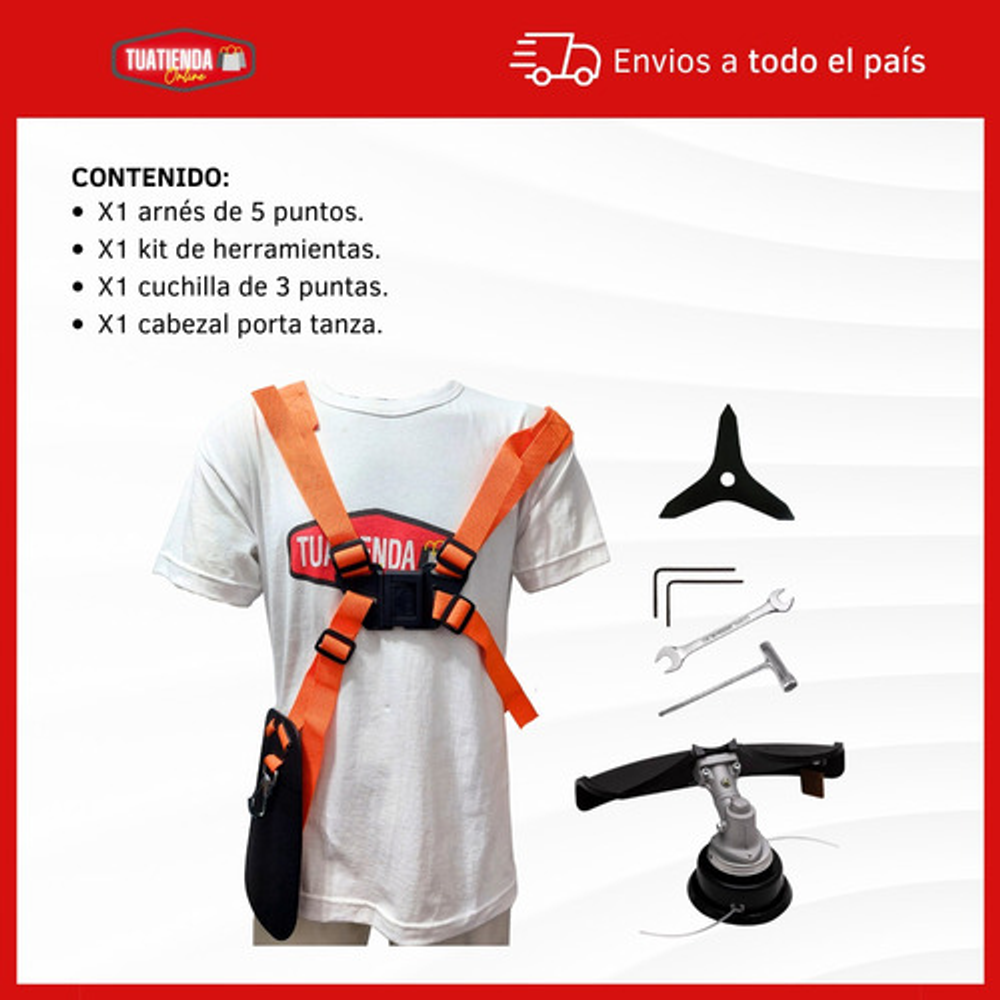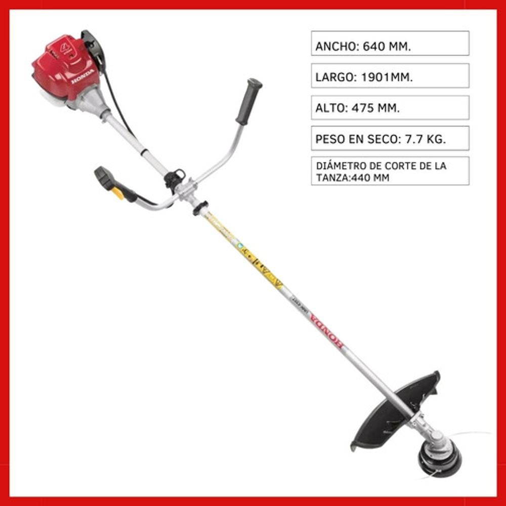 -Otras Especificaciones -Capacidad de combustible 0,65 lts. -Consumo Específico de Combustible 0,71 lts./hs. a 7000 rpm -Capacidad de aceite 0,1 lts -Tipo de embrague Centrífugo -Accesorios de corte Cuchilla 3 Puntas / Cabezal porta tanza -Otros accesorios -Arnés de 5 puntos / Kit de herramientas