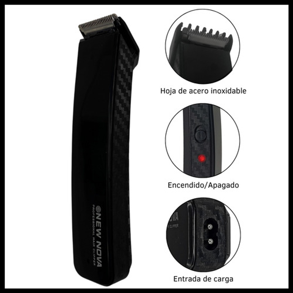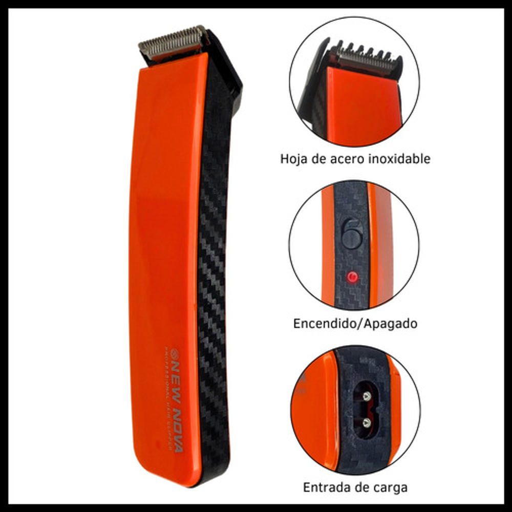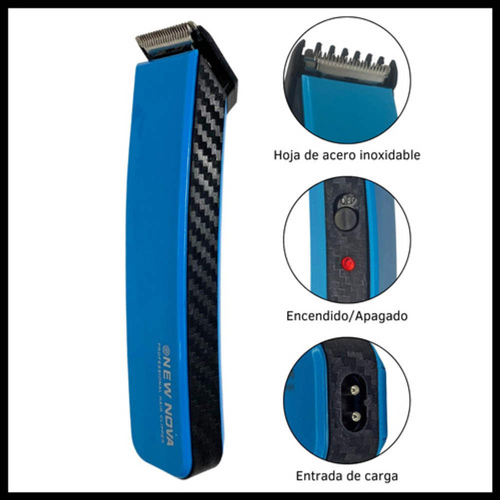 Características cortadora patillera: • Batería recargable a través de un cable USB. • Tiempo de carga: 12 horas (4,5 V, 100 mA). • Incluye cable cargador (Sin fuente). • Velocidad de rotación de 8000 rpm. • Indicador luminoso de carga. • Cuchilla de acero inoxidable. • Tiempo de uso: 45 minutos. • Peso: 100 gramos. • Cabezal ultra fino.