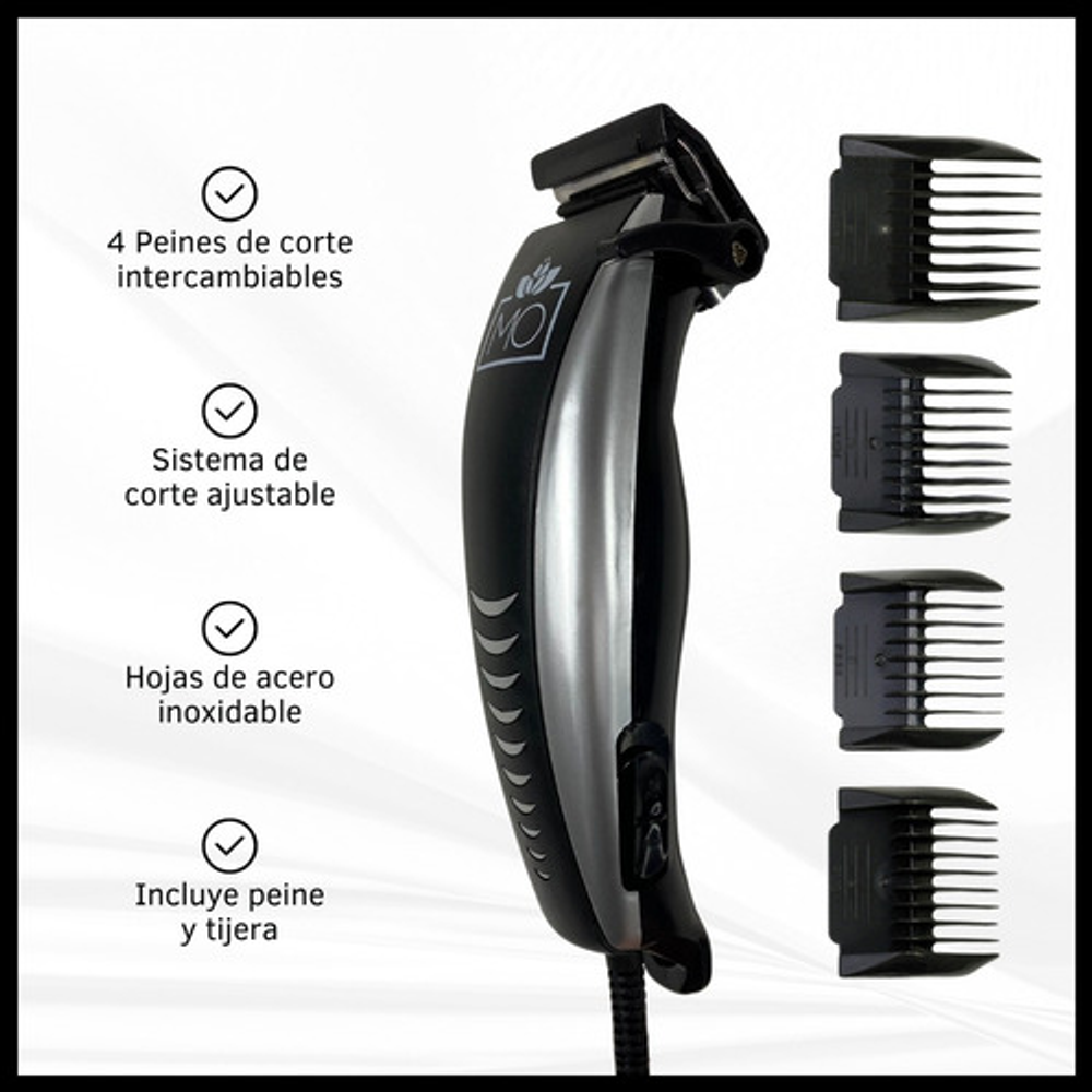 Características maquina de pelo: • Medidas de longitud de corte: 3mm, 6mm, 9mm y 12mm. • 4 cabezales intercambiables y ajustables. • Sistema de corte ajustable. • Incluye un cepillo lavable. • Combinación de estilos. • Cuchillas de acero inoxidable. • Incluye: peine de limpieza, aceite lubricante, tijera.