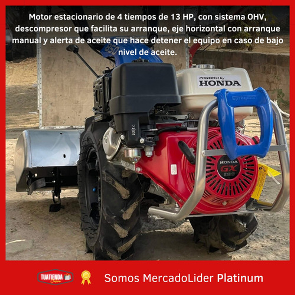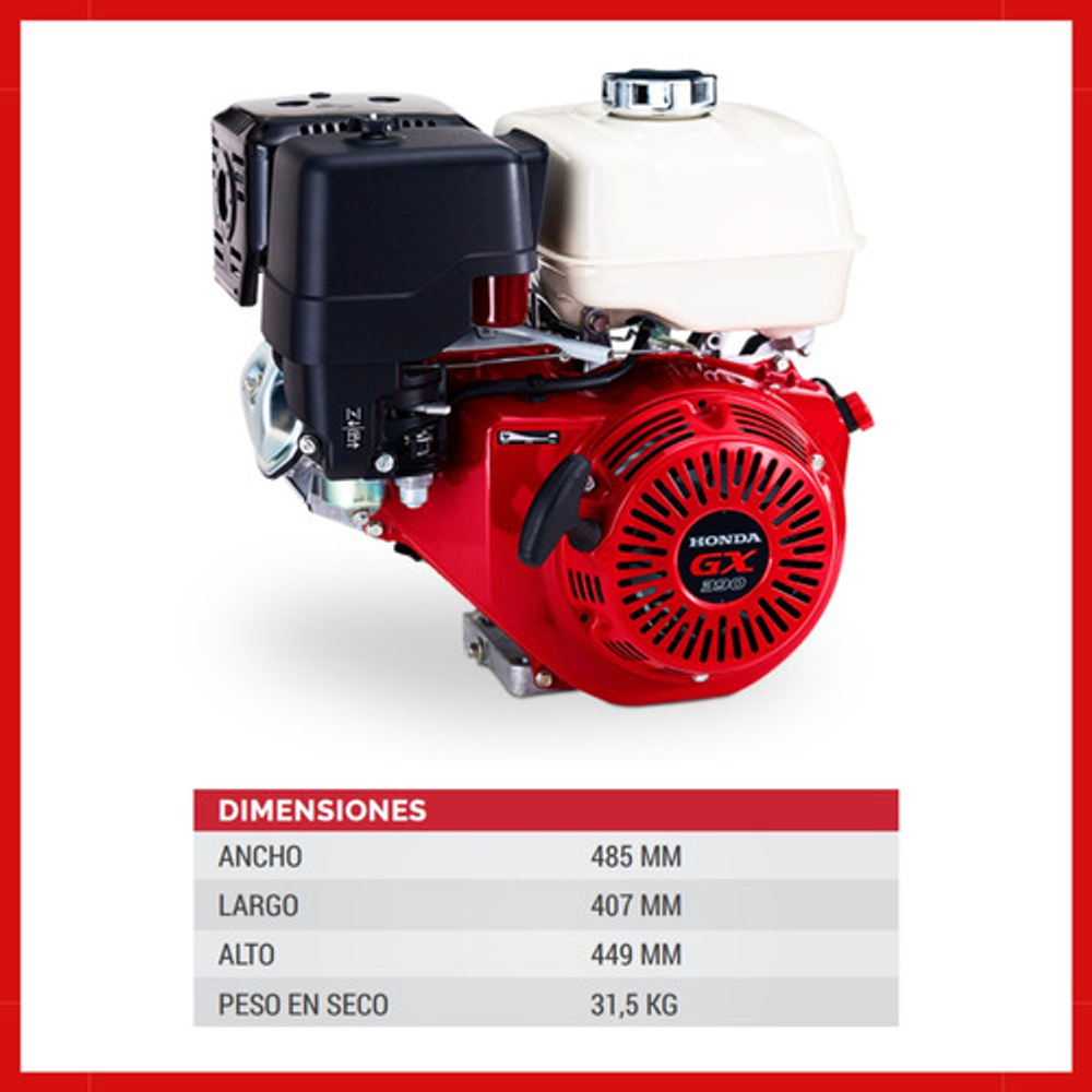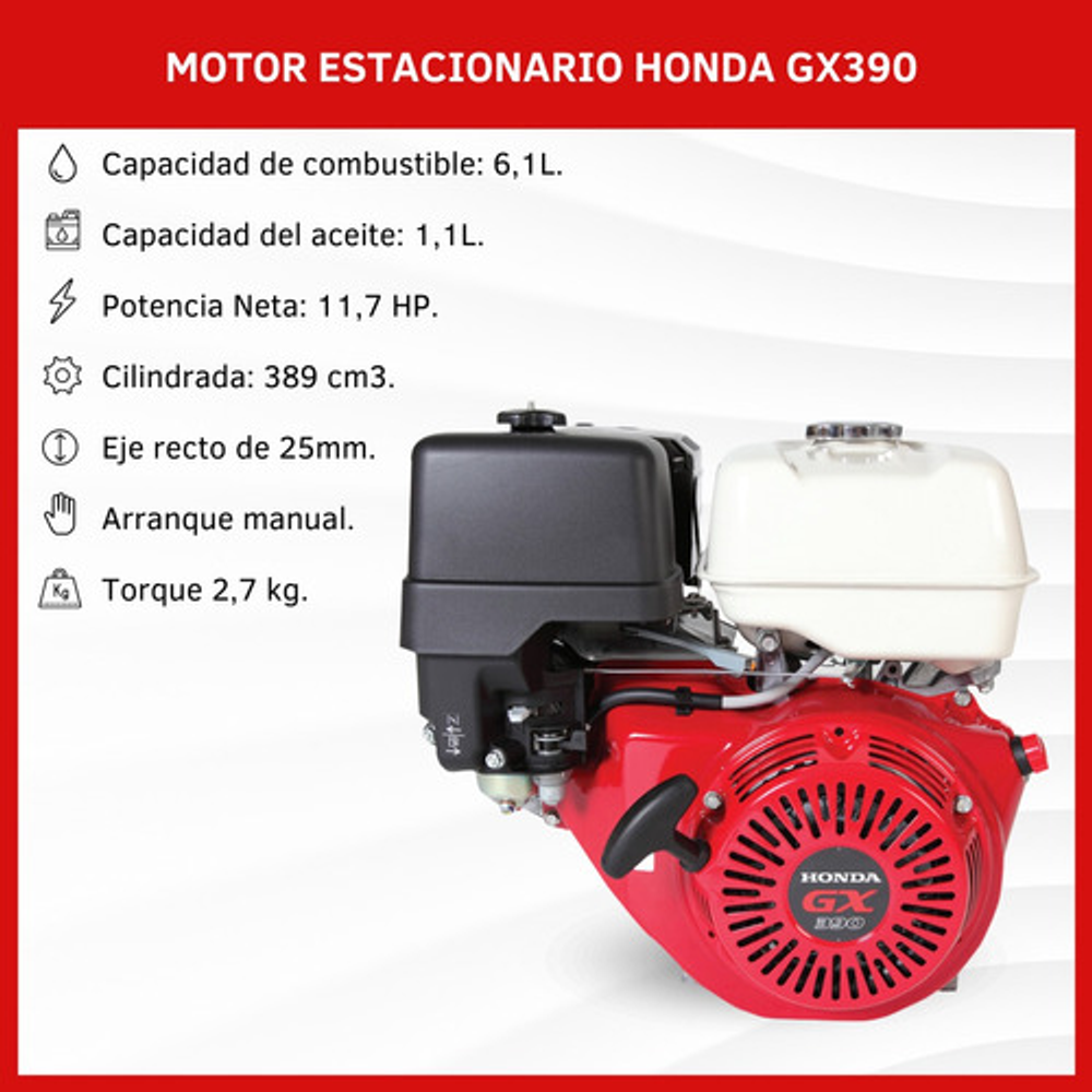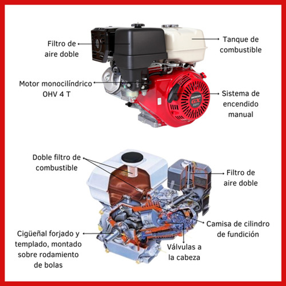Motor estacionario de 4 tiempos de 13 HP, con sistema OHV (válvulas a la cabeza), descompresor que facilita su arranque, eje horizontal con arranque manual y alerta de aceite que hace detener el equipo en caso de bajo nivel de aceite.