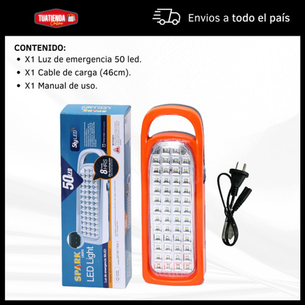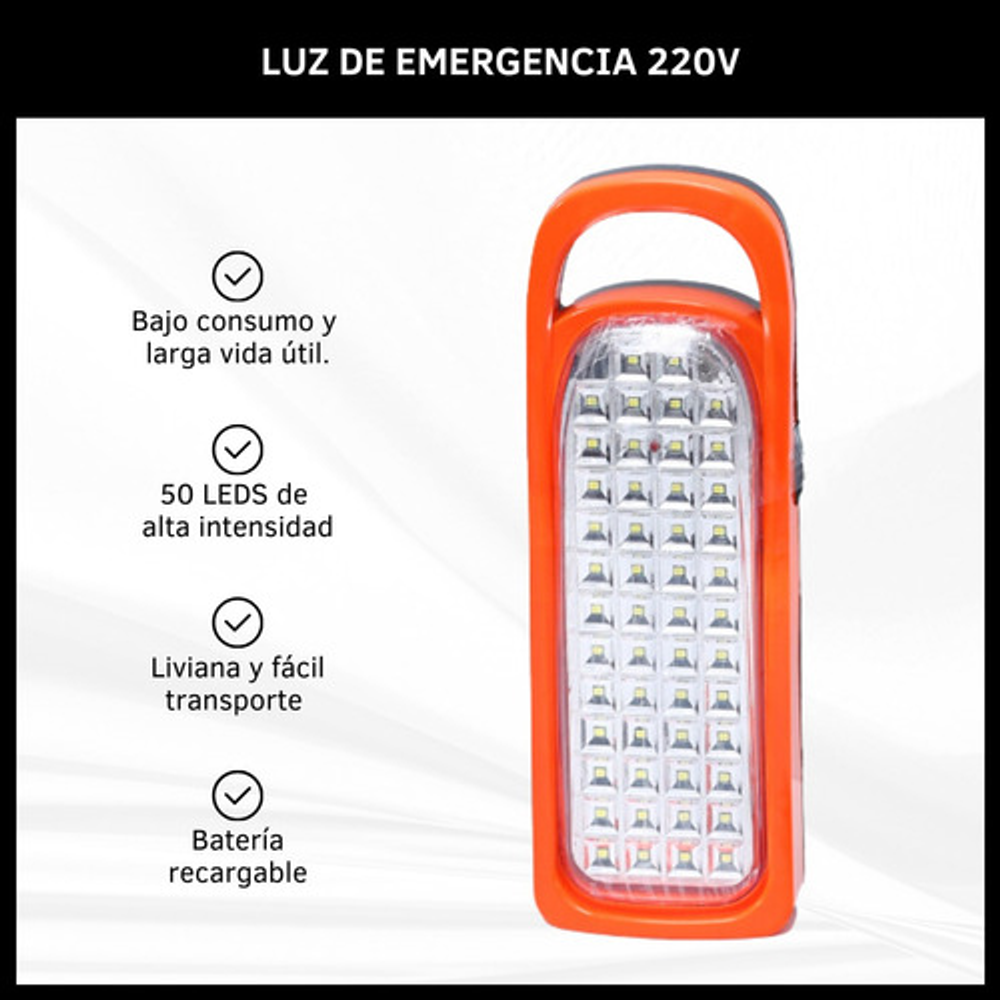 LUZ DE EMERGENCIA 50 LEDS 220V CON BATERIA RECARGABLE.
