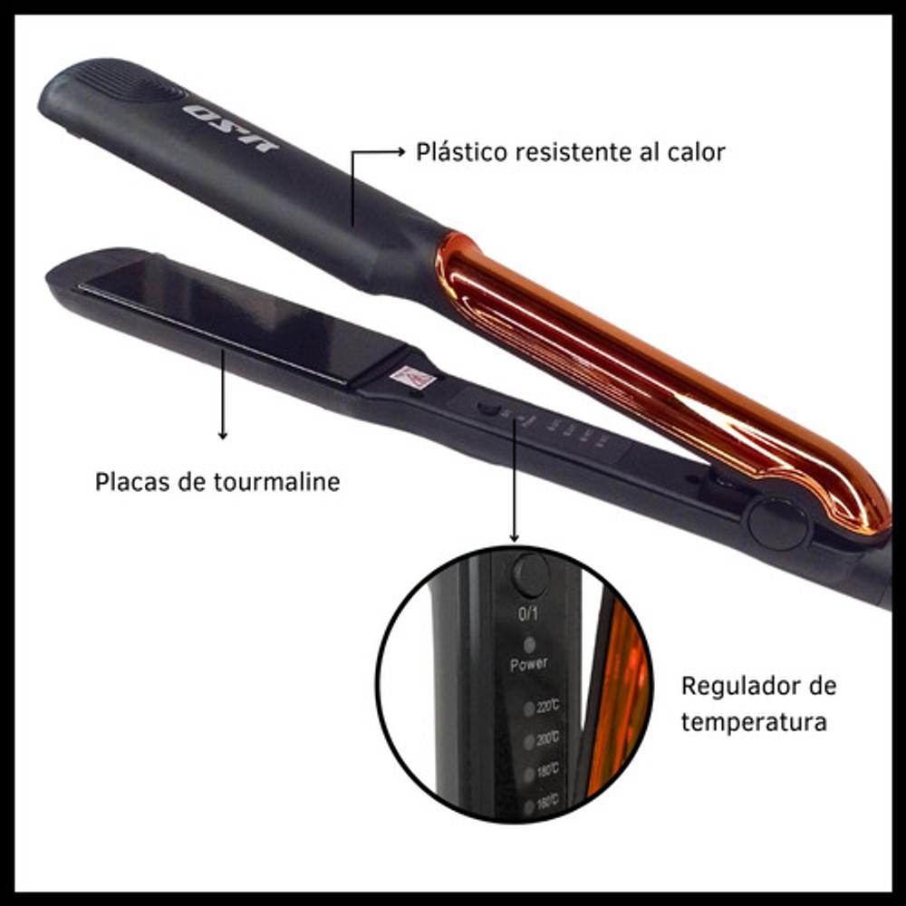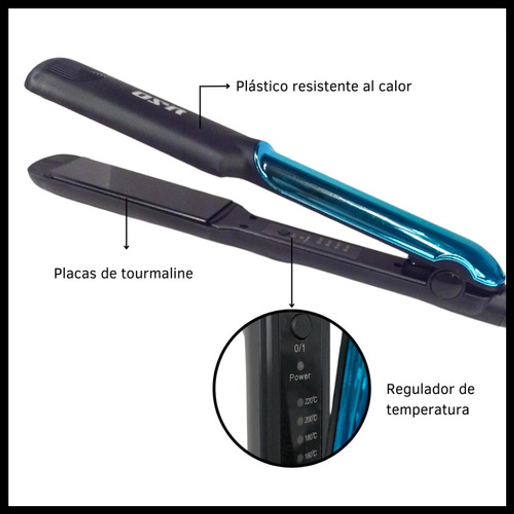 Características: • Temperatura máxima 220ºC • Diseño moderno y portátil • Control de temperatura • Calentamiento rápido • Placas tourmaline