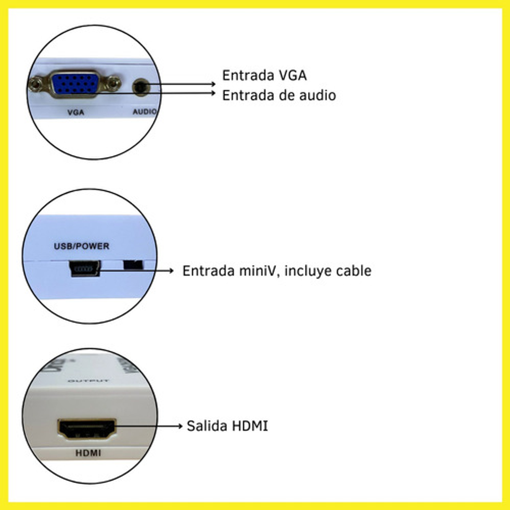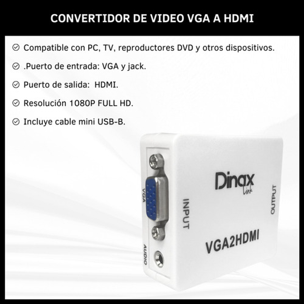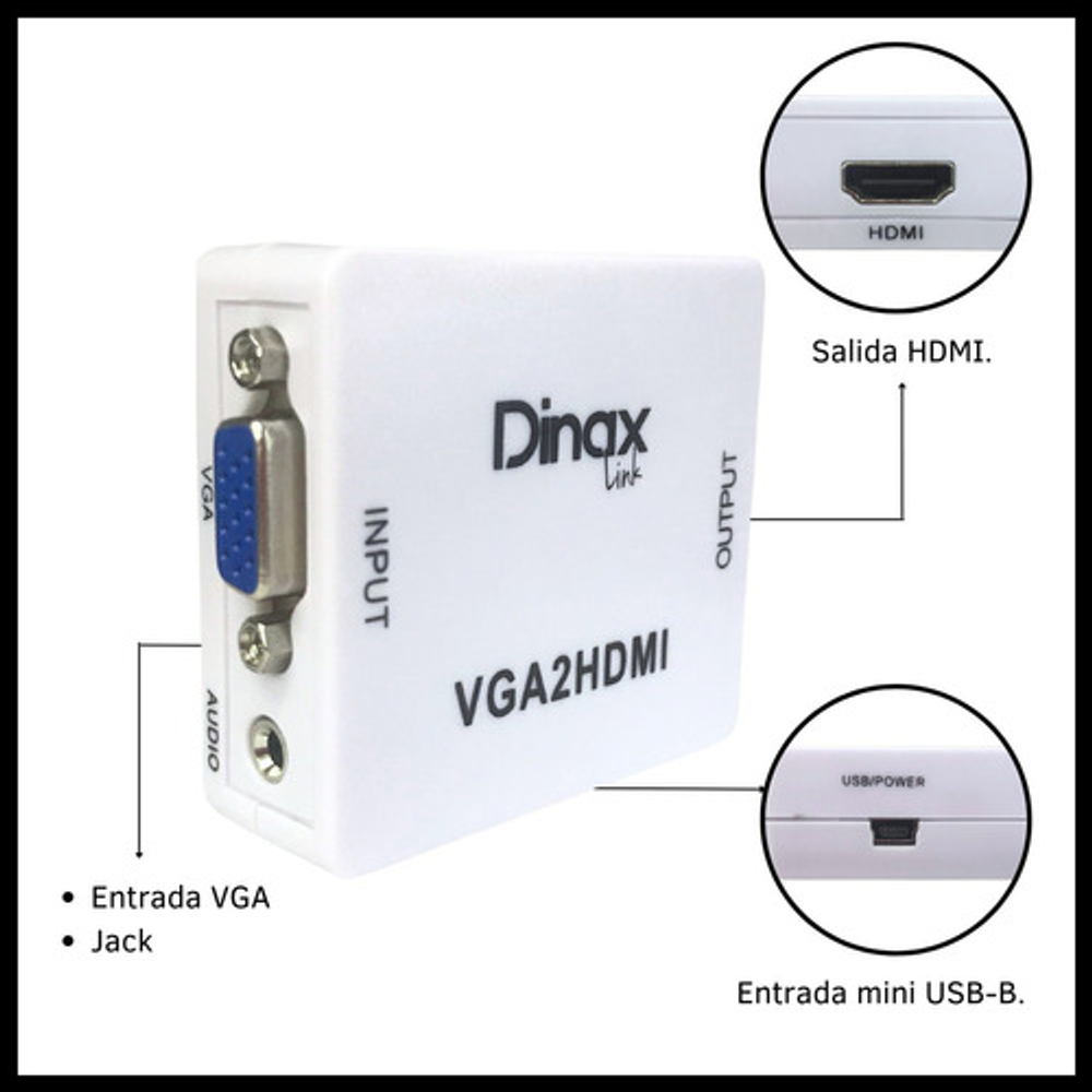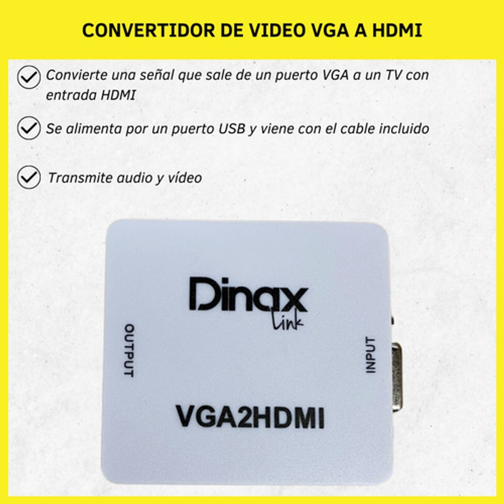 Este convertidor VGA a HDMI es la solución ideal para conectar computadoras o portátiles a una pantalla o televisor. Transmite audio y video con claridad. Su diseño compacto y portátil facilita su transporte e instalación. Se alimenta a través de un puerto USB e incluye el cable necesario. En caso de no disponer de un puerto USB cercano, puede utilizarse un adaptador de corriente de 220v a USB (similar al de los dispositivos móviles).
