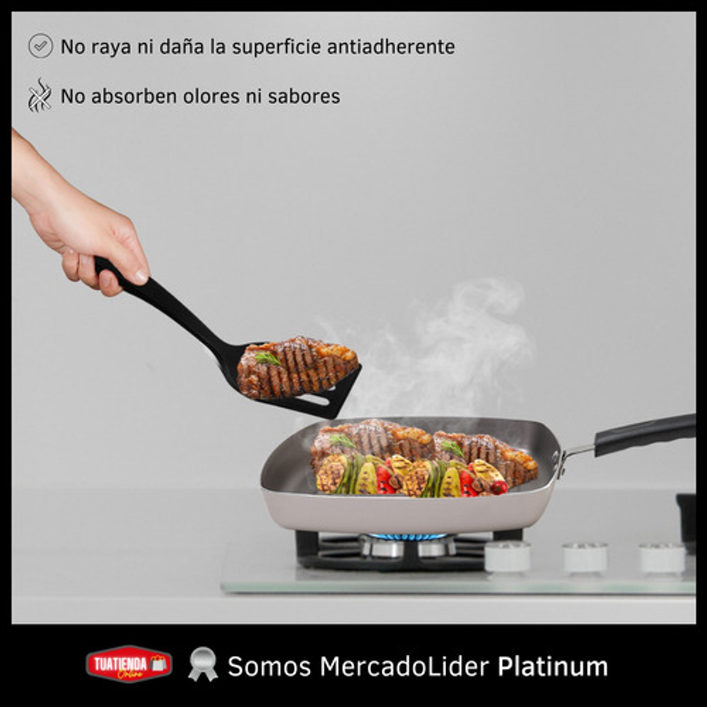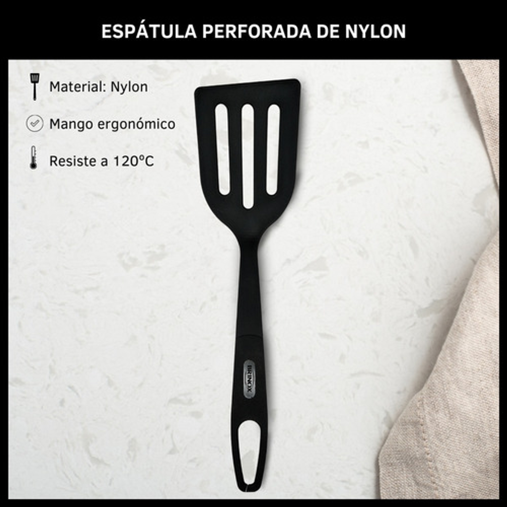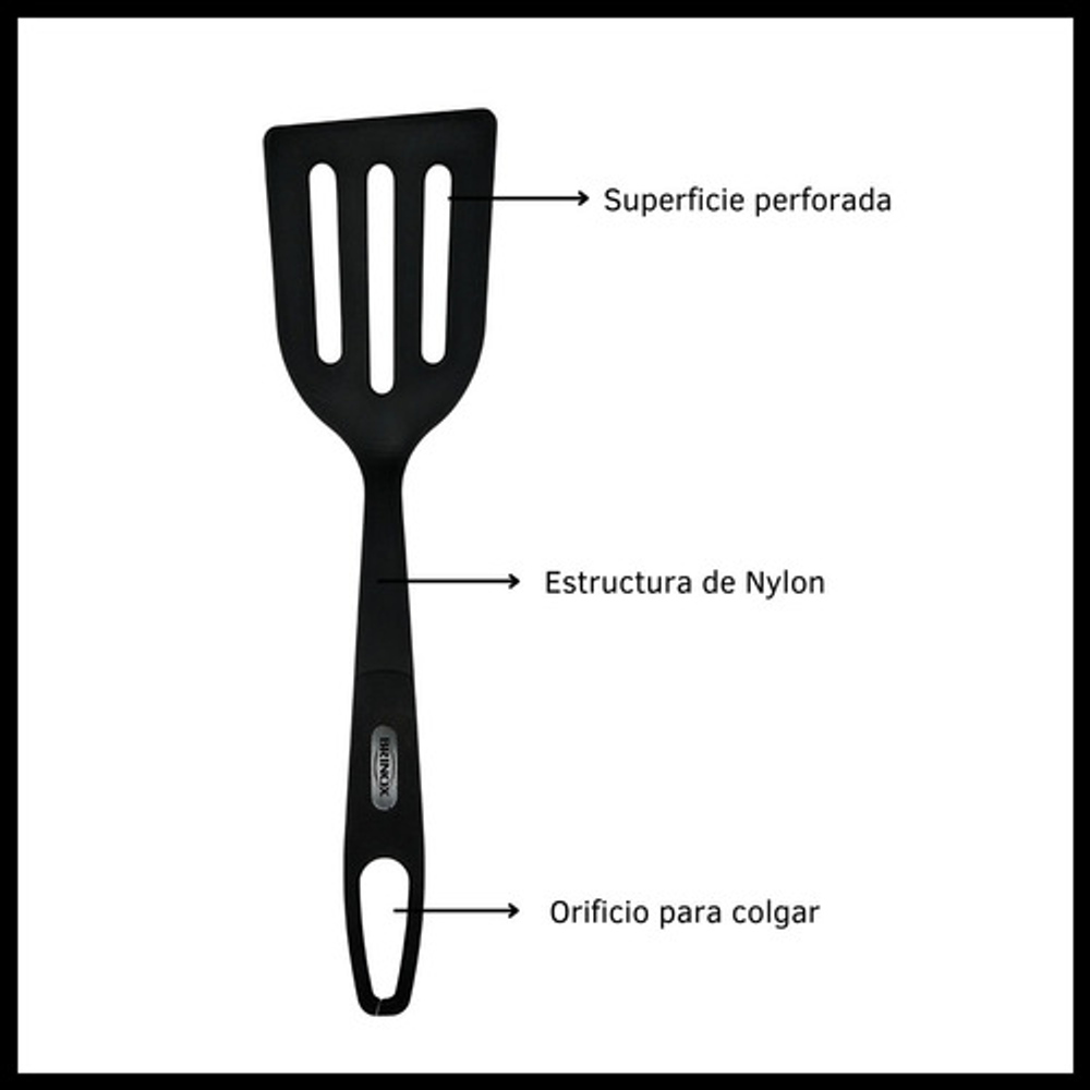 Caracteristicas: • Fabricada en nylon. • Resistente a altas temperaturas de hasta 120ºC. • Cuenta con una serie de ranuras en la superficie. • Mango ergonómico. • Orificio para colgarla y almacenarla fácilmente. • No absorbe olores ni sabores. • No raya ni daña la superficie antiadherente de tus sartenes y olla. • Apta para lavavajillas.