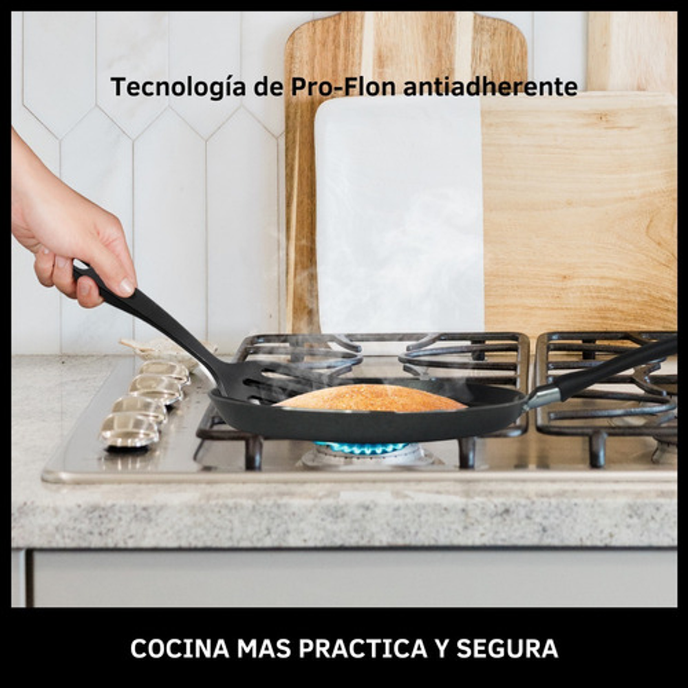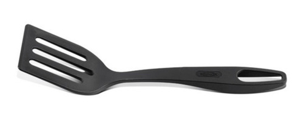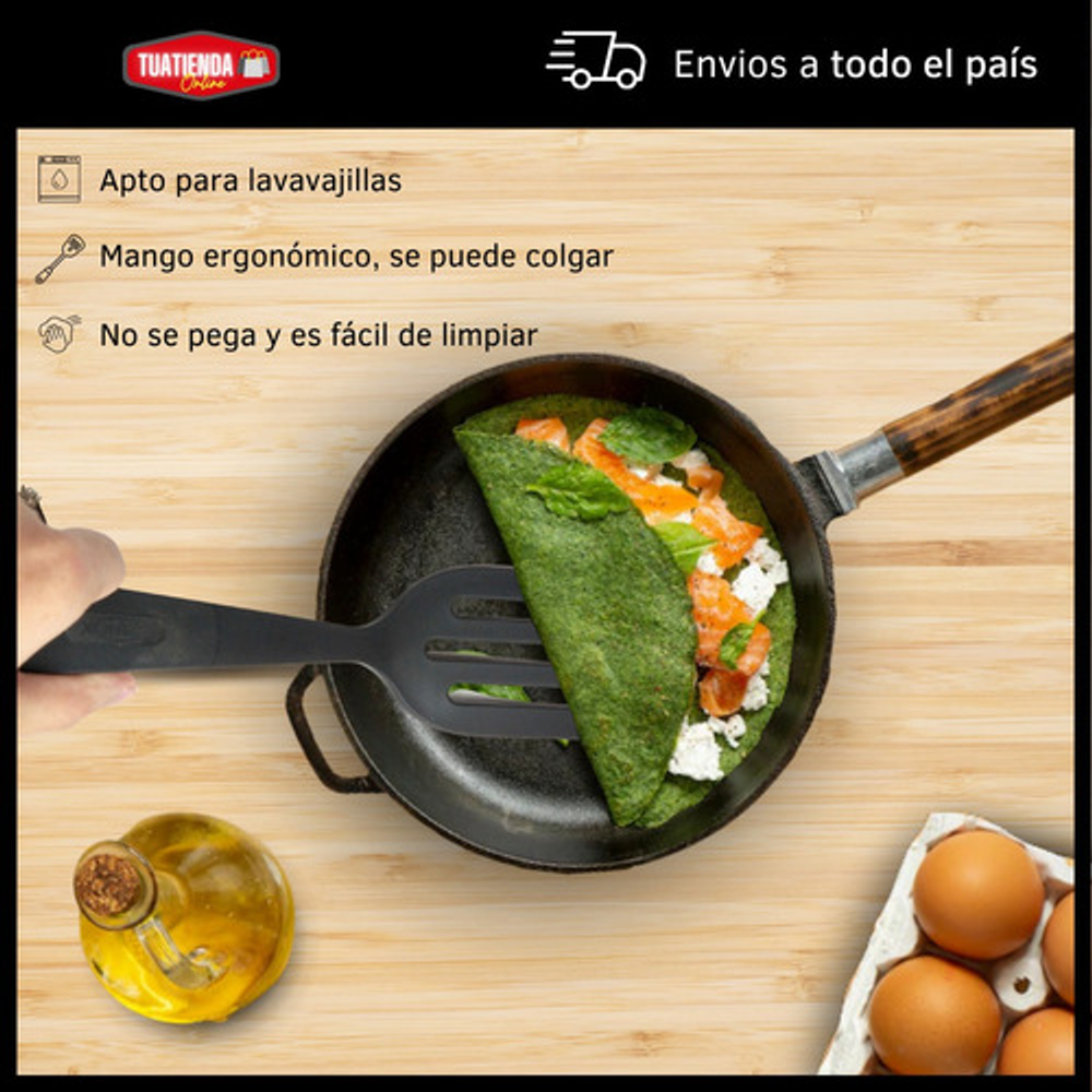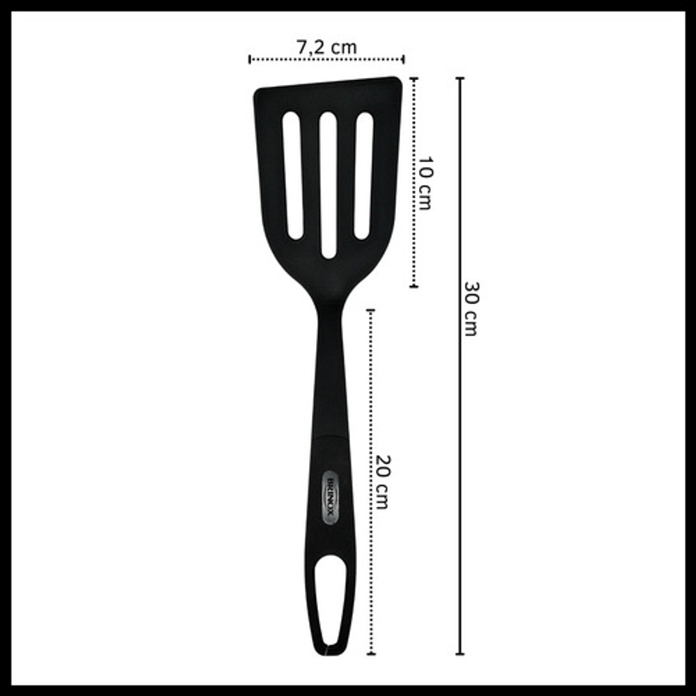 Caracteristicas: • Fabricada en nylon. • Resistente a altas temperaturas de hasta 120ºC. • Cuenta con una serie de ranuras en la superficie. • Mango ergonómico. • Orificio para colgarla y almacenarla fácilmente. • No absorbe olores ni sabores. • No raya ni daña la superficie antiadherente de tus sartenes y olla. • Apta para lavavajillas.