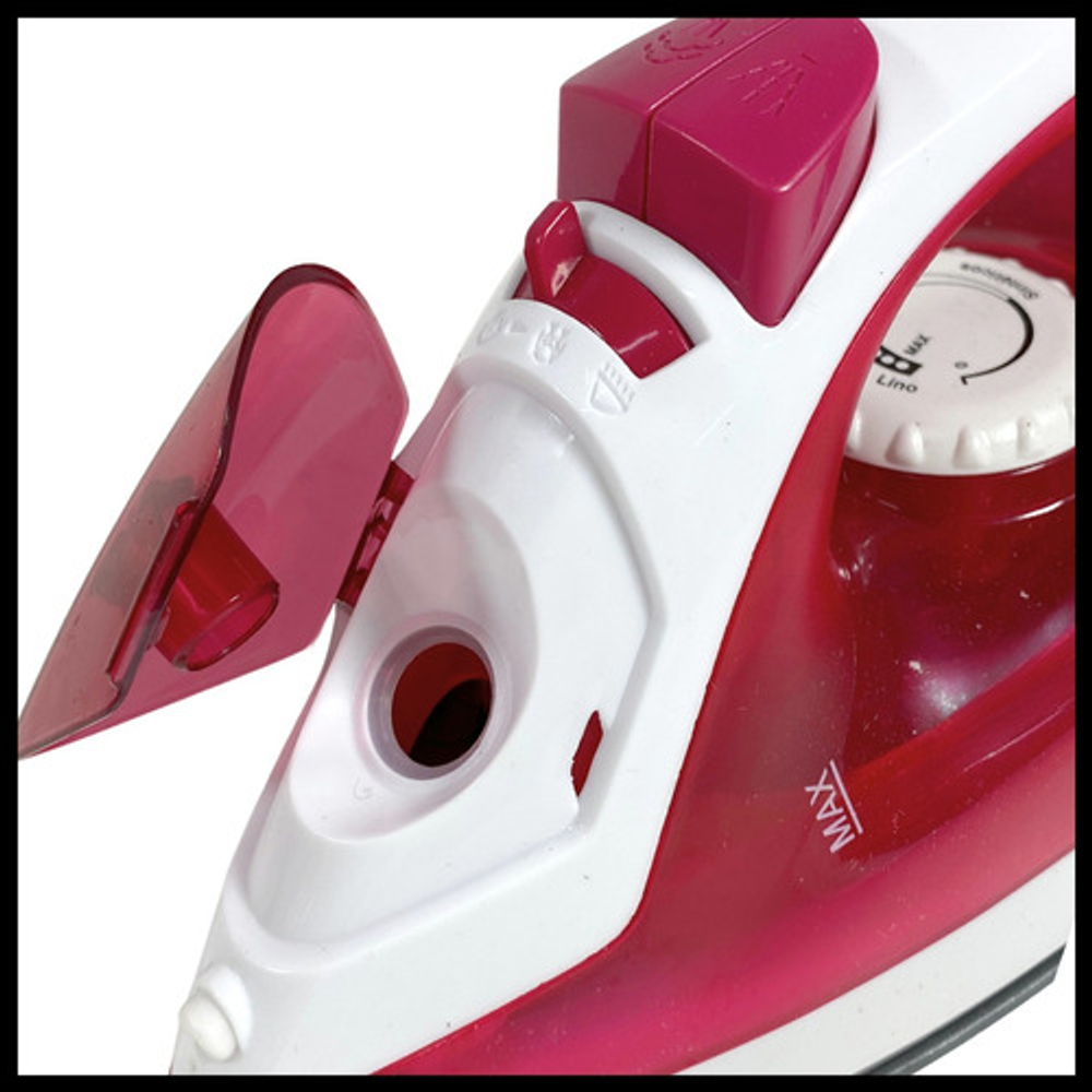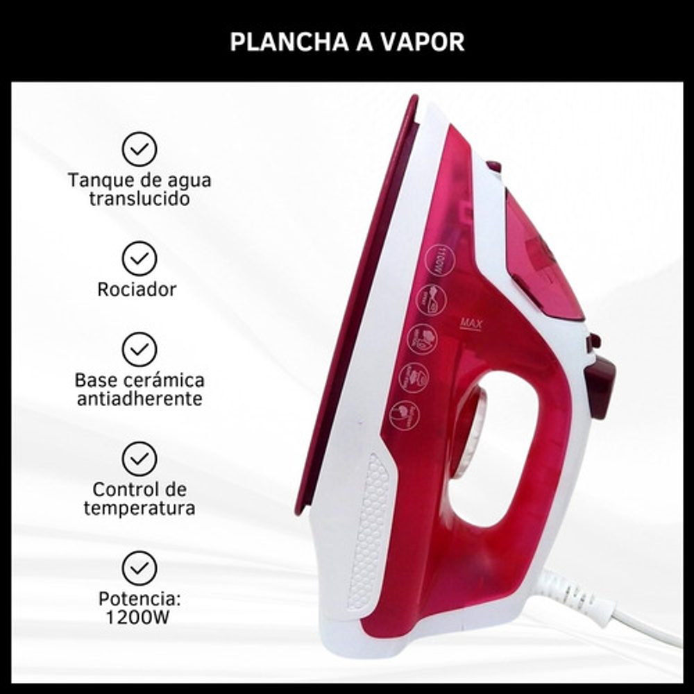 Características: -Base cerámica antiadherente. -Termostato regulable. -Piloto indicador de temperatura. -Con rociador y golpe de vapor. -Vapor variable. -Tanque de agua traslúcido. -Potencia: 1200W.