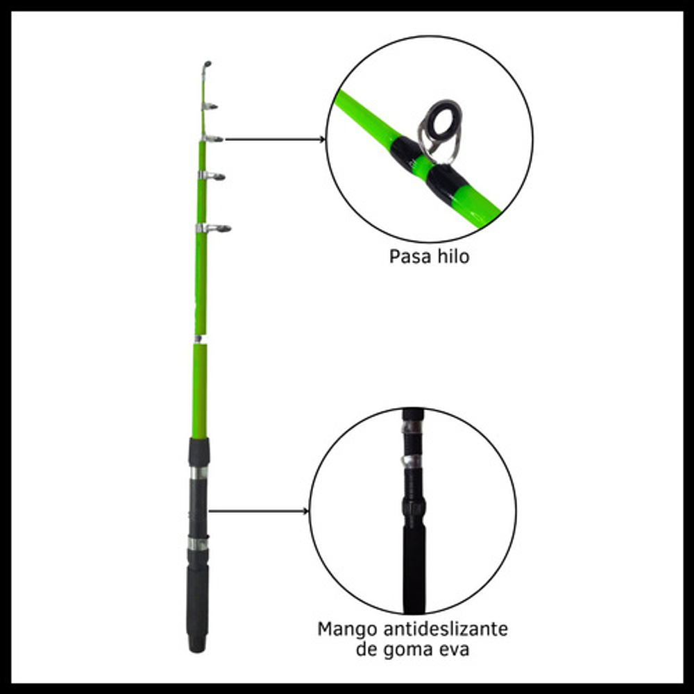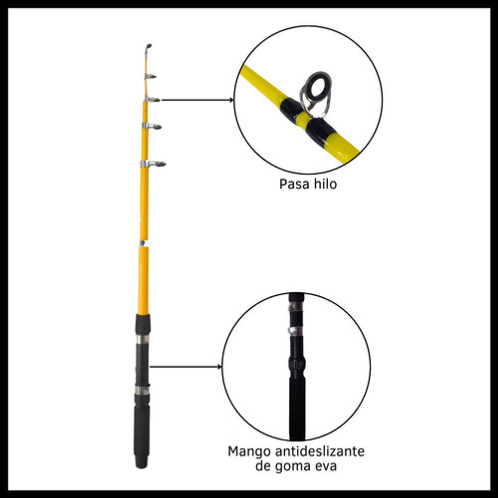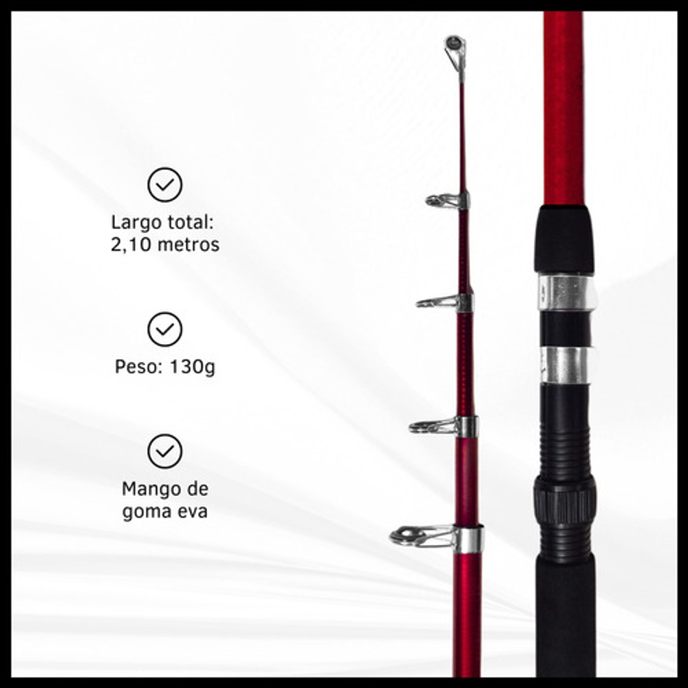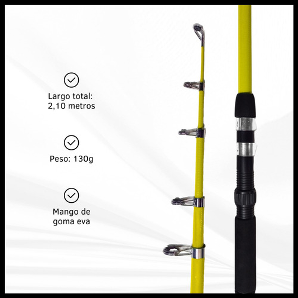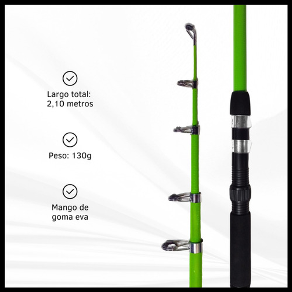 Características: • Con 5 pasa hilos, proporciona un soporte adecuado para la línea y ayuda a distribuir el peso de manera uniforme. • Mango de goma eva para un agarre cómodo y antideslizante. • Material de la caña: fibra de vidrio, resistente y flexible. • Sin estirar mide 44,5 cm, es fácil de transportar. • Caña de pesca variada: río, laguna, etc. • Peso de la caña: 130g. • Largo total: 2,10m.