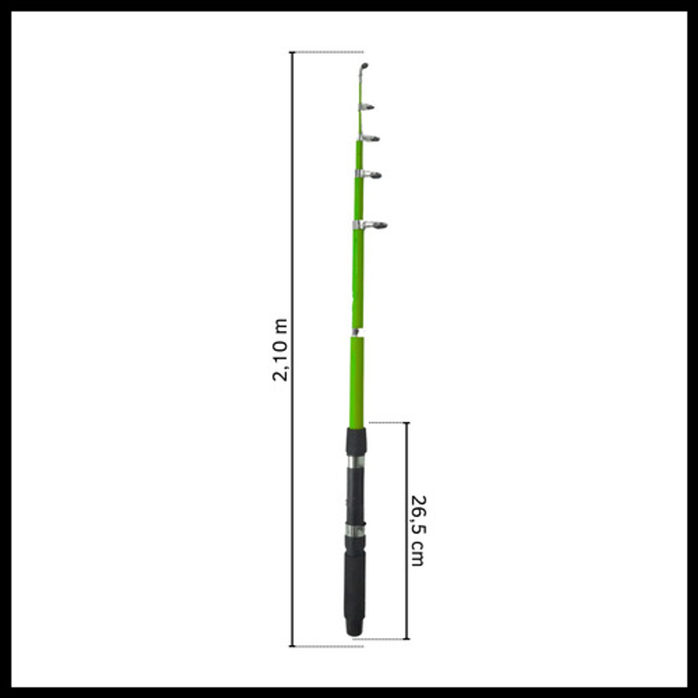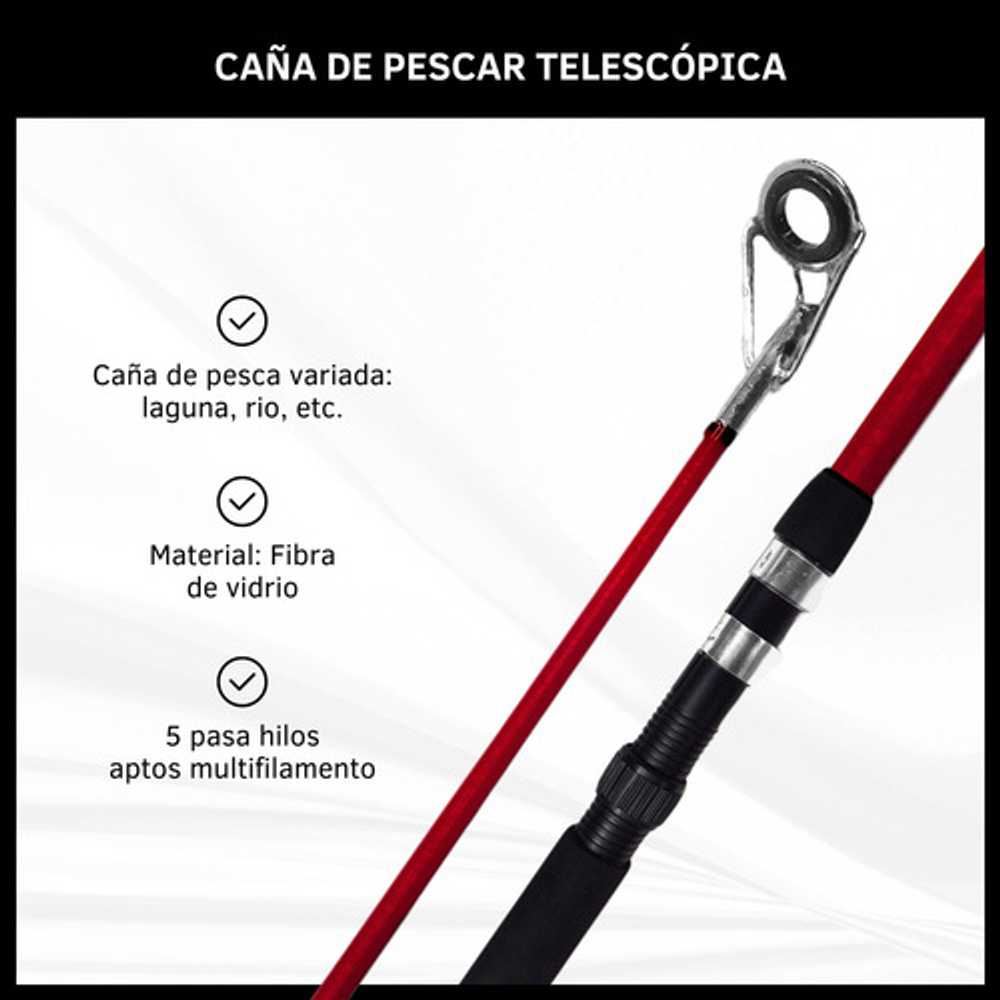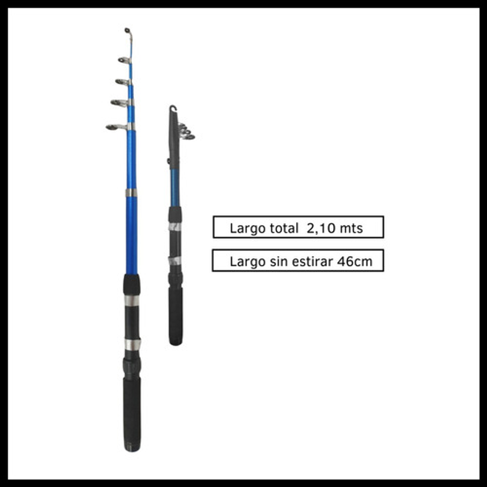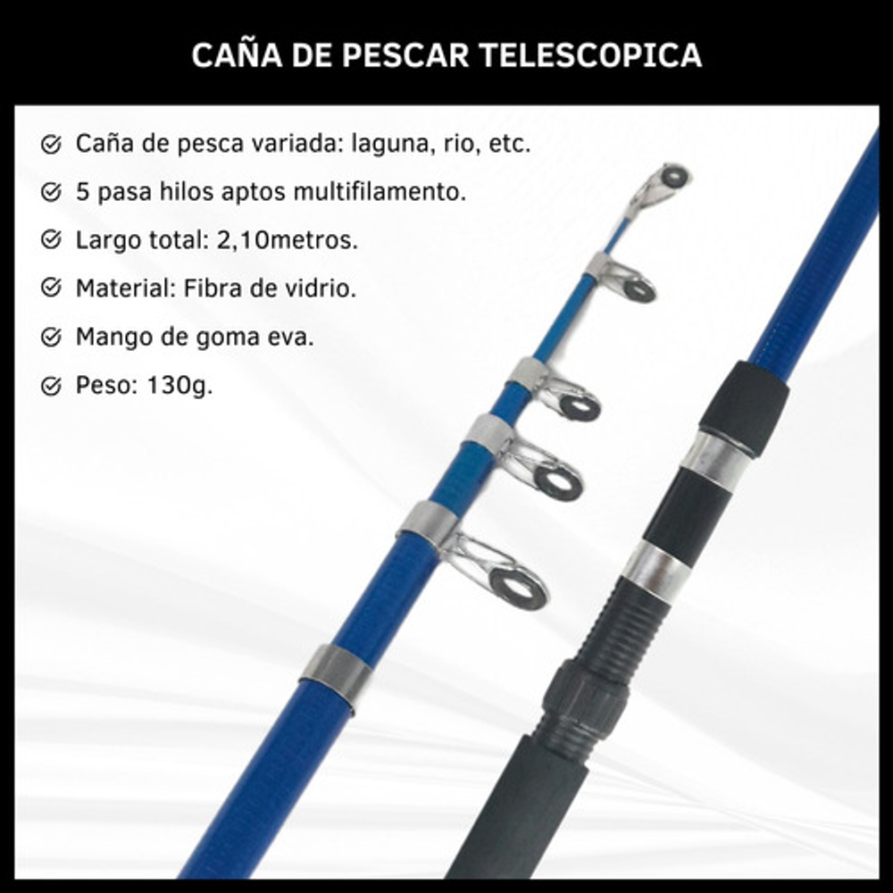 Características: • Con 5 pasa hilos, proporciona un soporte adecuado para la línea y ayuda a distribuir el peso de manera uniforme. • Mango de goma eva para un agarre cómodo y antideslizante. • Material de la caña: fibra de vidrio, resistente y flexible. • Sin estirar mide 44,5 cm, es fácil de transportar. • Caña de pesca variada: río, laguna, etc. • Peso de la caña: 130g. • Largo total: 2,10m.