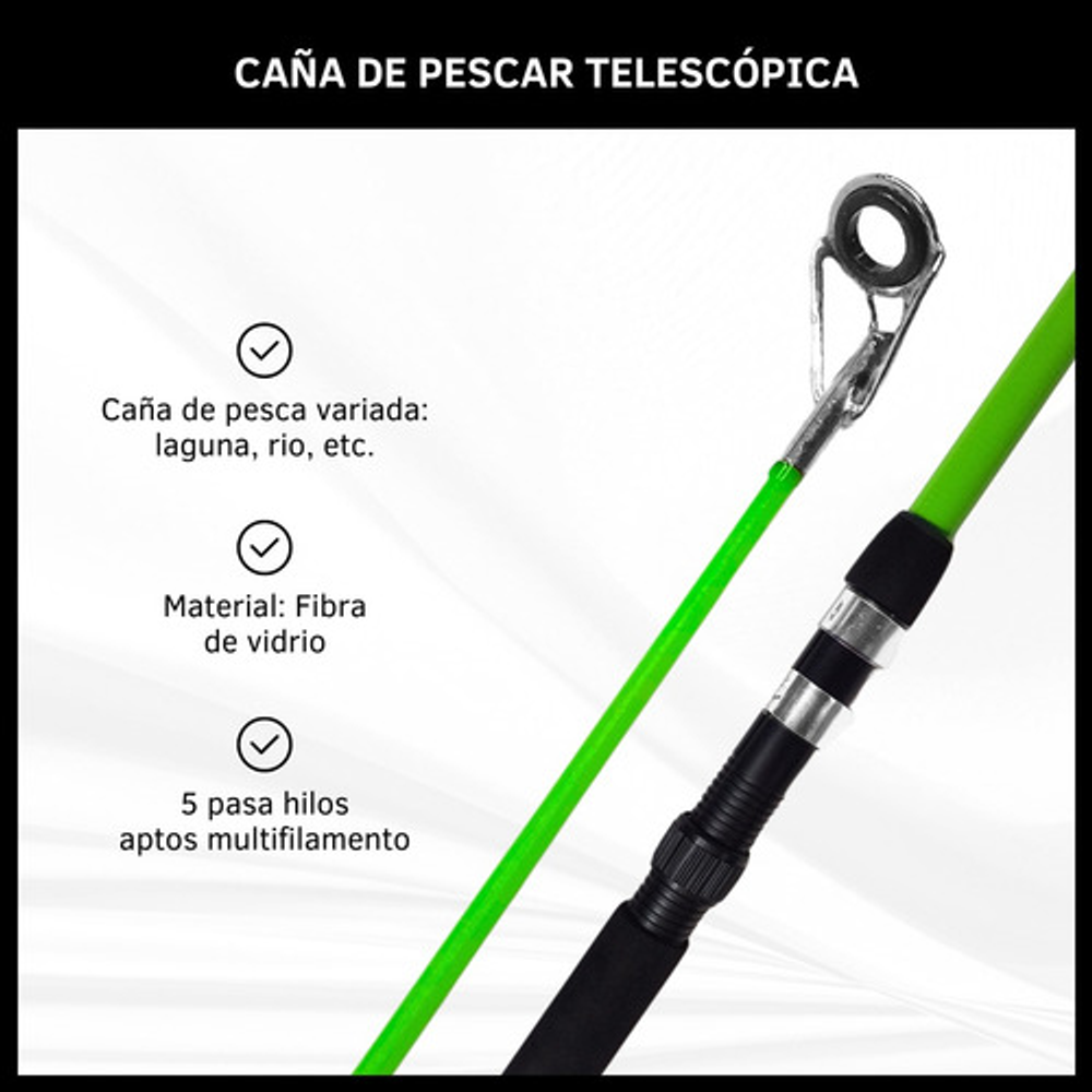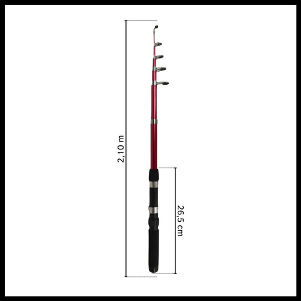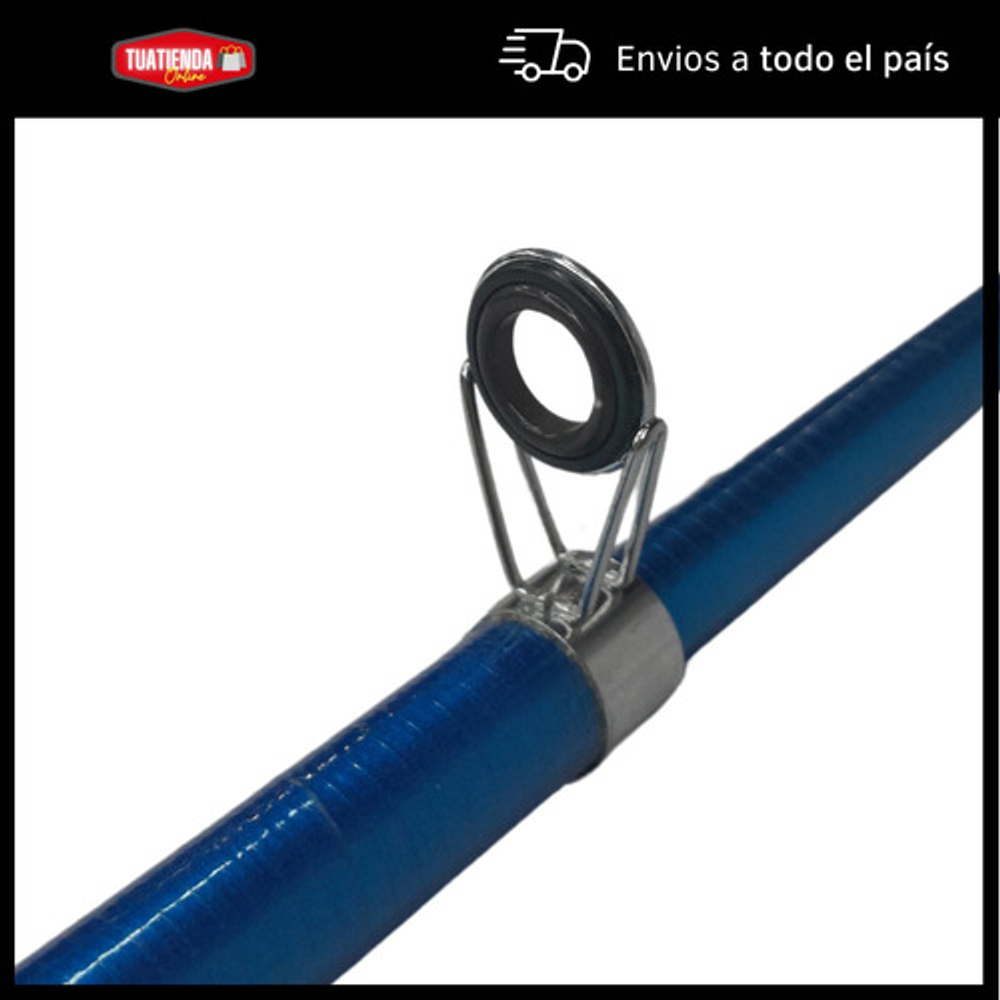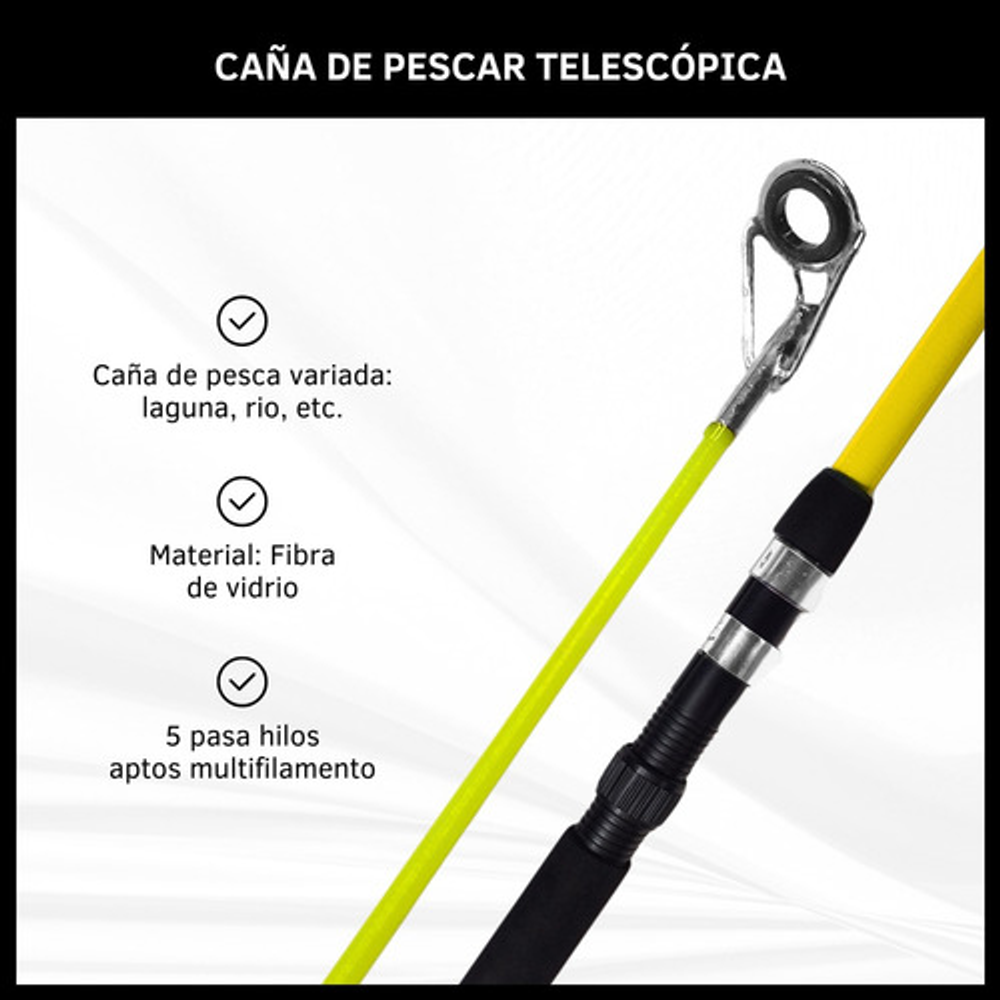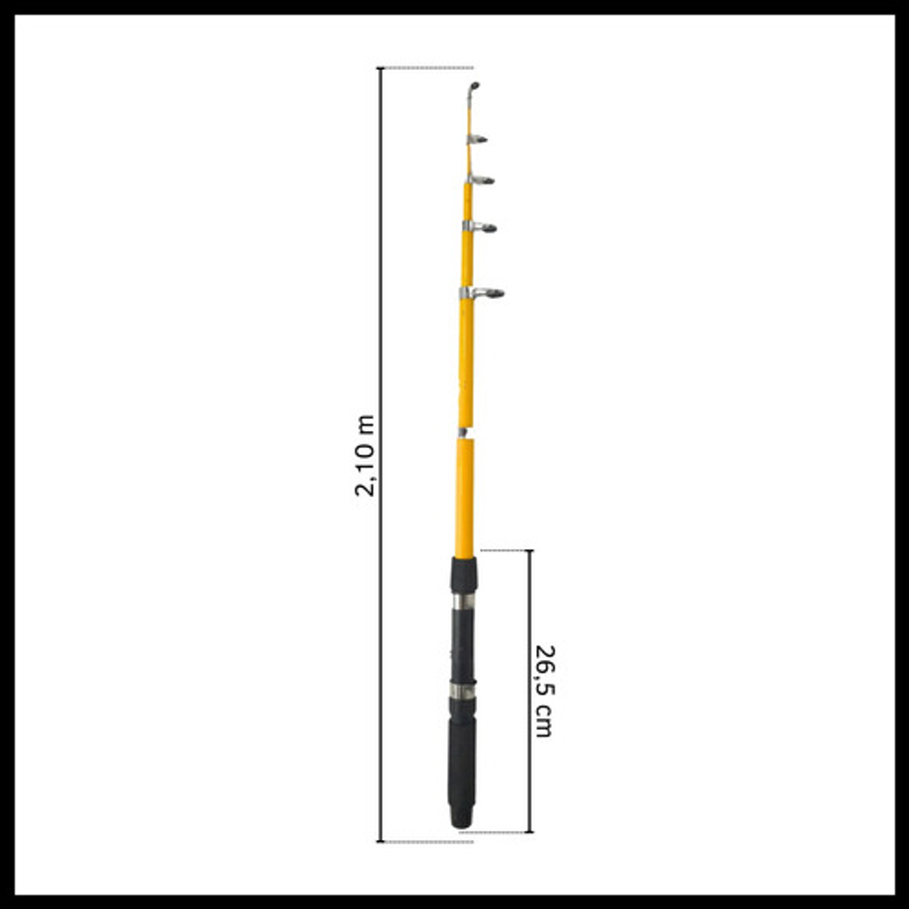 Características: • Con 5 pasa hilos, proporciona un soporte adecuado para la línea y ayuda a distribuir el peso de manera uniforme. • Mango de goma eva para un agarre cómodo y antideslizante. • Material de la caña: fibra de vidrio, resistente y flexible. • Sin estirar mide 44,5 cm, es fácil de transportar. • Caña de pesca variada: río, laguna, etc. • Peso de la caña: 130g. • Largo total: 2,10m.