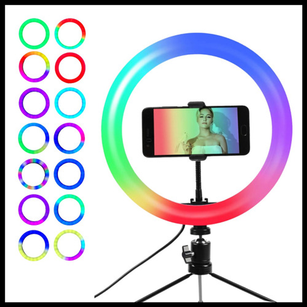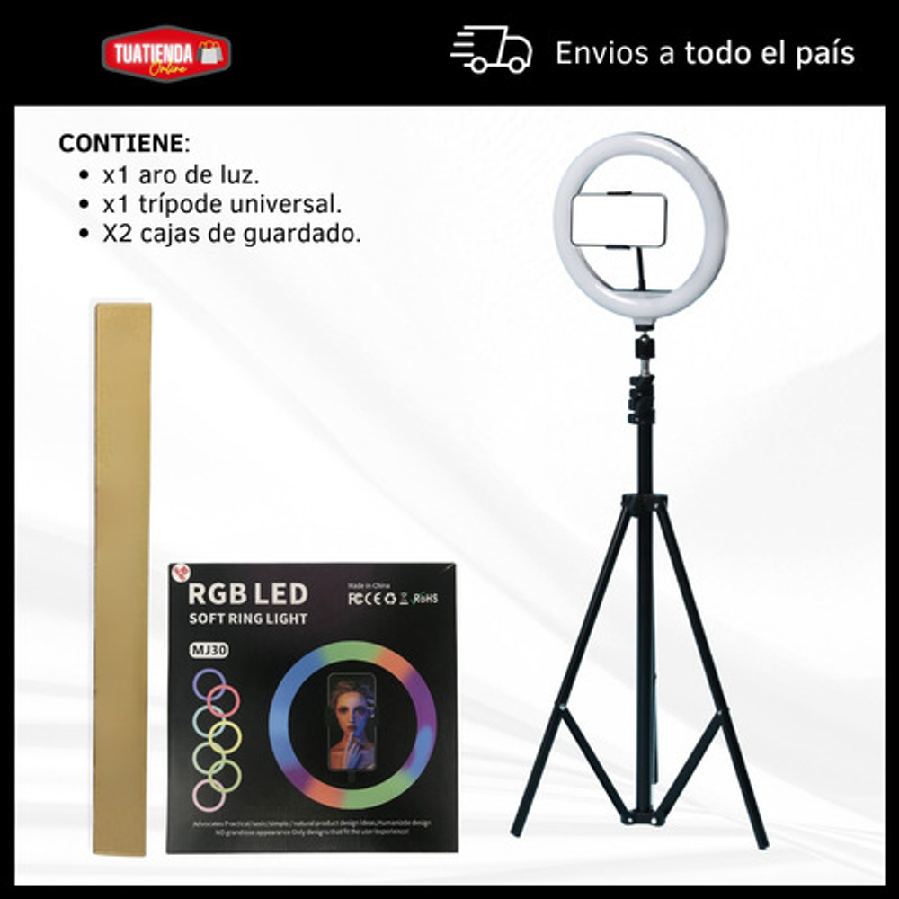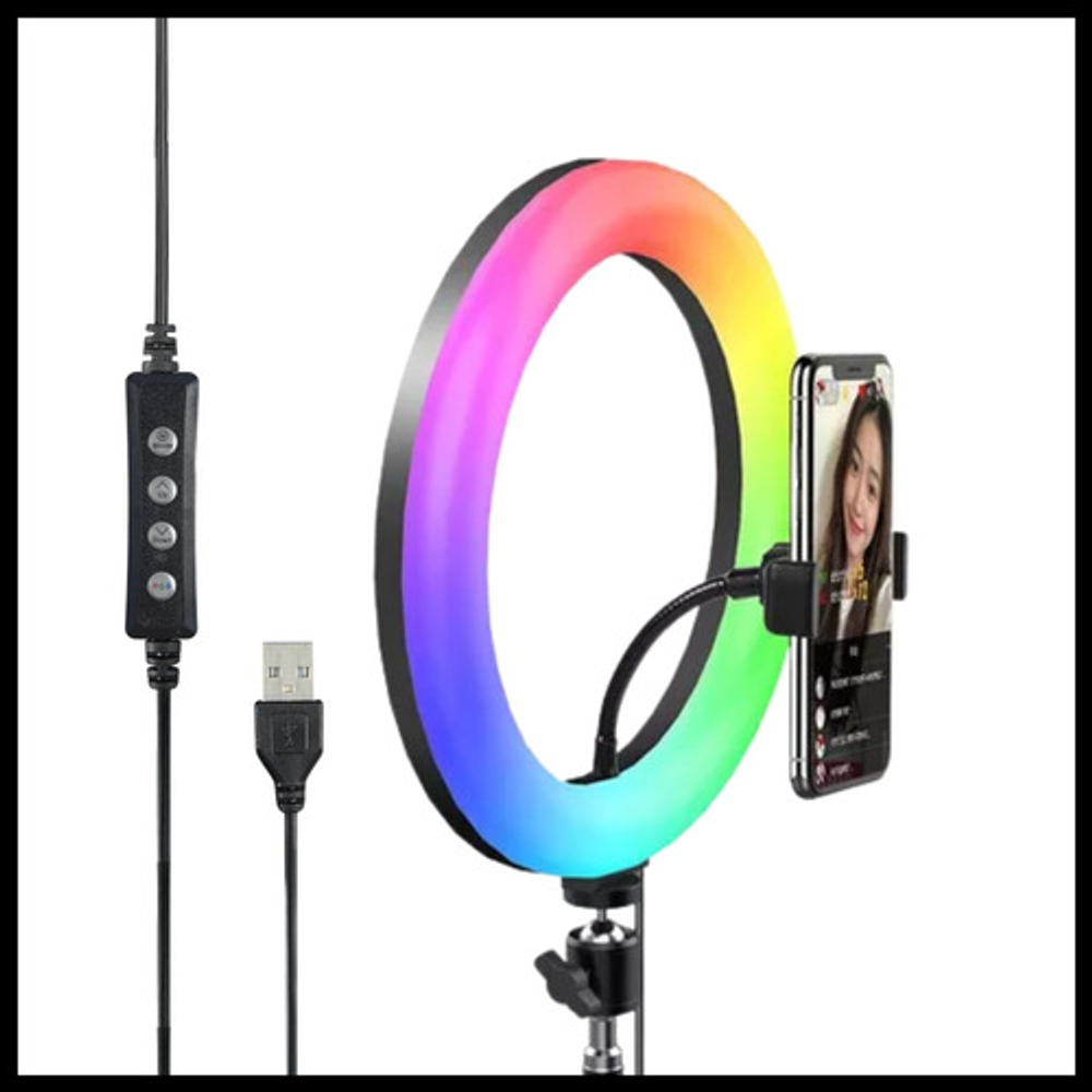 Características: -Diámetro 30 cm. -Colores RGB, blanco cálido y frio. -Ajuste de potencia de la luz. -Soporte para celular flexible. -Trípode -Alimentación USB.