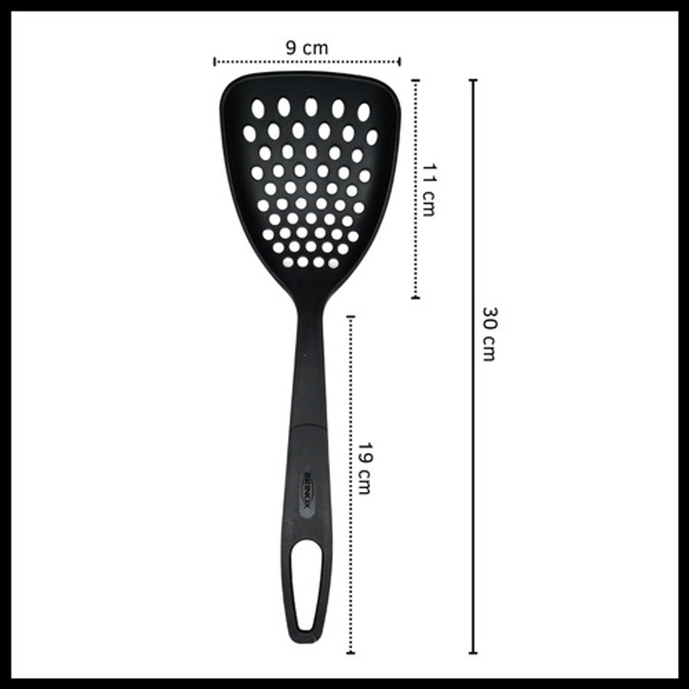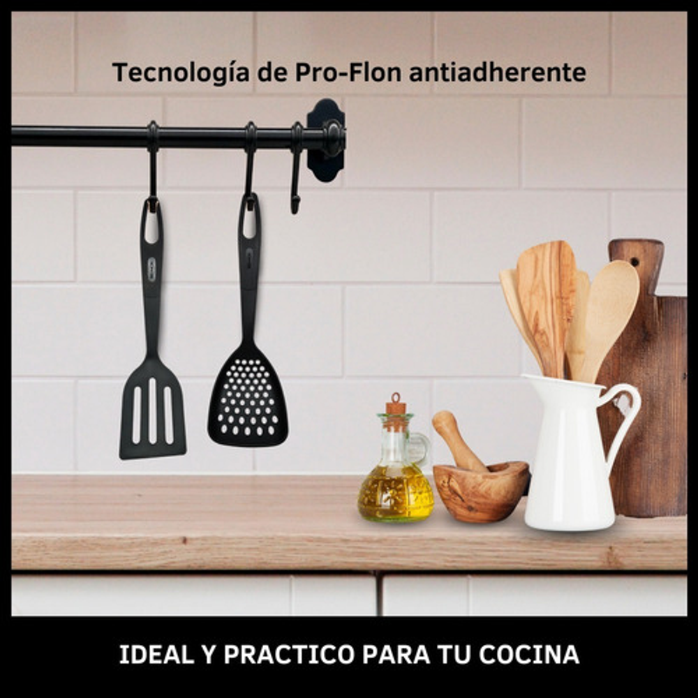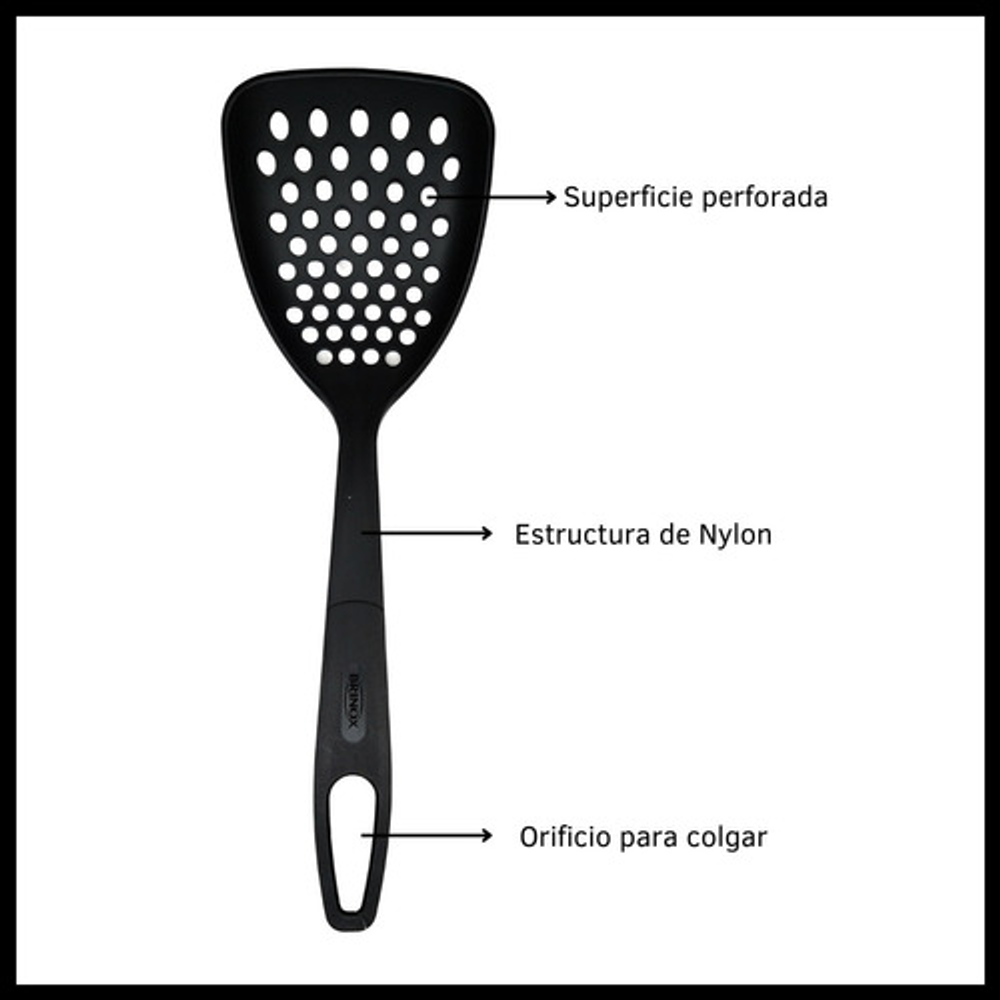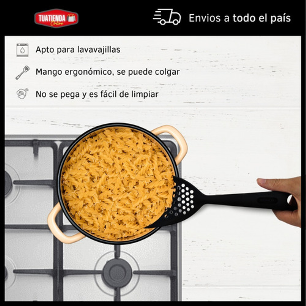 Caracteristicas: • Fabricada en nylon. • Resistente a altas temperaturas de hasta 120ºC. • Gran durabilidad y resistencia. • Mango ergonómico. • Orificio para colgarla y almacenarla fácilmente. • No absorbe olores ni sabores. • No rayará ni dañará su superficie. • Apta para lavavajillas.