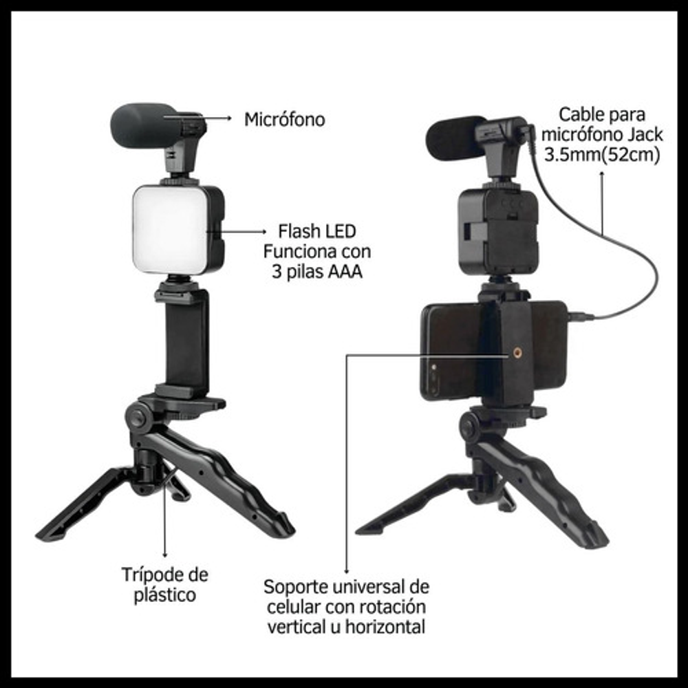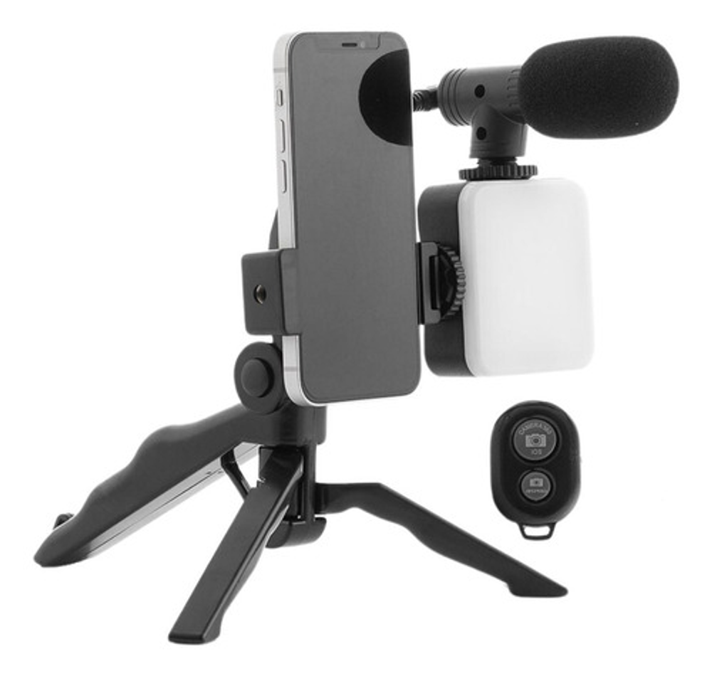 CARACTERISTICAS: -Trípode de plástico. -Soporte universal para celular -El soporte se puede utilizar de manera vertical u horizontal. -Micrófono con conexión Jack 3.5mm. -Control remoto Bluetooth (Incluye 1 pila) -Flash LED. Funciona con 3 pilas AAA (No incluidas).