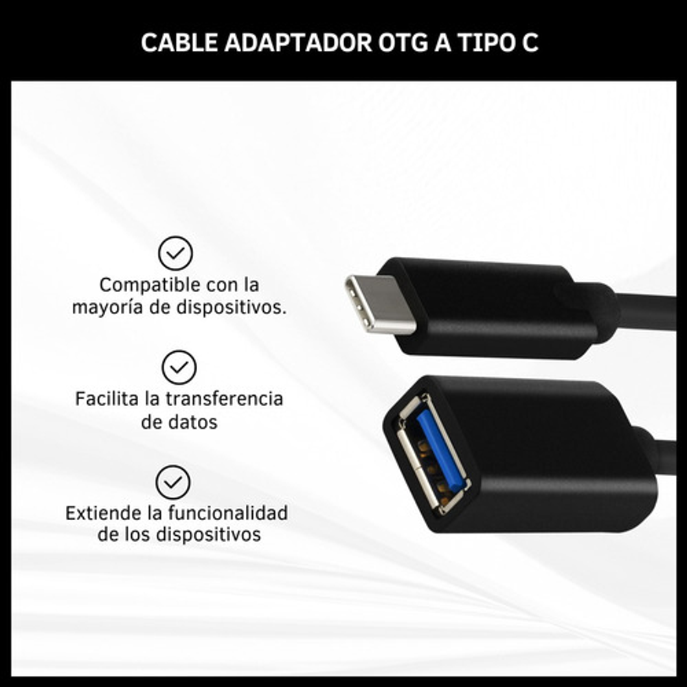 Características: -Facilita la transferencia de datos. -Extiende la funcionalidad de tus dispositivos. -Permite conectar de manera fácil y rápida una amplia gama de dispositivos USB a tus celulares, tablets y computadoras.