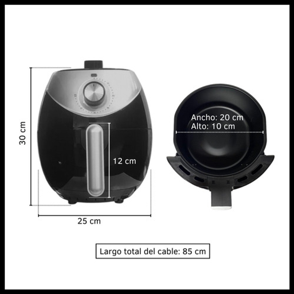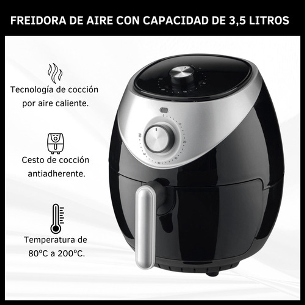 Características: -Contiene un canasto antiadherente con rejilla removible. -Largo del cable: 85 cm. -Tecnología de cocción por aire caliente. -Control de temperatura: 80ºC a 200ºC. -Control de tiempo: máx. 60 minutos. -Luz indicadora de uso. -Capacidad: 3.5 litros. -Apagado automático. -Potencia 1400W.