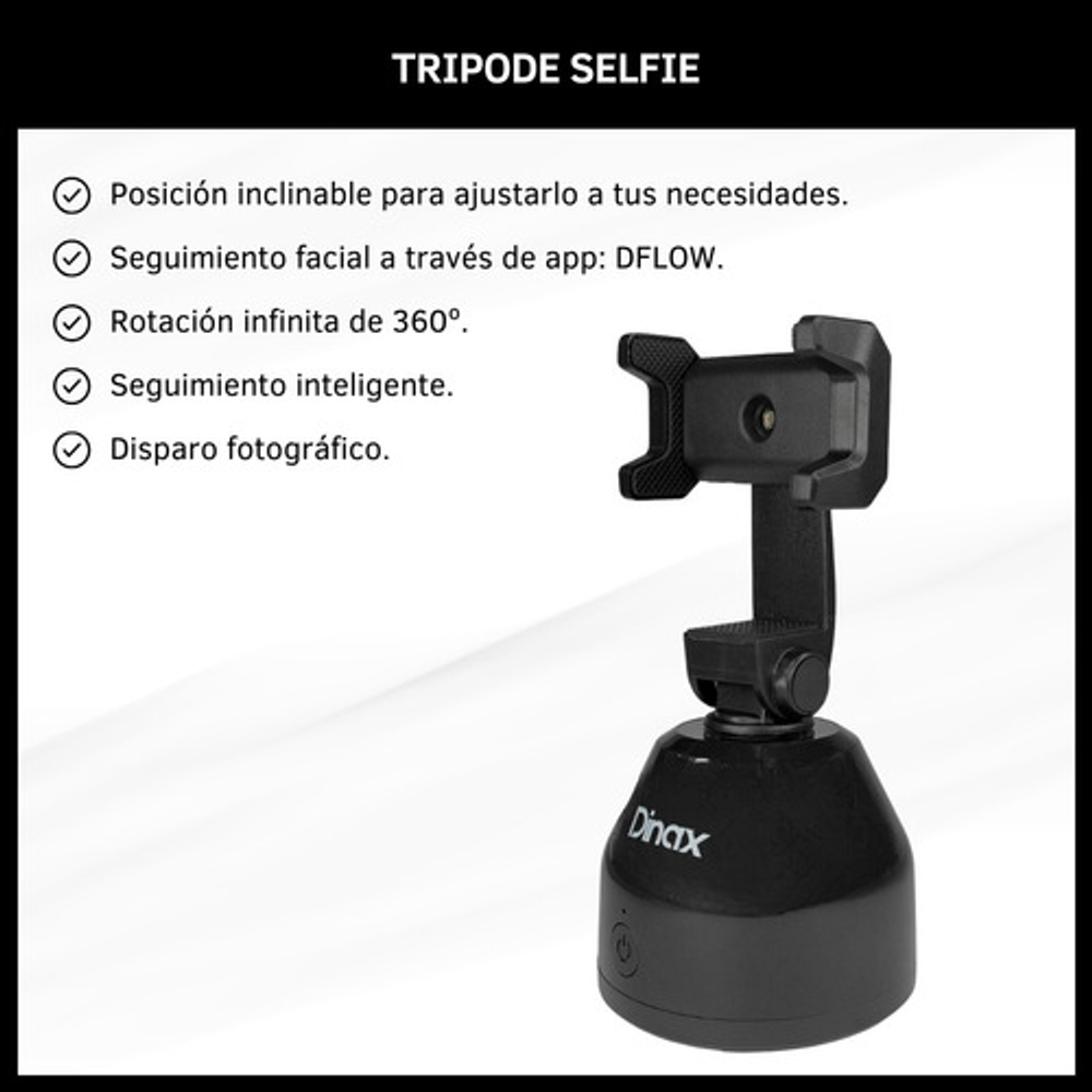 Diseñado para realizar sesiones de fotos y videos con manos libres de manera fácil y cómoda. Requiere la instalación de la aplicación "DFLOW", compatible con iOS 10.0 y posterior y con Android 8.1 y posterior.