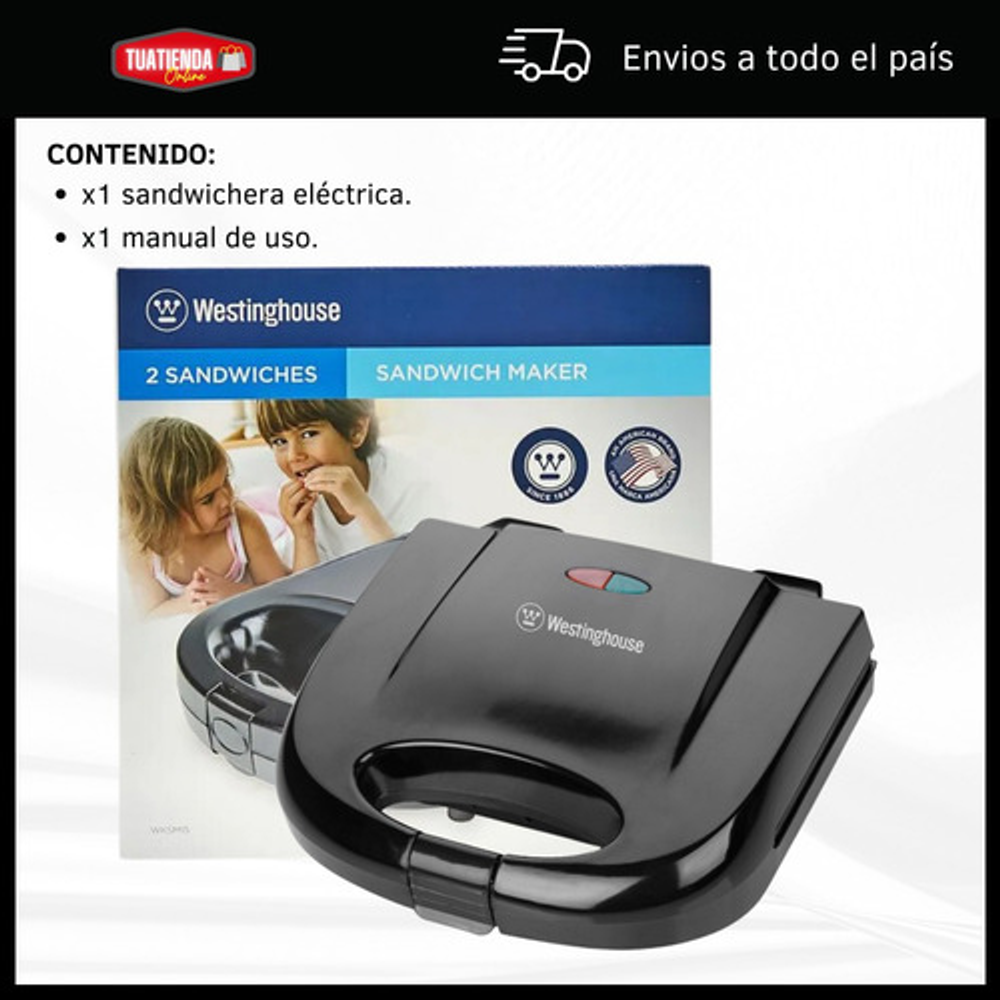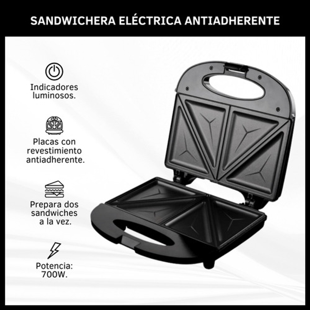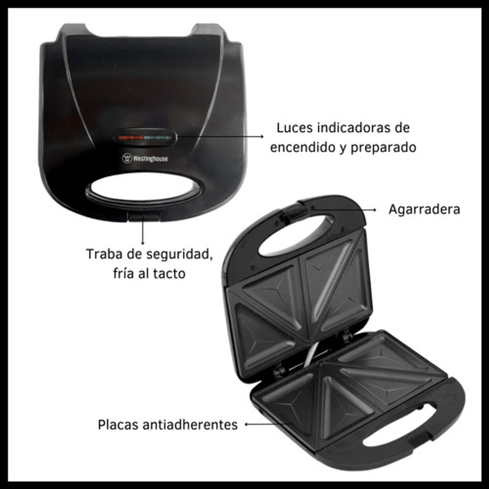 Características: -Placas con revestimiento antiadherente. -Prepara dos sándwiches a la vez. -Manija con traba, fría al tacto. -Cocción rápida y uniforme. -Luces indicadoras de uso. -Largo del cable: 70 cm. -Base antideslizante. -Potencia: 700W. -Fácil de limpiar.