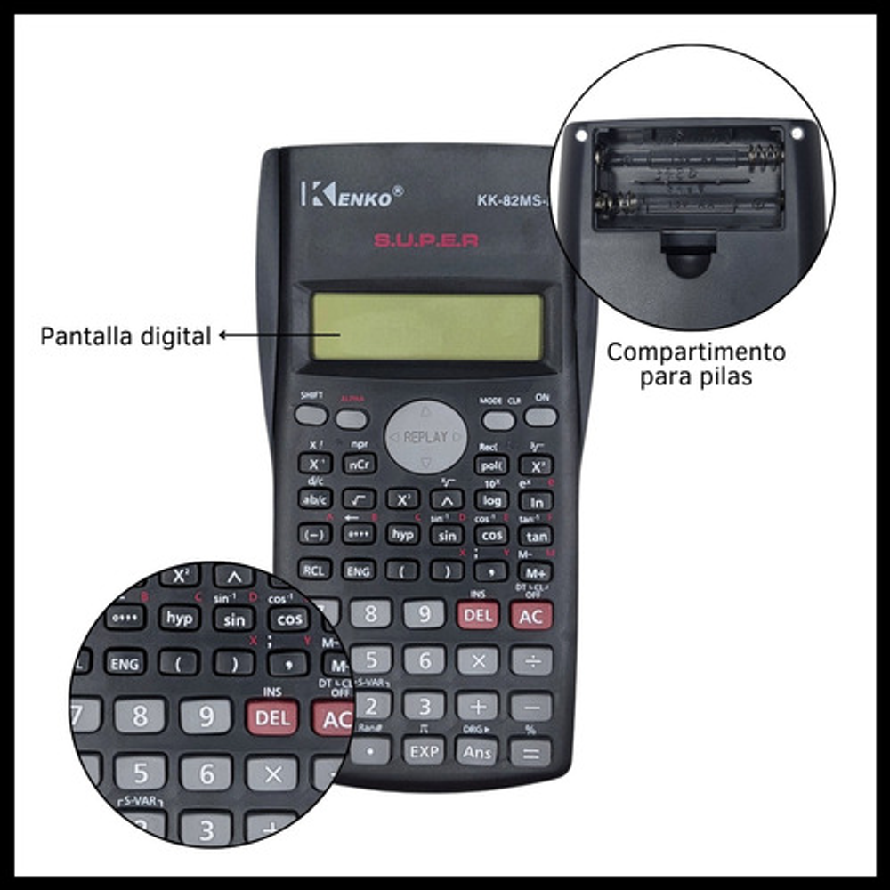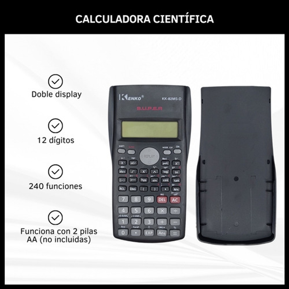 Características: • Ideal para todo tipo de cálculos • Pantalla digital • 12 Dígitos • 240 Funciones • Funciona con 2 pilas AA • Viene con tapa