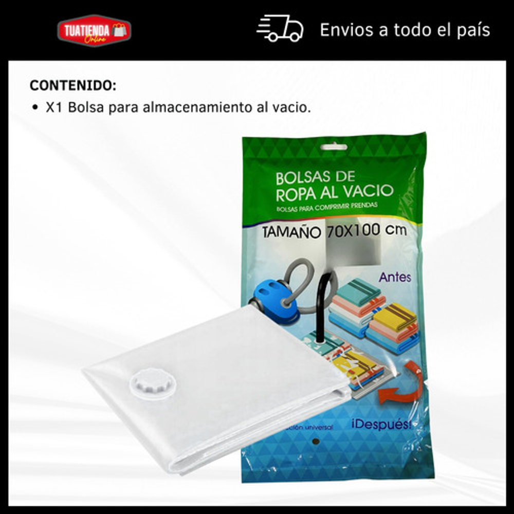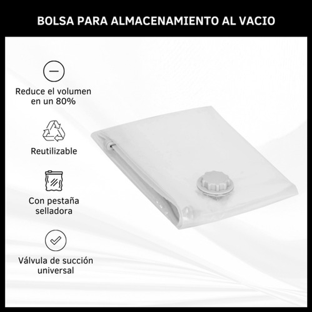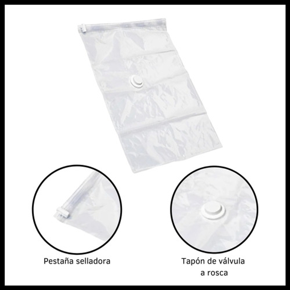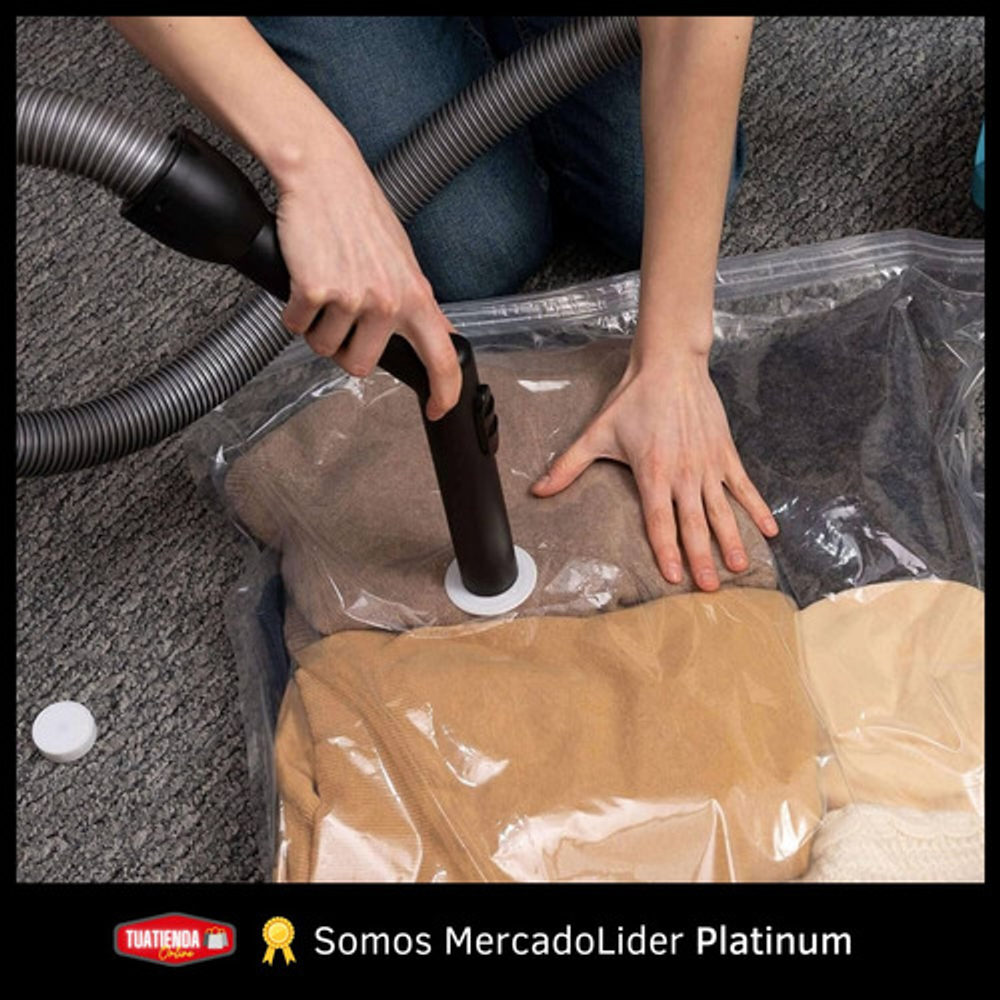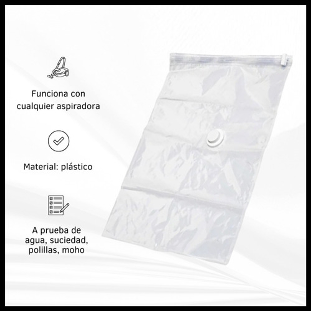 Características: • A prueba de agua, suciedad, polillas, moho. • Funciona con cualquier aspiradora. • Reduce el volumen en un 80%. • Válvula de succión universal. • Con pestaña selladora. • Material: plástico. • Reutilizable.