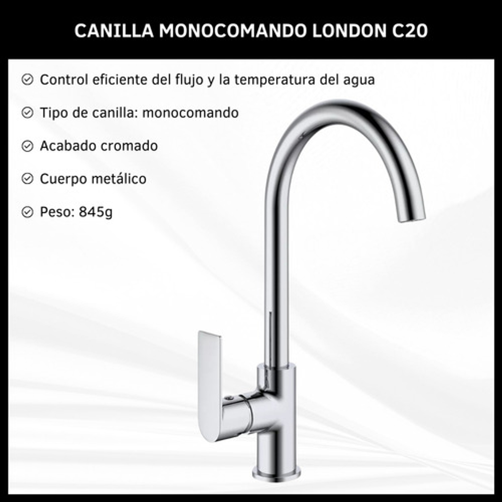 Características: • Tipo de canilla: Monocomando. • Pico aireador anti salpicaduras. • Cuerpo metálico. • Acabado cromado. • Cierre cerámico. • Incluye todos los elementos para su instalación.