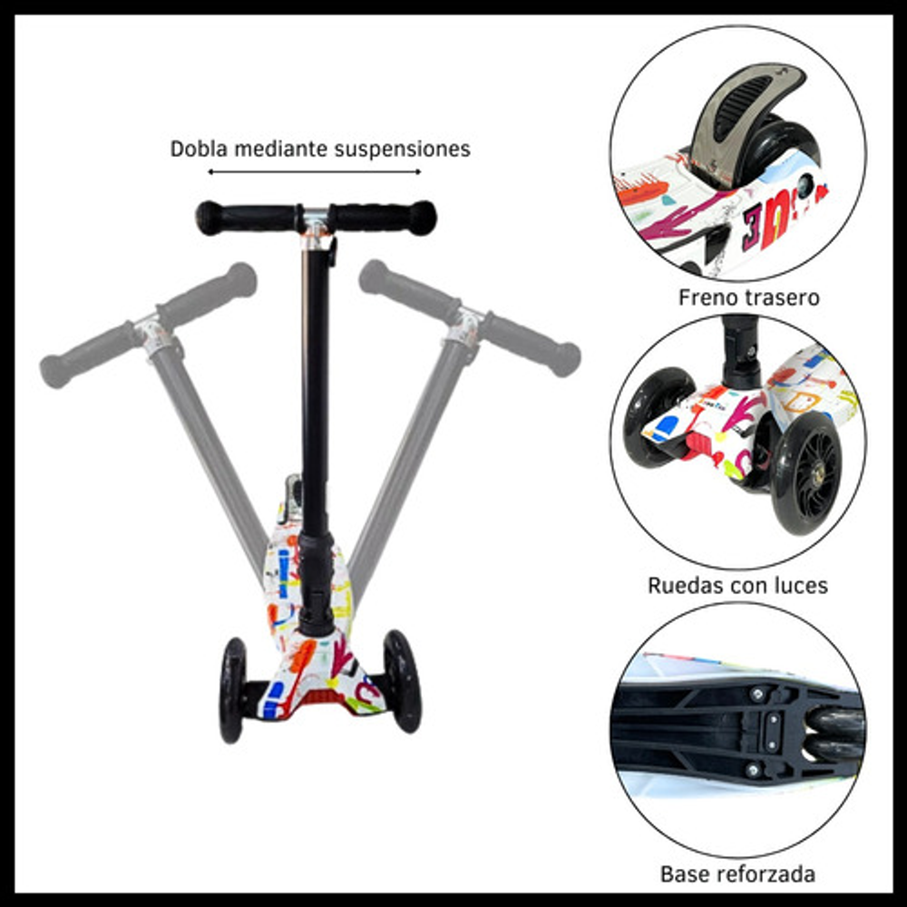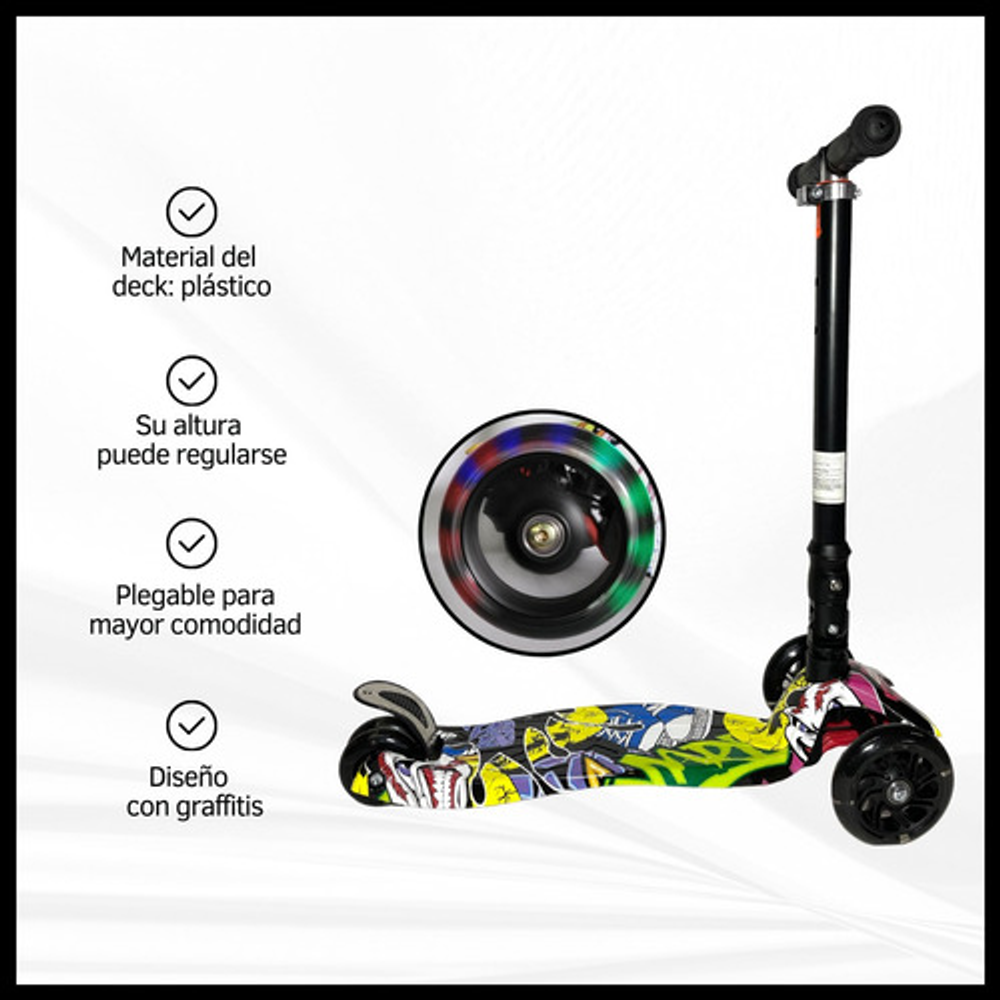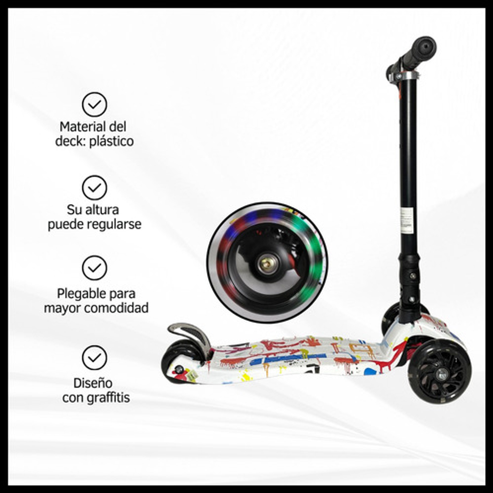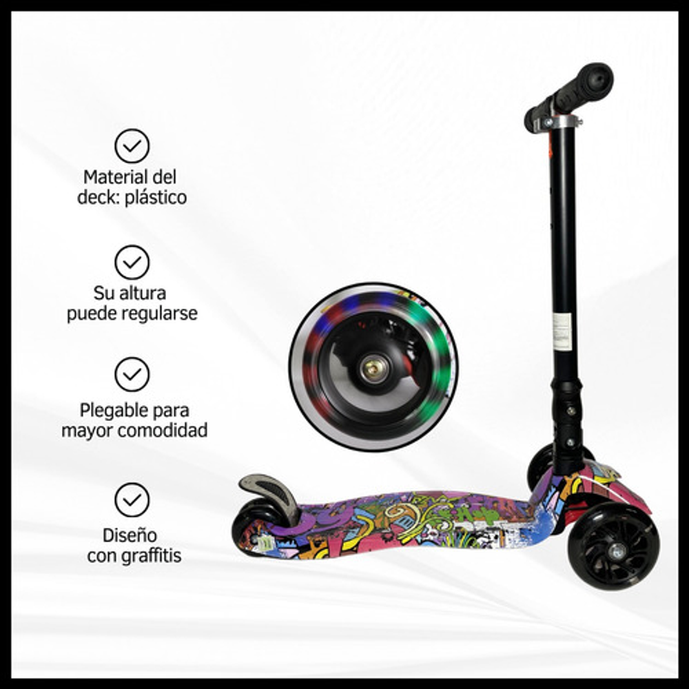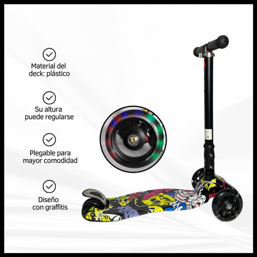 Características: • Luces en las ruedas que se activan con el movimiento lo que lo hace más divertido para los niños. • Material del deck: Plástico resistente. • Dobla mediante suspensiones que brindan una conducción más suave y cómoda, absorbiendo los impactos y vibraciones del terreno. • Su diseño plegable facilita el transporte y el almacenamiento del monopatín. • Posee cuatro ruedas, ideal para principiantes y niños pequeños. • Soporta entre 25 y 35 kg. • Altura regulable.