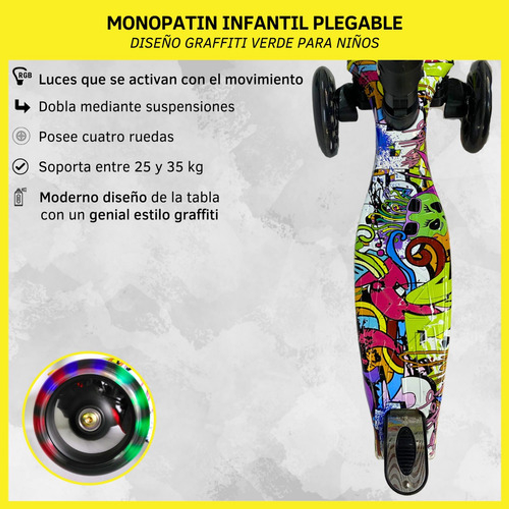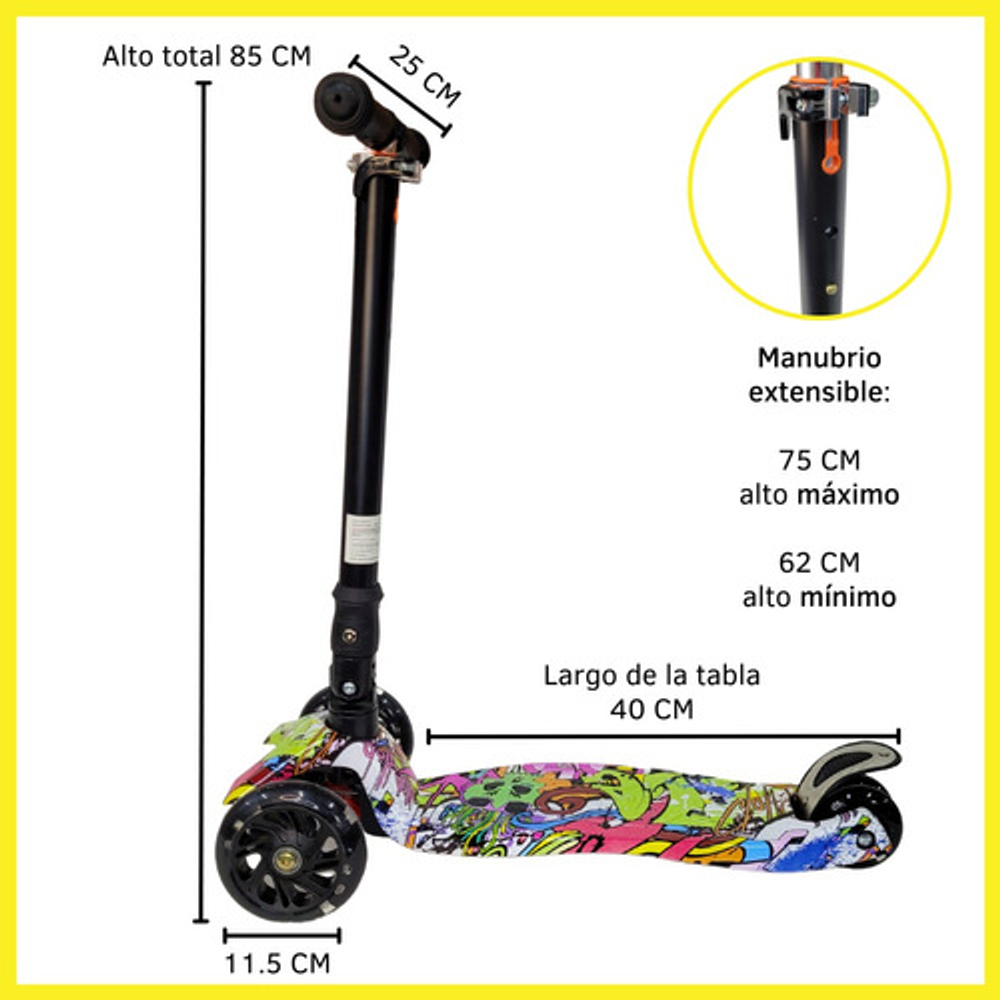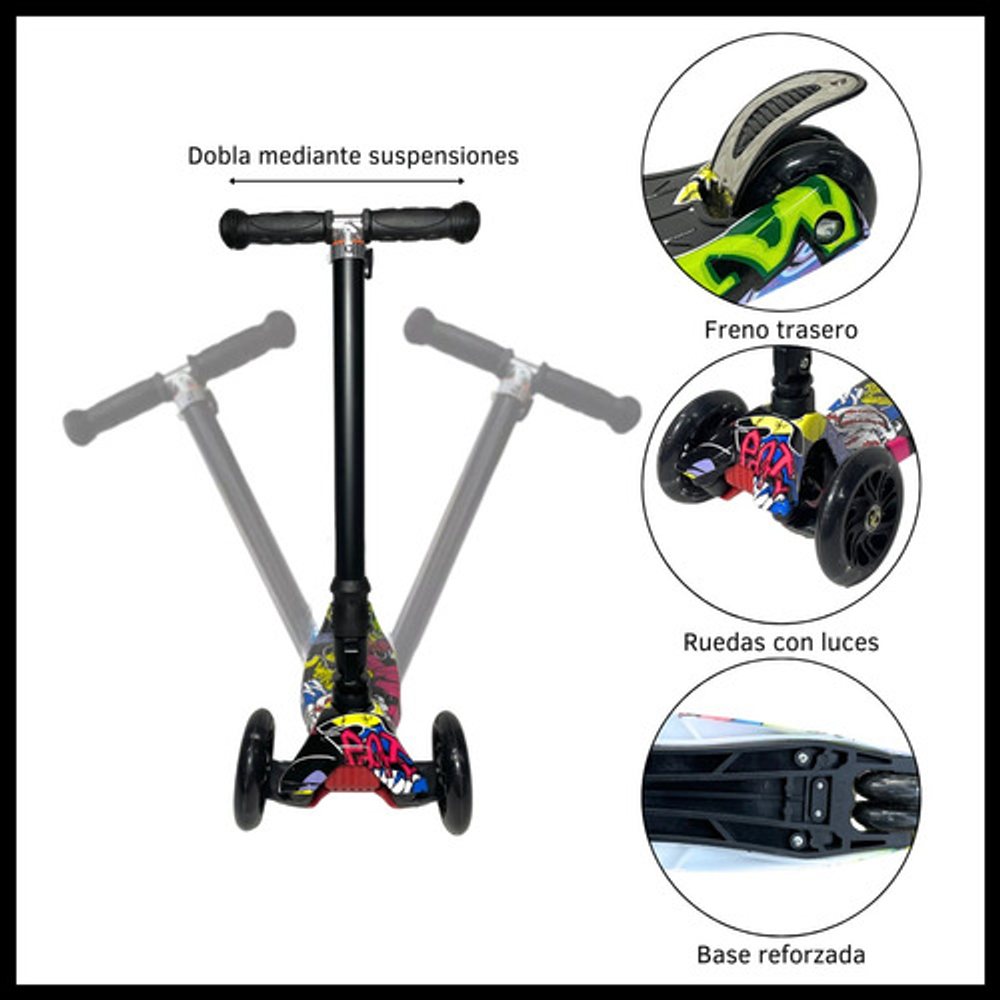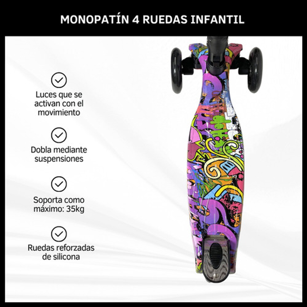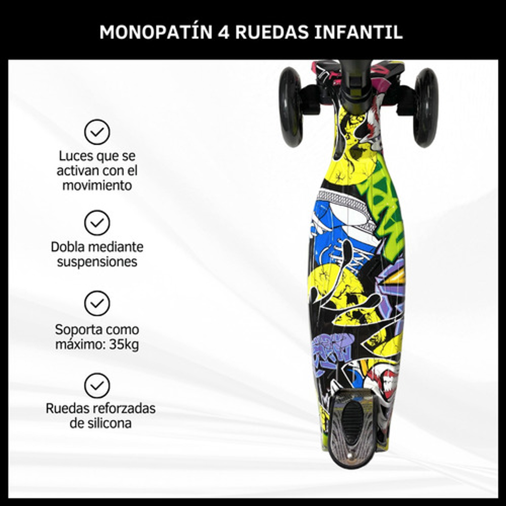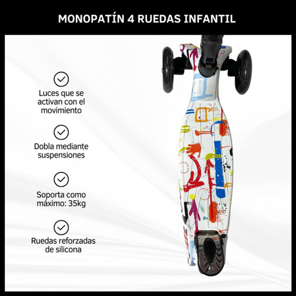 Características: • Luces en las ruedas que se activan con el movimiento lo que lo hace más divertido para los niños. • Material del deck: Plástico resistente. • Dobla mediante suspensiones que brindan una conducción más suave y cómoda, absorbiendo los impactos y vibraciones del terreno. • Su diseño plegable facilita el transporte y el almacenamiento del monopatín. • Posee cuatro ruedas, ideal para principiantes y niños pequeños. • Soporta entre 25 y 35 kg. • Altura regulable.