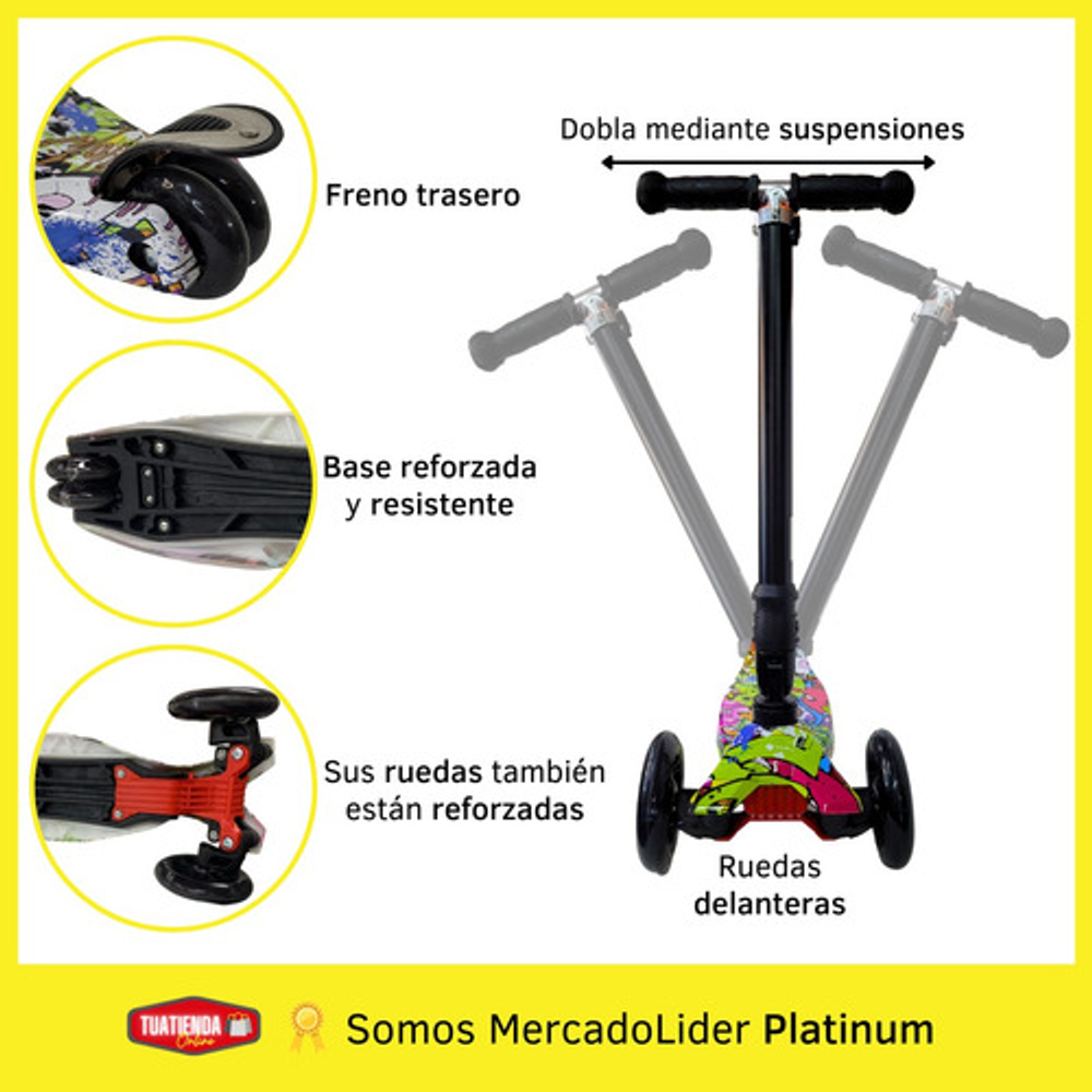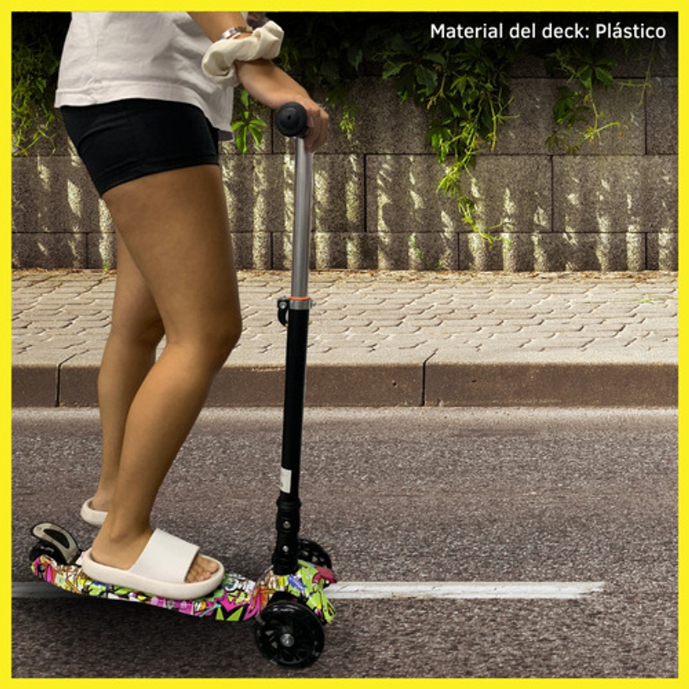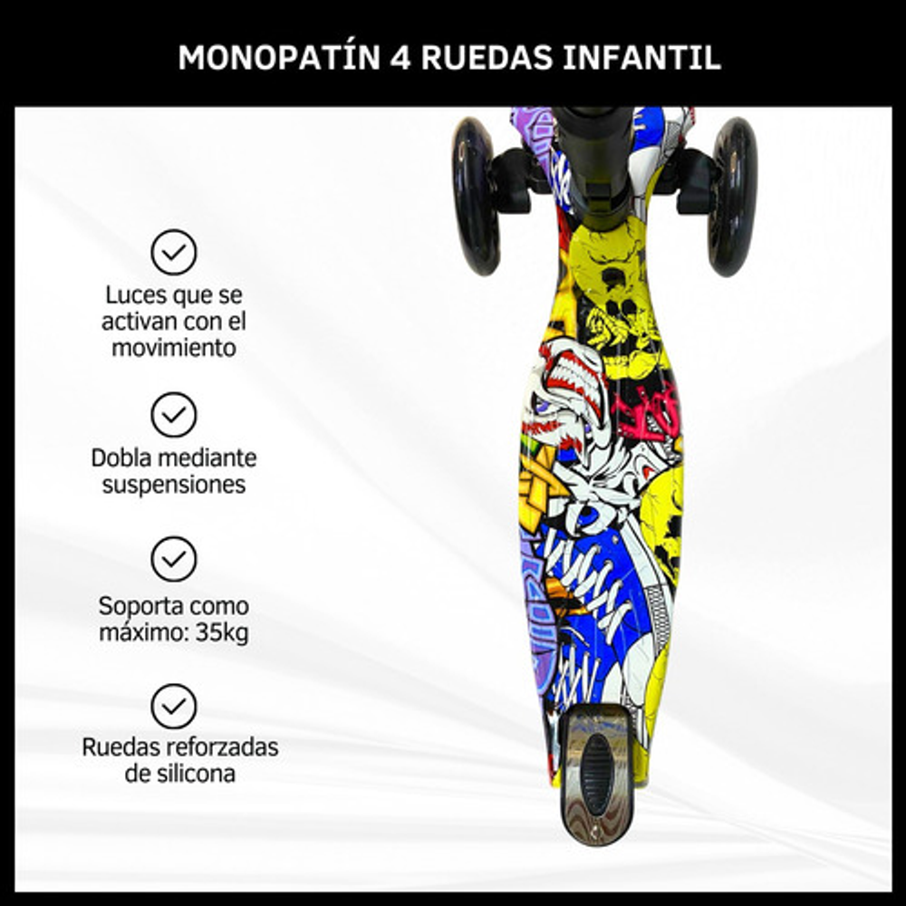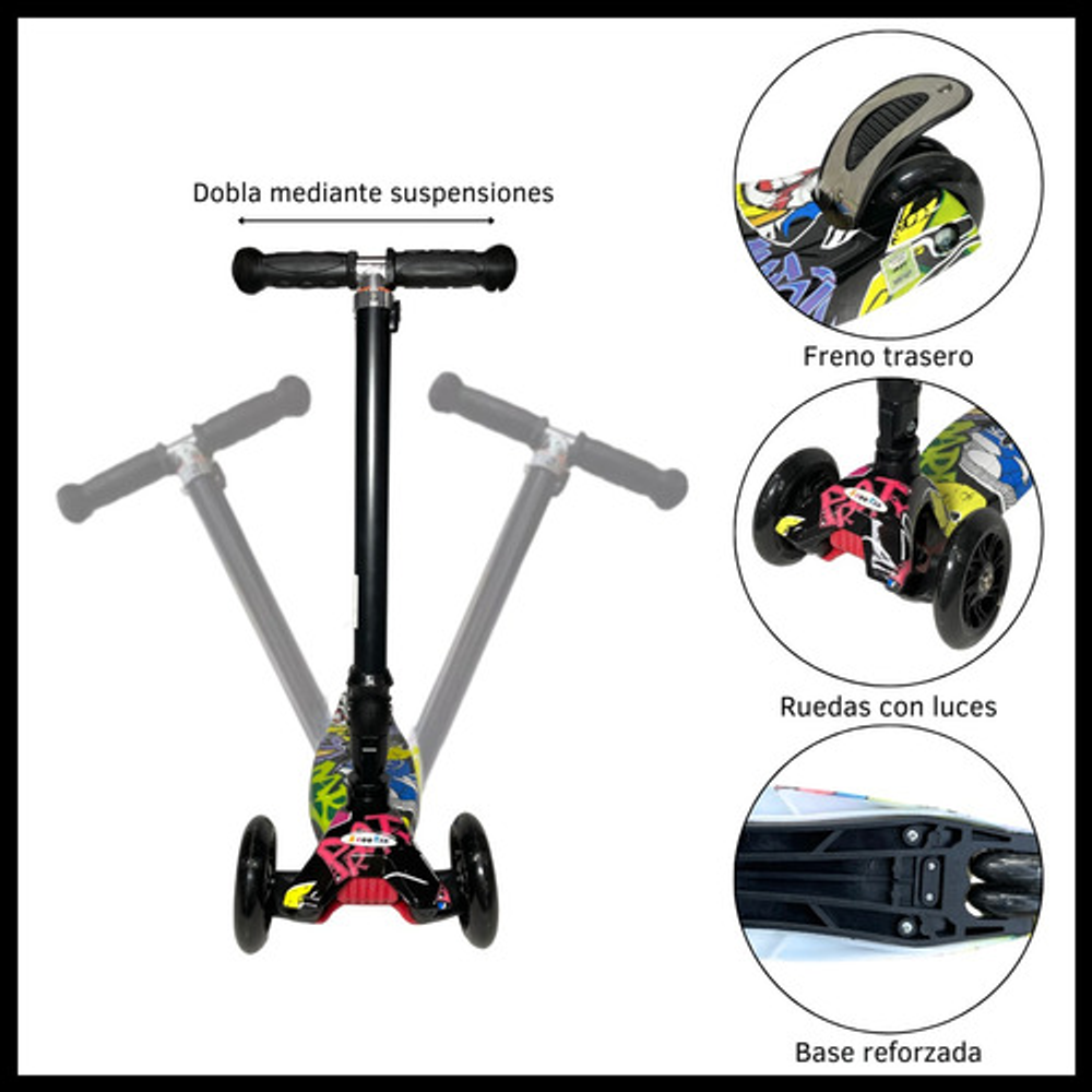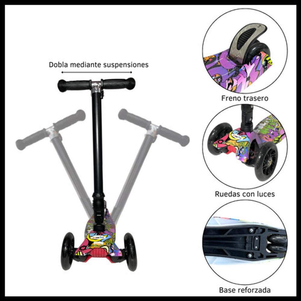 Características: • Luces en las ruedas que se activan con el movimiento lo que lo hace más divertido para los niños. • Material del deck: Plástico resistente. • Dobla mediante suspensiones que brindan una conducción más suave y cómoda, absorbiendo los impactos y vibraciones del terreno. • Su diseño plegable facilita el transporte y el almacenamiento del monopatín. • Posee cuatro ruedas, ideal para principiantes y niños pequeños. • Soporta entre 25 y 35 kg. • Altura regulable.