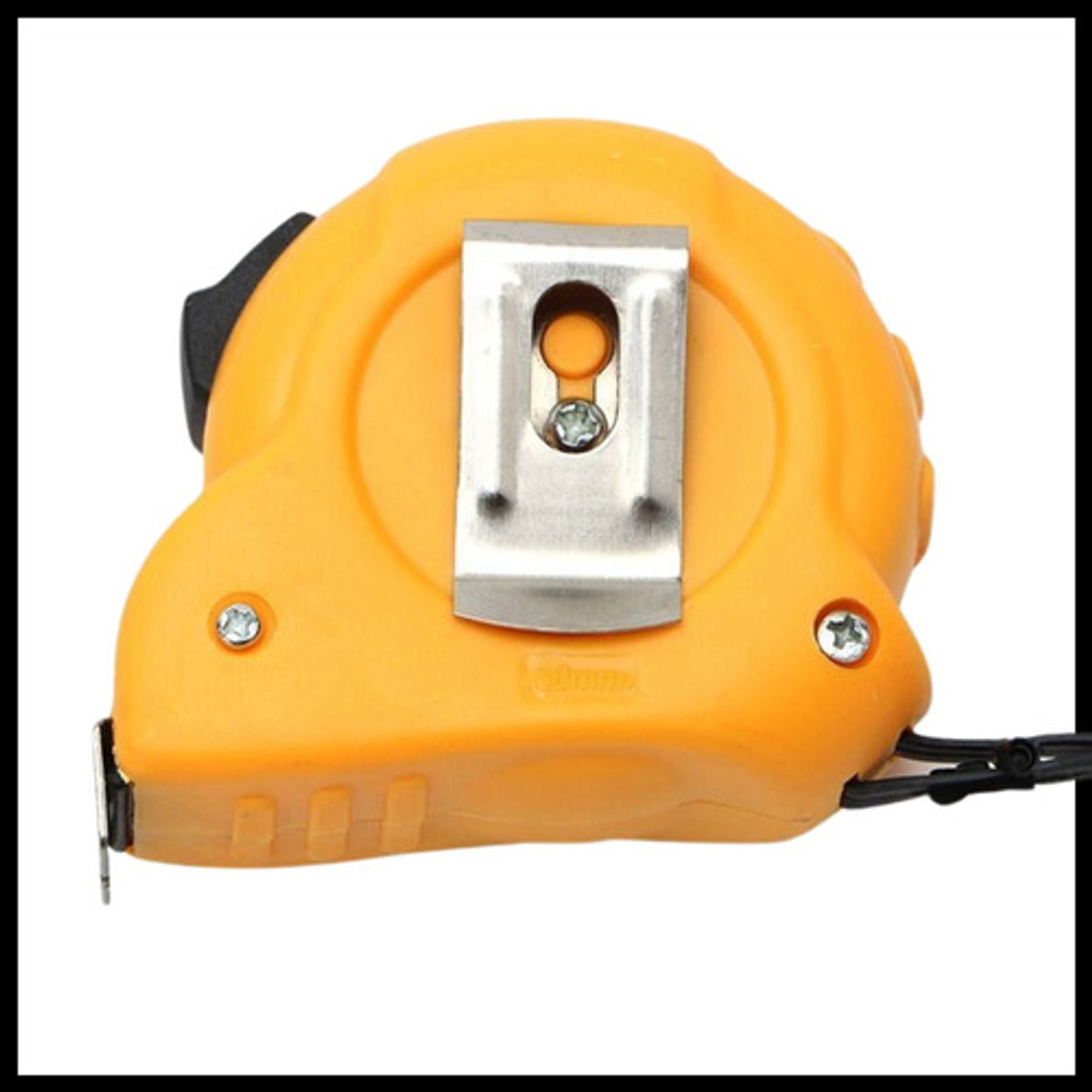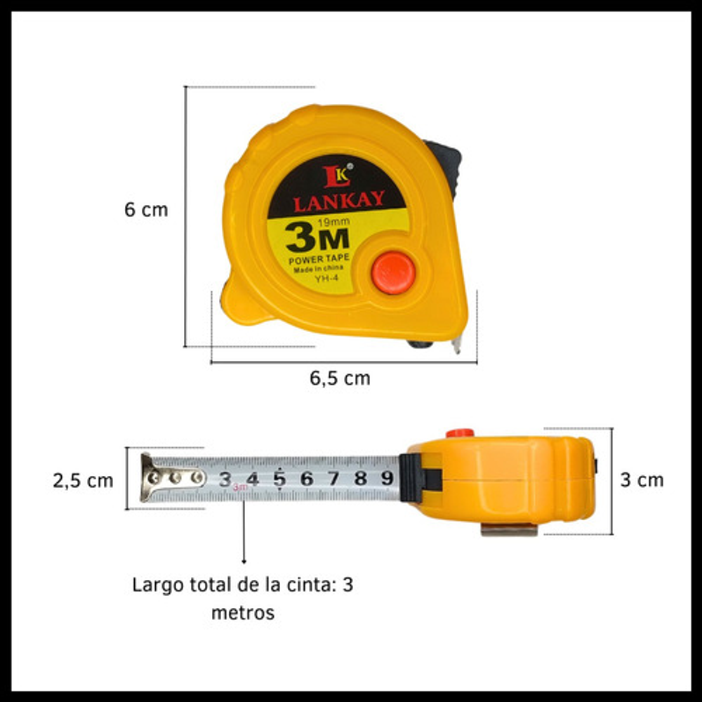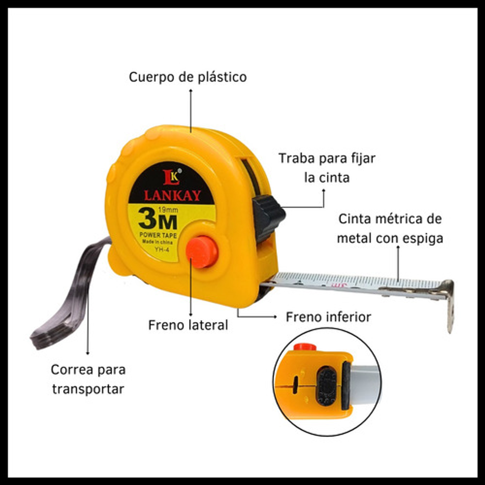 Características: • Clip de cinturón. • Sistema de freno triple. • Fabricada en plástico y metal. • Correa para mejor transporte. • Unidad de medida en centímetros. • Espiga de acero para atrapar el borde del objeto que se desea medir