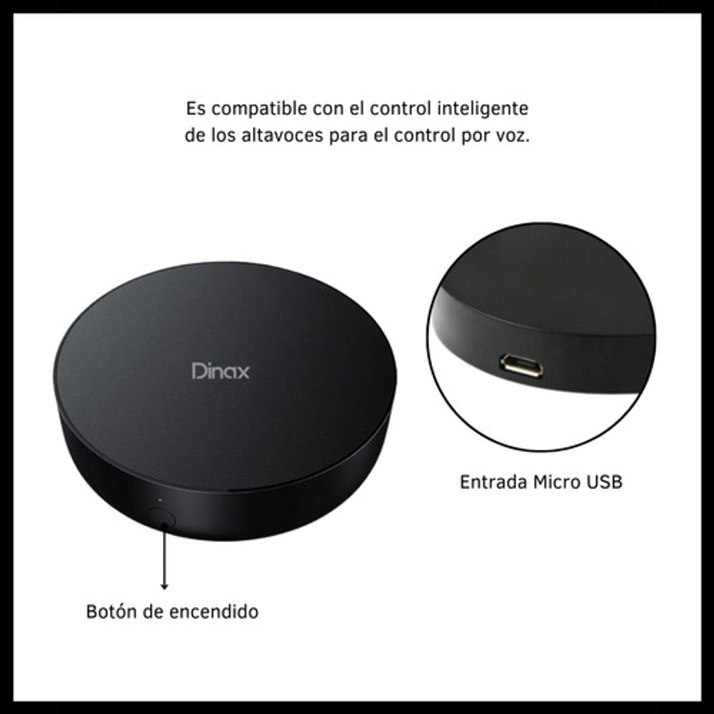 Características: -Se puede controlar de forma inteligente a través de la interfaz de la aplicación móvil. -Soporta aplicación remota para teléfono o control de TV, STB OTT Box, DVD, ventilar y otros artefactos eléctricos. -Soporta controles de voz de terceros. -Incluye QR para instalar aplicación. -Larga distancia de control. -360º onmi-direccional.