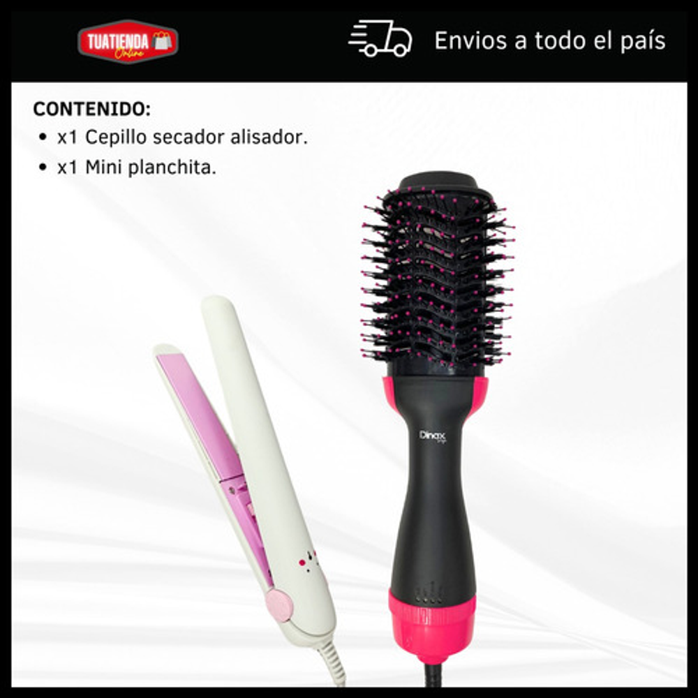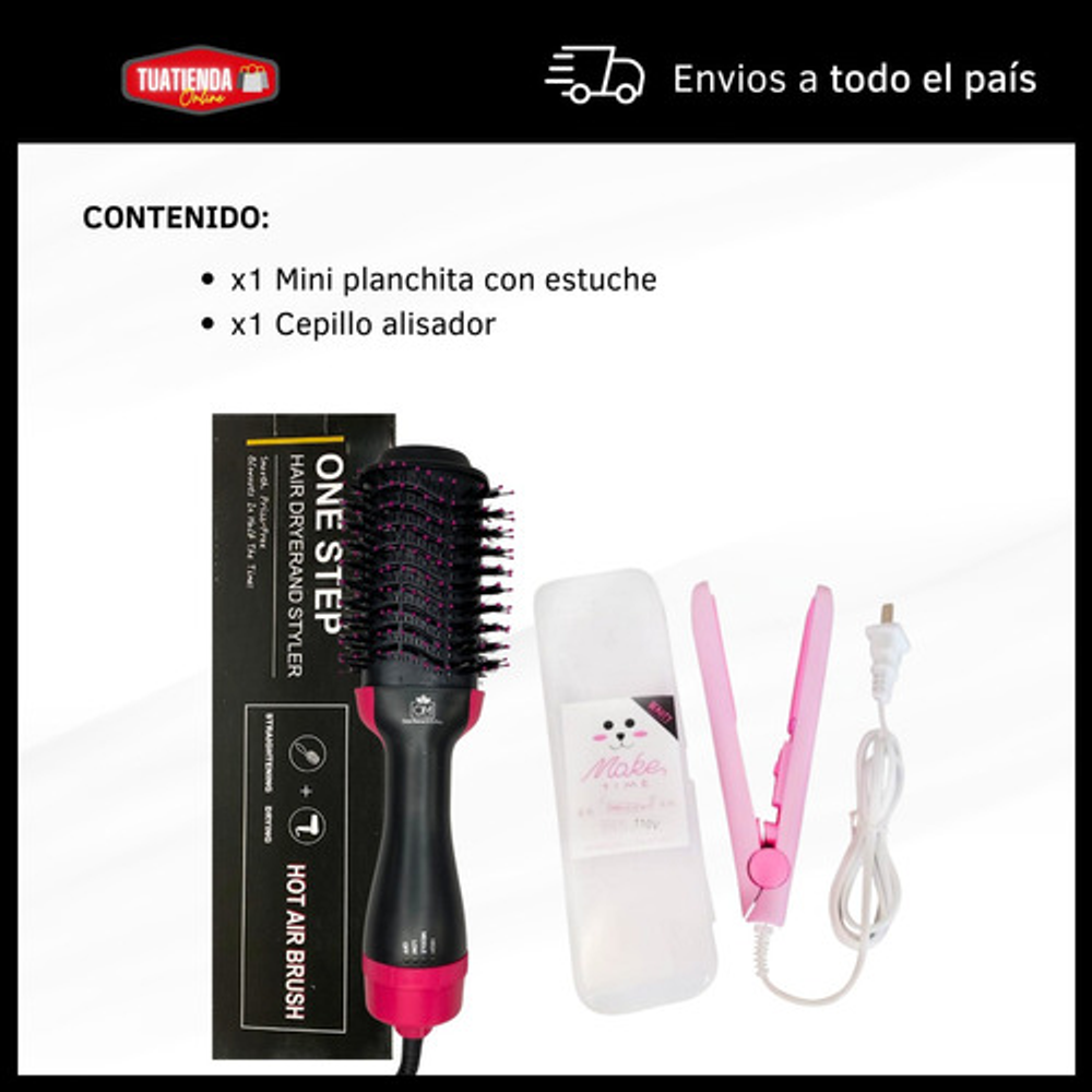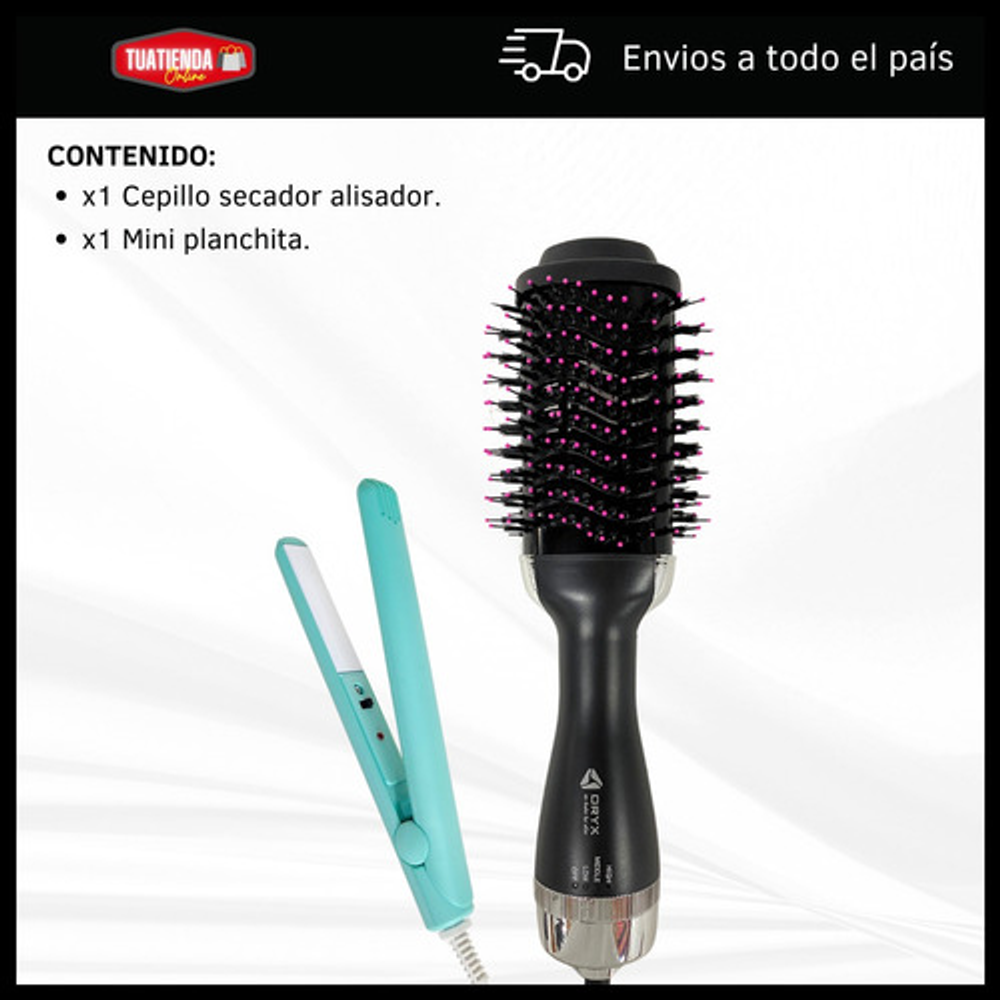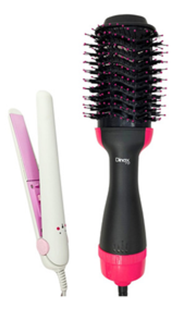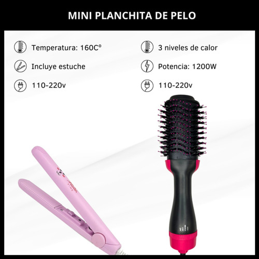 *Con este combo, podrás arreglar tu cabello al instante. El cepillo secador te permite moldear y secar tu pelo a la vez, mientras que la mini planchita es ideal para los toques finales.