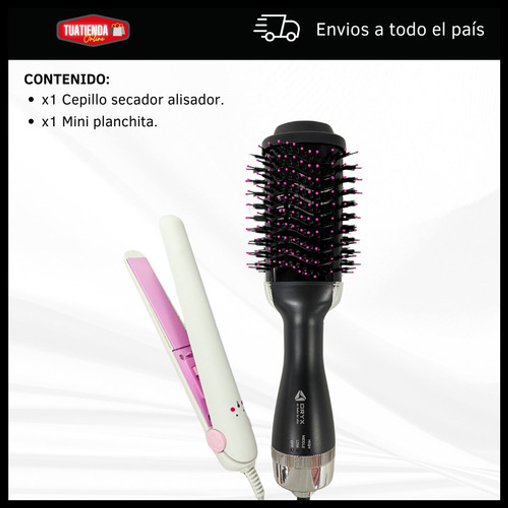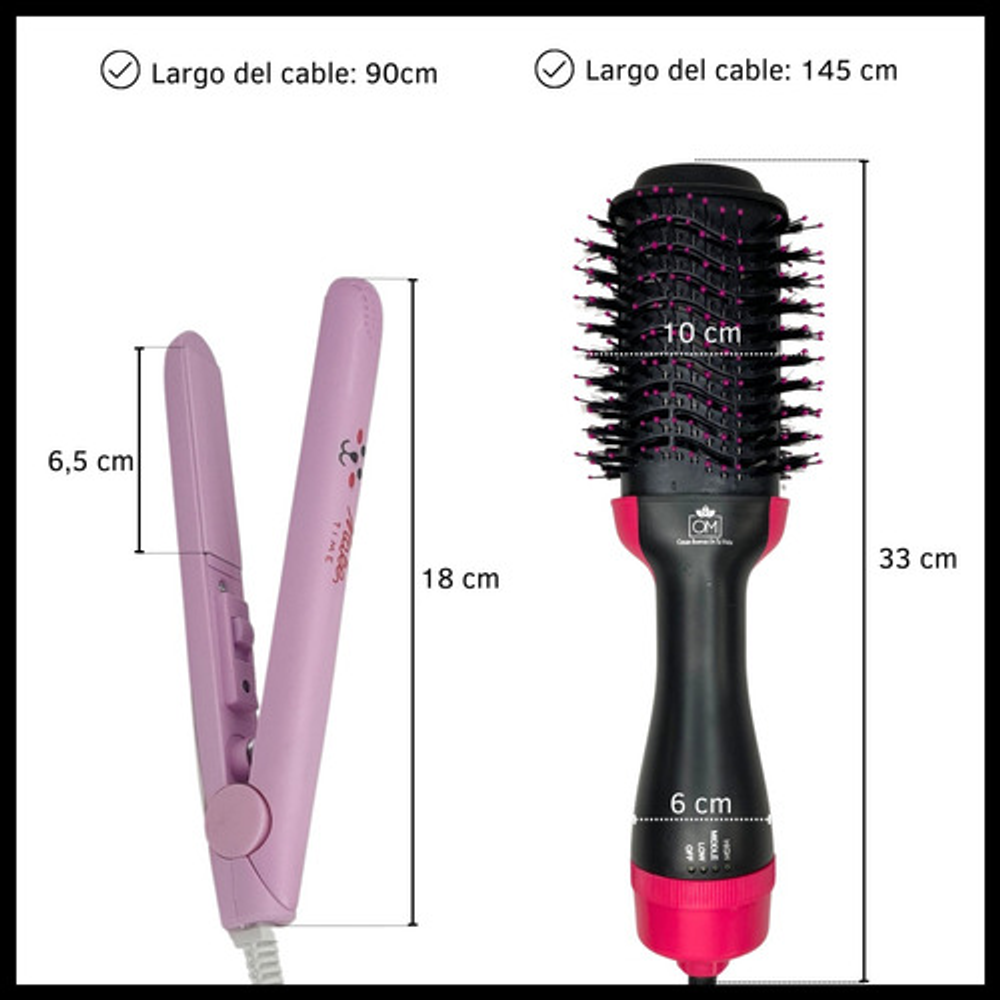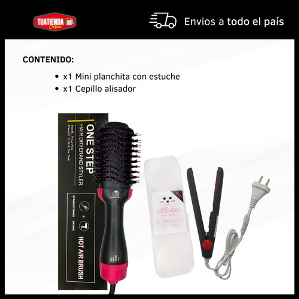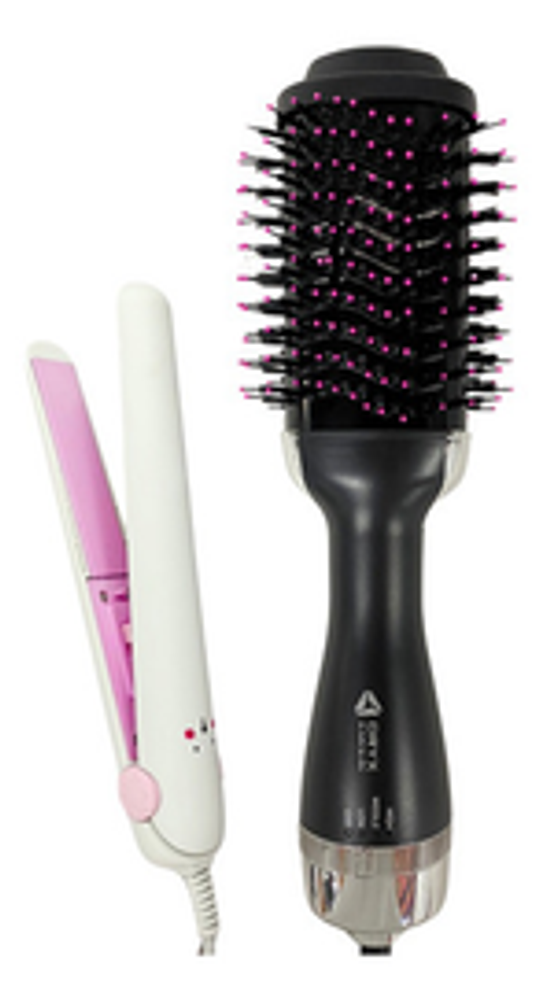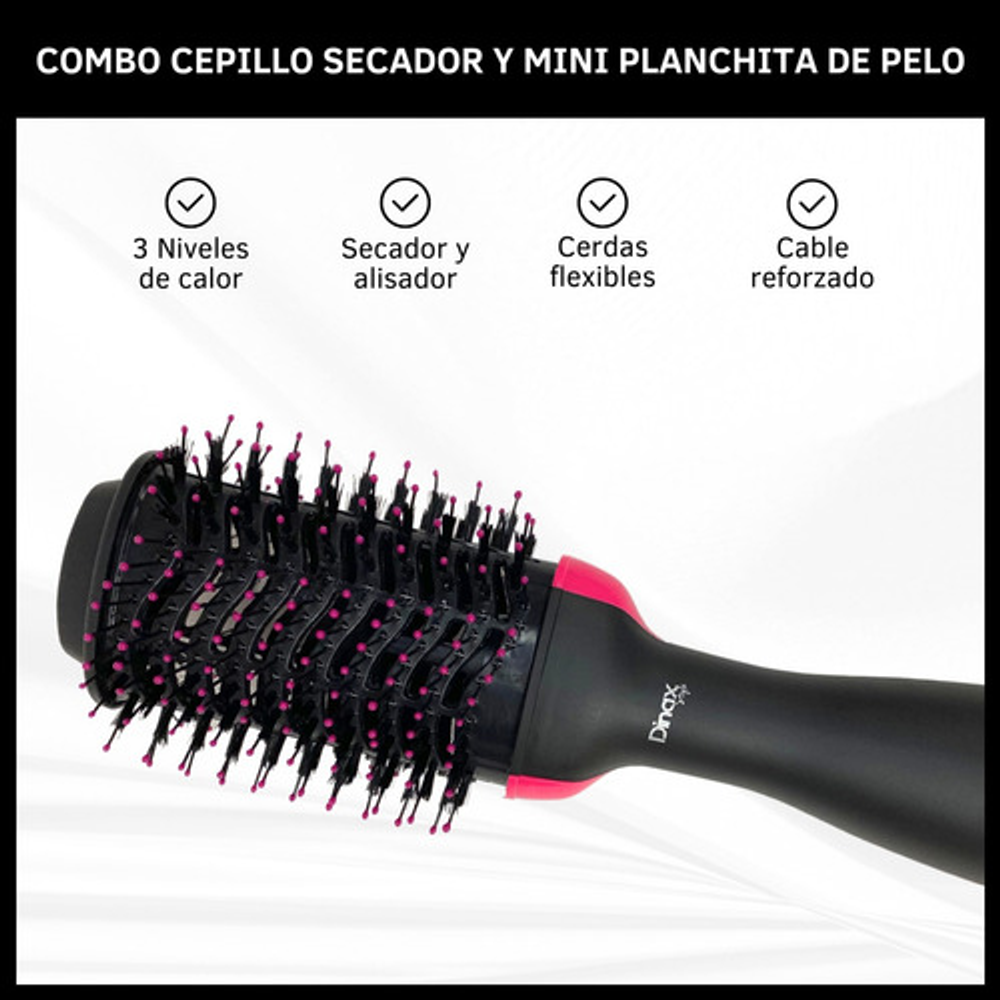 *Con este combo, podrás arreglar tu cabello al instante. El cepillo secador te permite moldear y secar tu pelo a la vez, mientras que la mini planchita es ideal para los toques finales.