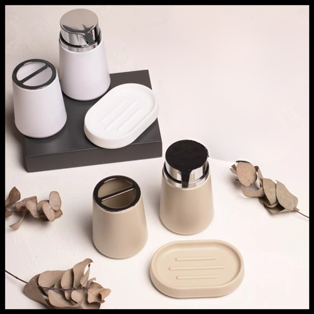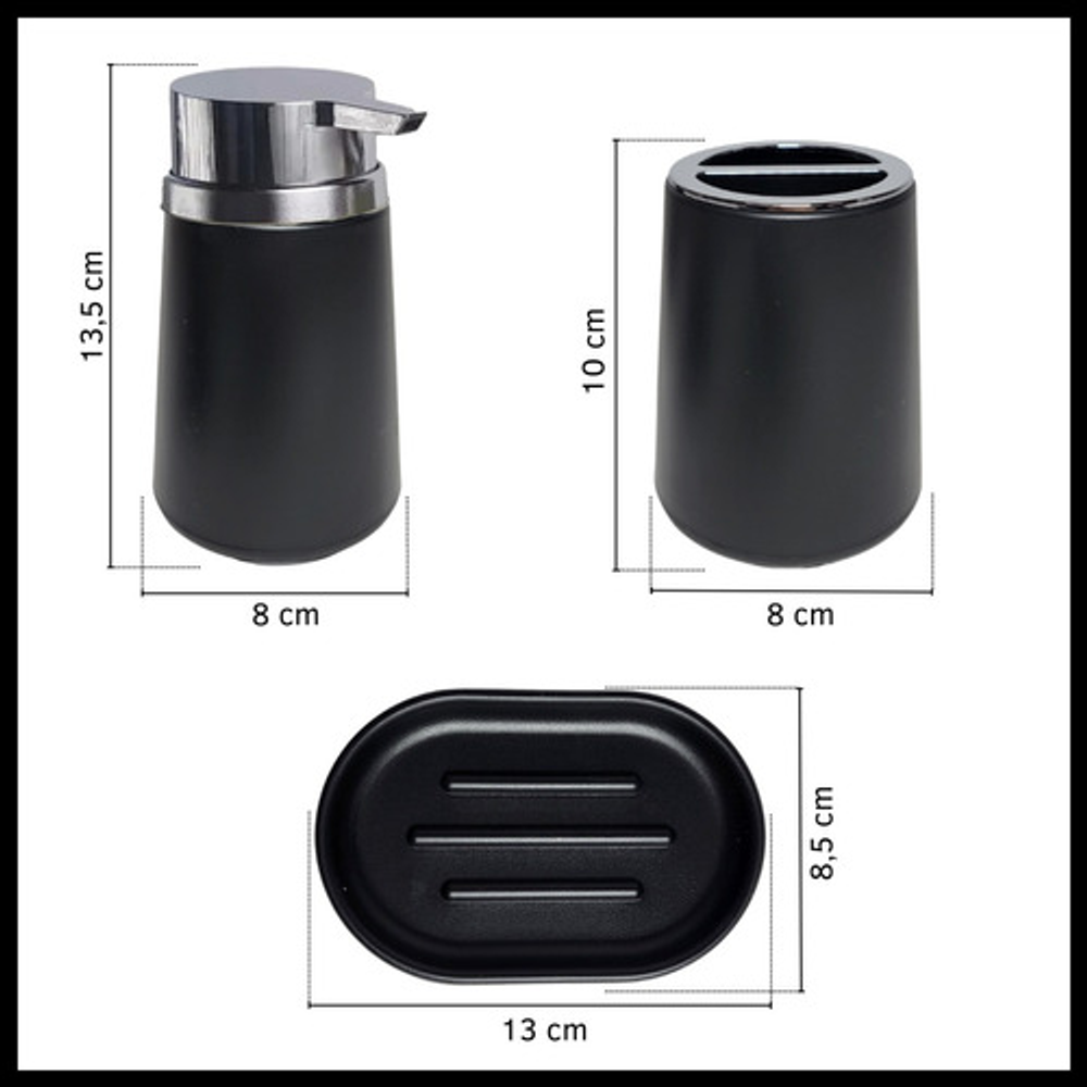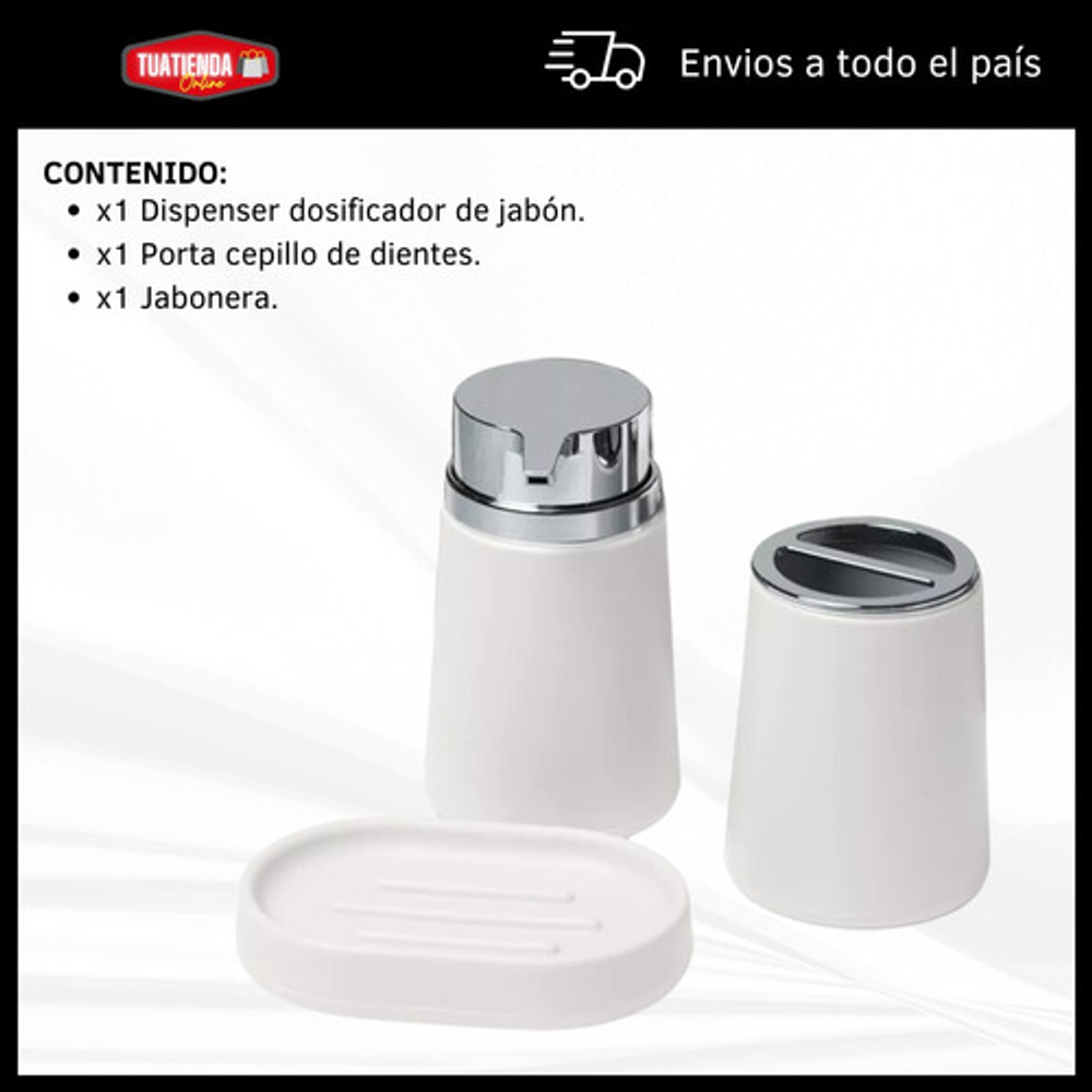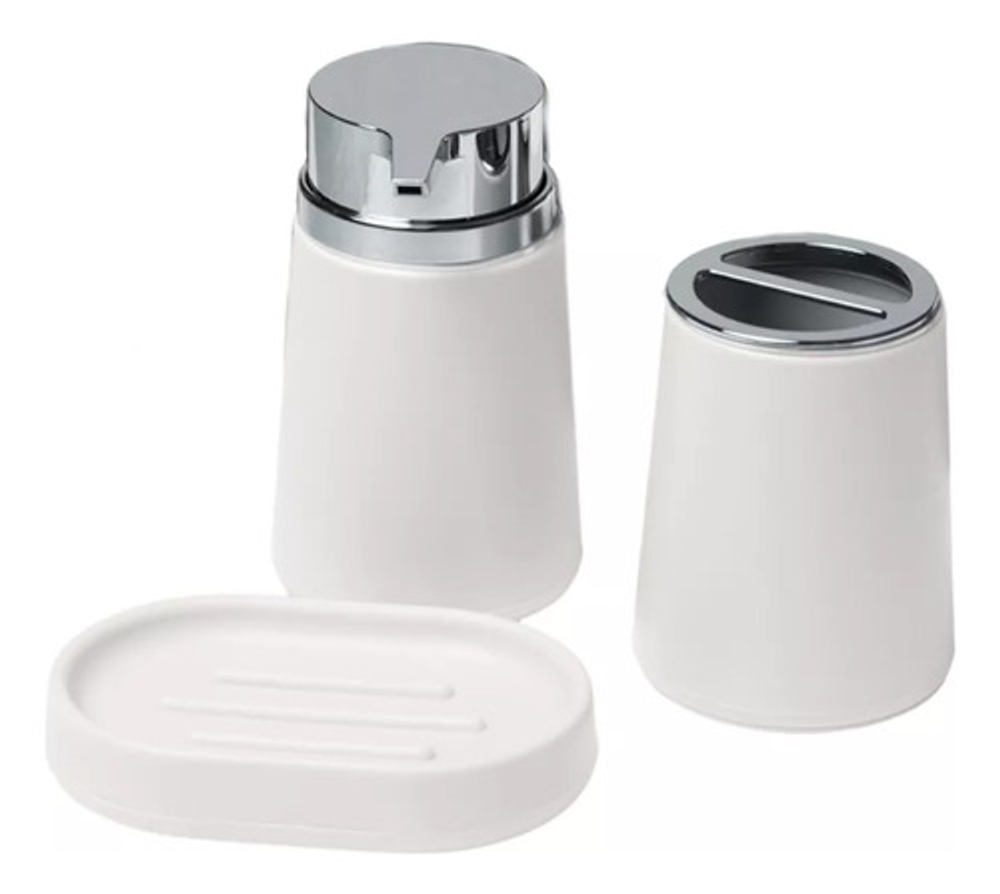 Incluye: • x1 Jabonera. • x1 Dispensador de jabón. • x1 Vaso porta cepillo de dientes.