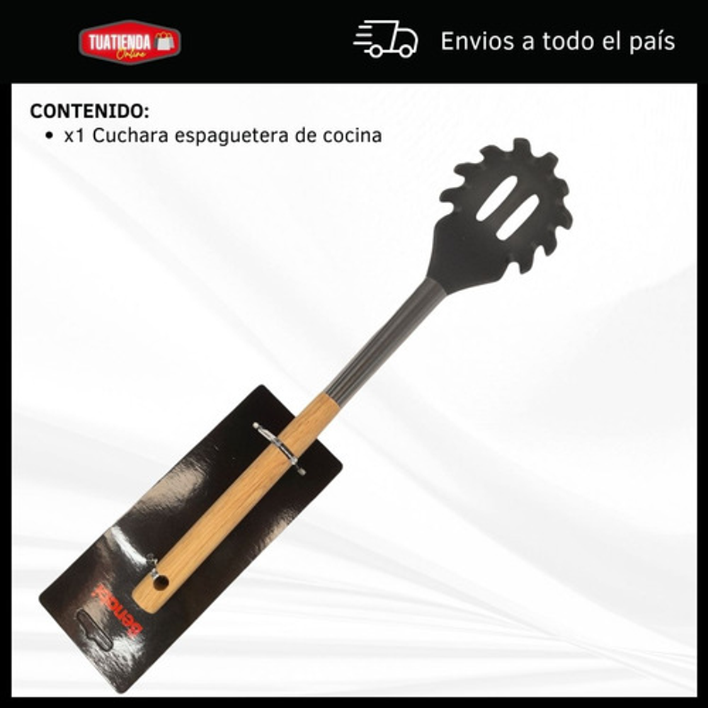 CARACTERISTICAS: -Utensilio de silicona -No daña ni raya la superficie de las ollas -Contiene mango de acero/madera -Cuenta con orificio para colgar -No absorbe olores ni sabores