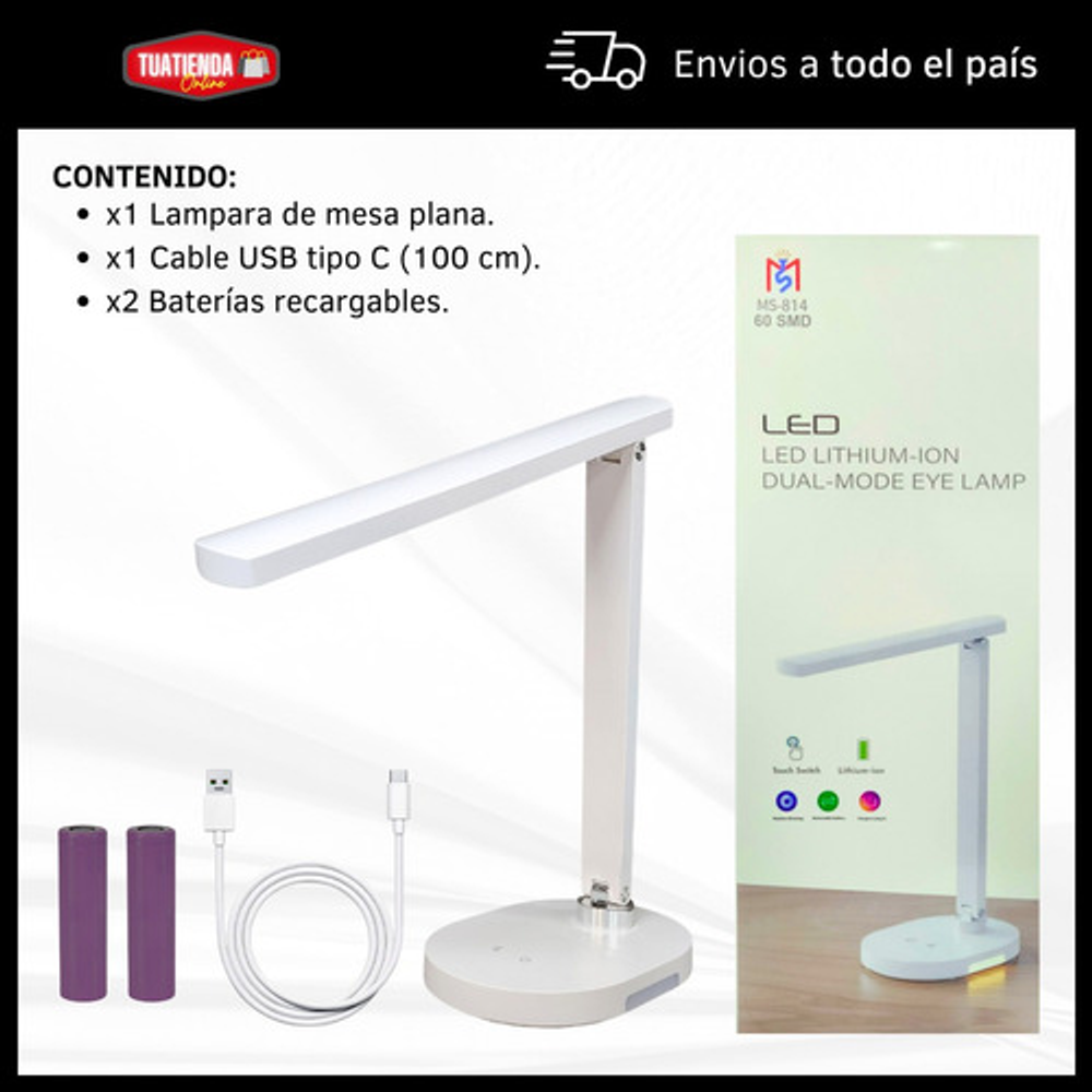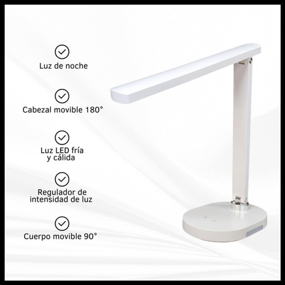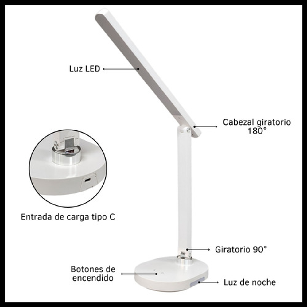Características: • Carga USB. • Luz de noche. • 3 modos de luz. • Interruptor táctil. • Batería recargable. • Material de plástico. • Regulador de intensidad. • Cuerpo movible 90° vertical. • Luz LED cálida, natural y fría. • Cabezal movible 180° (movible 180° vertical/horizontal). • Para regular la intensidad mantener apretado el botón de "ON/OFF".
