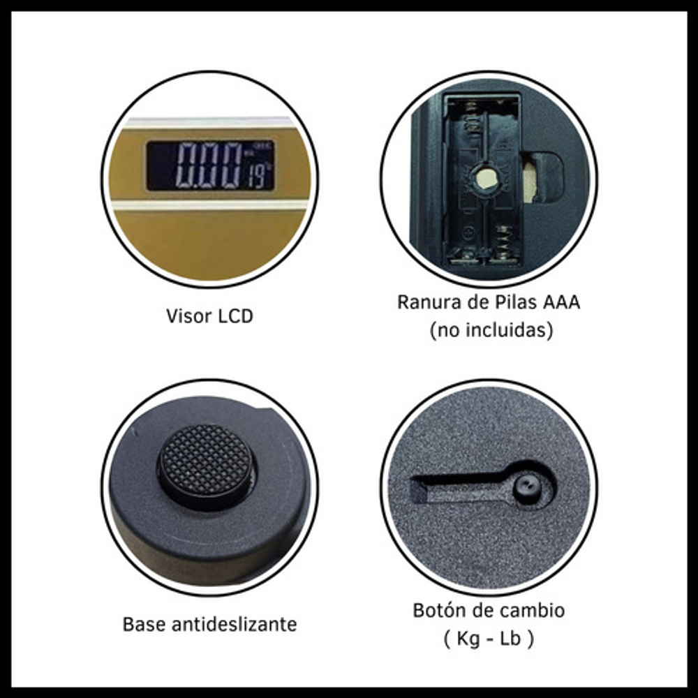 Unidad: Kg / Lb, permite medir el peso en diferentes unidades según las preferencias.